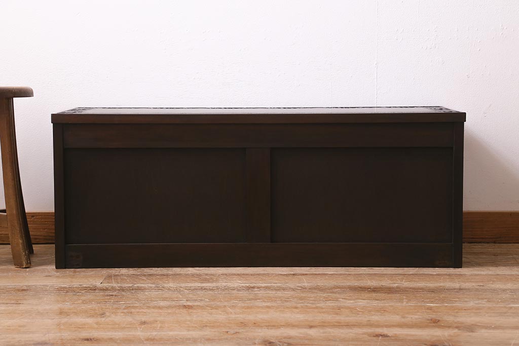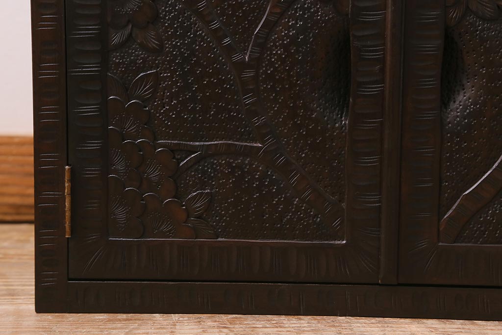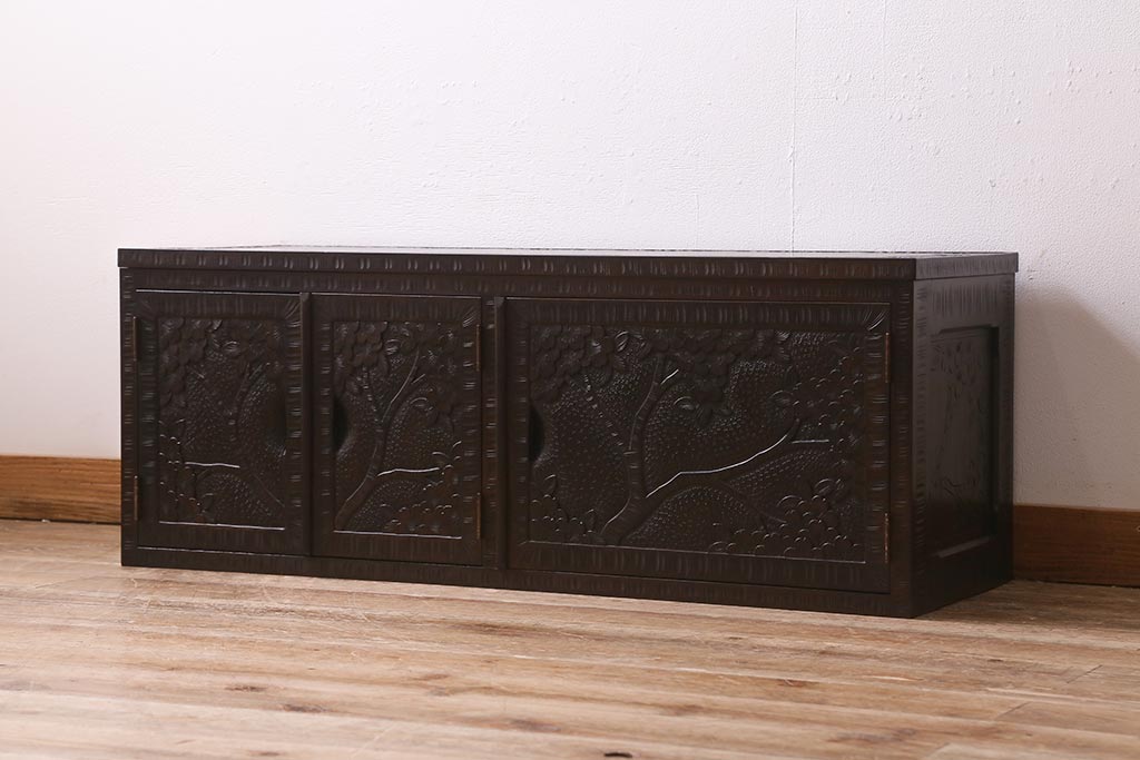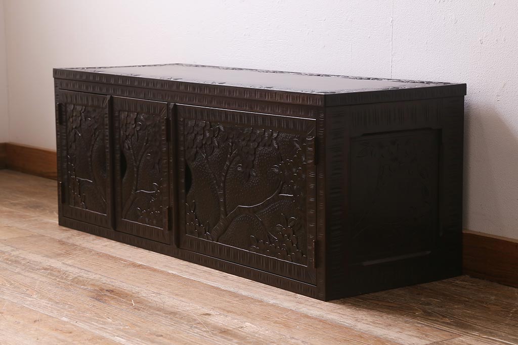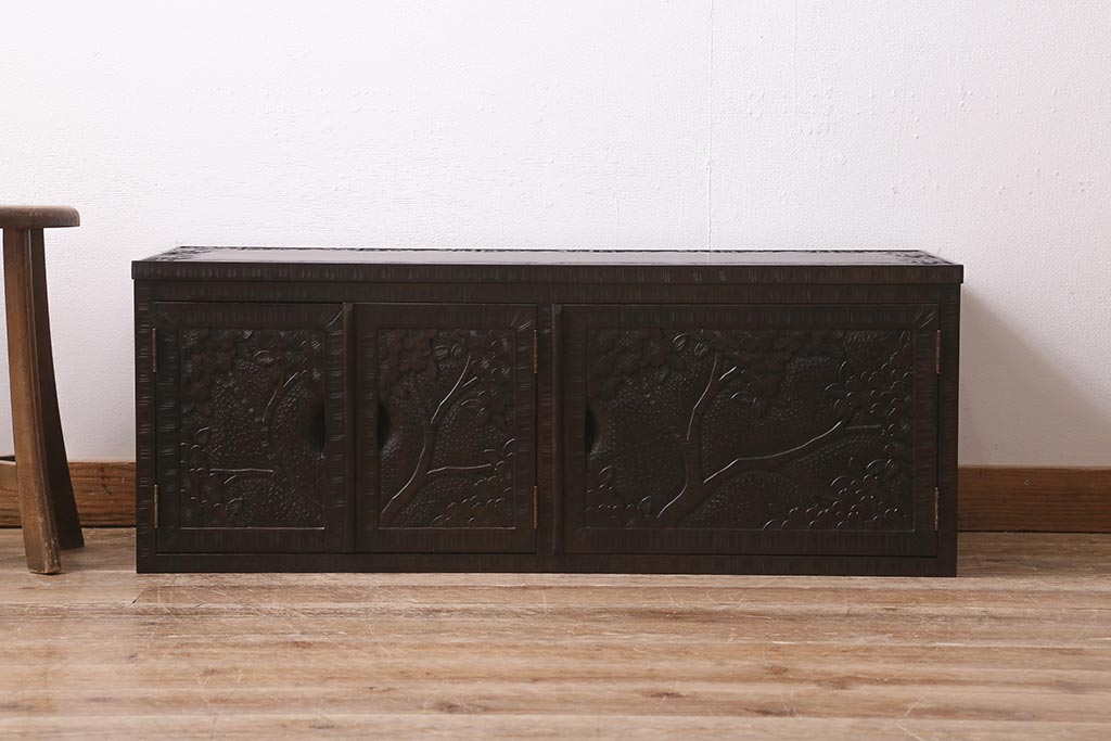 民芸家具 > 中古 美品 軽井沢彫り レアな横長サイズ!美しい桜の意匠が目を惹く戸棚(収納棚、キャビネット、テレビ台、ローボード)(R-043503)