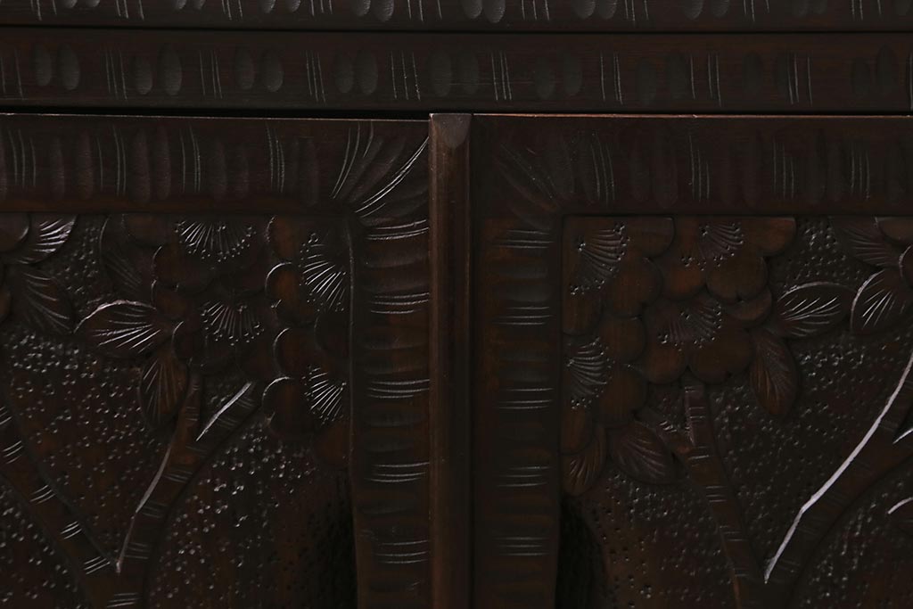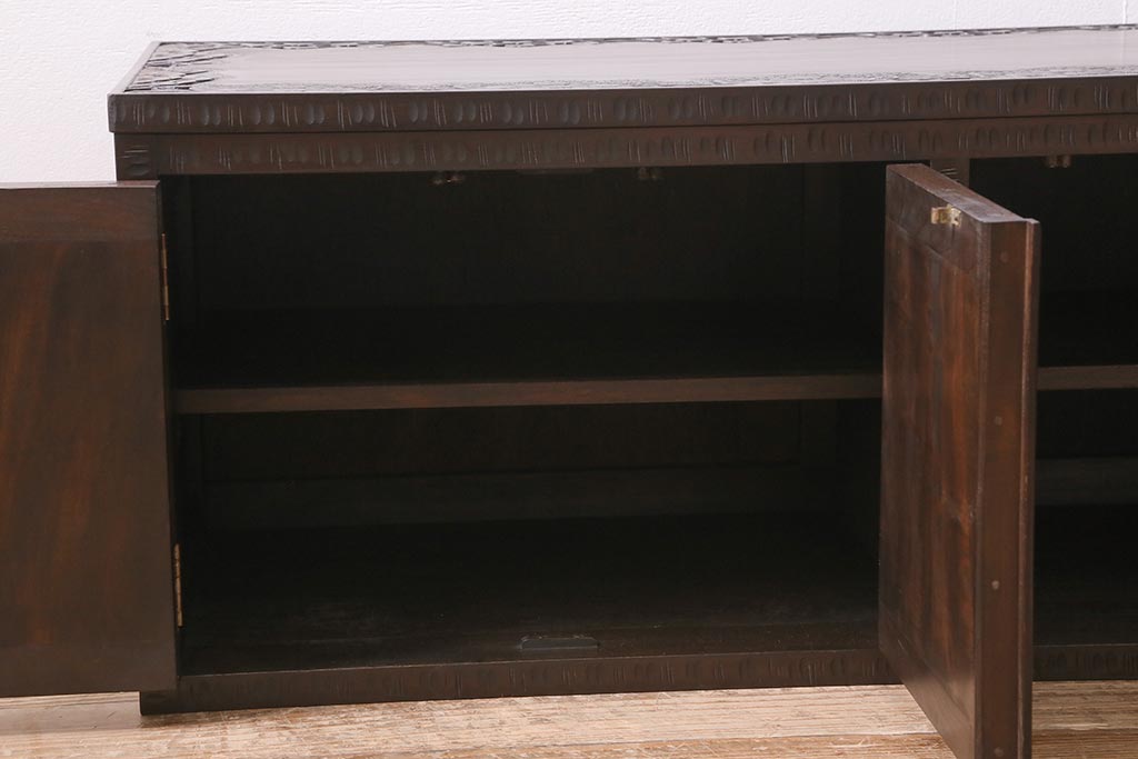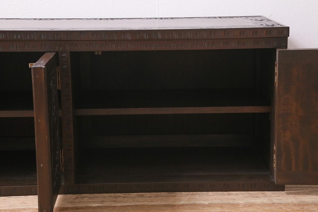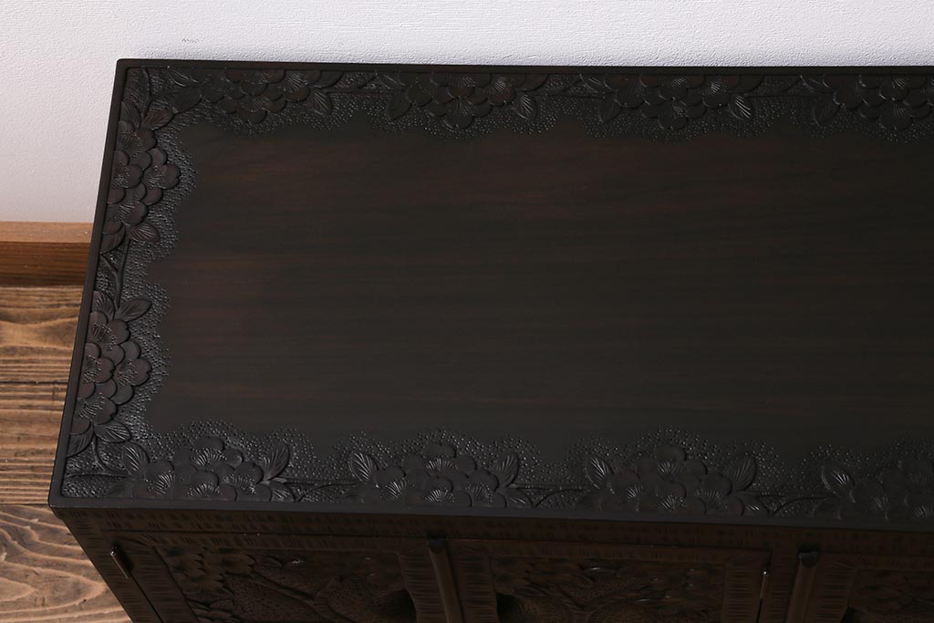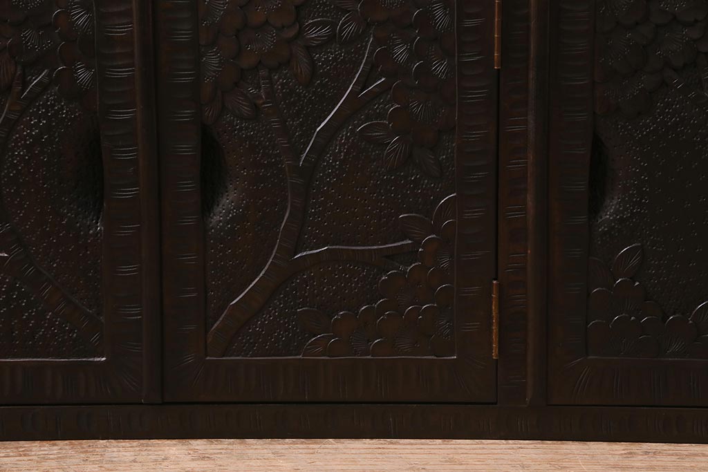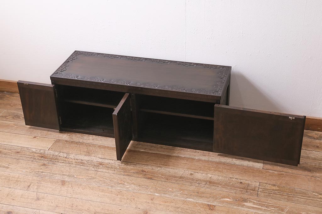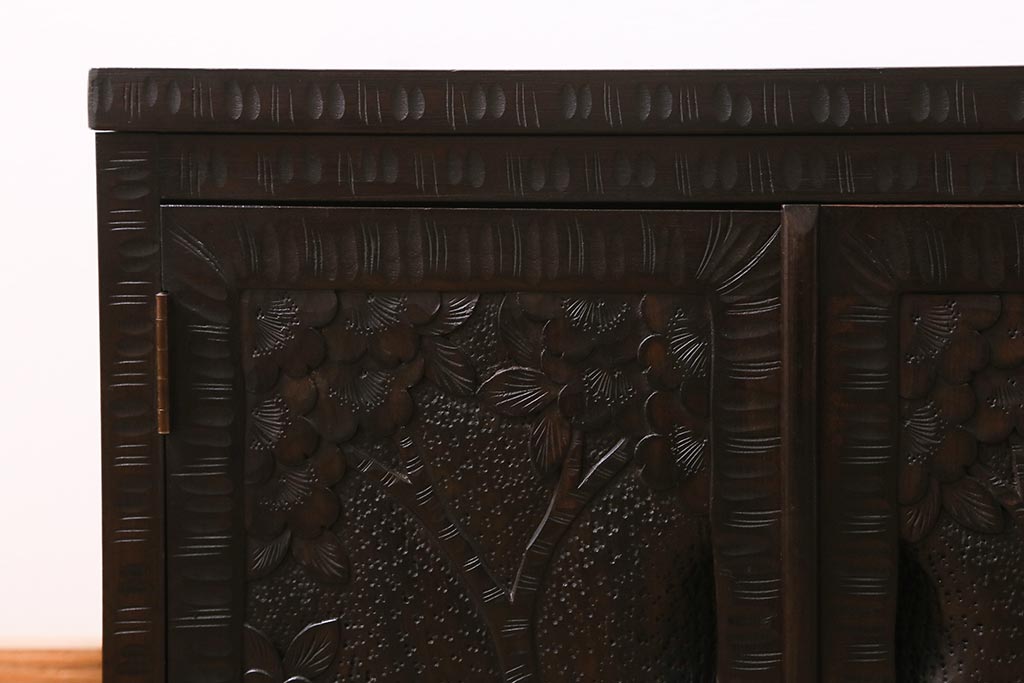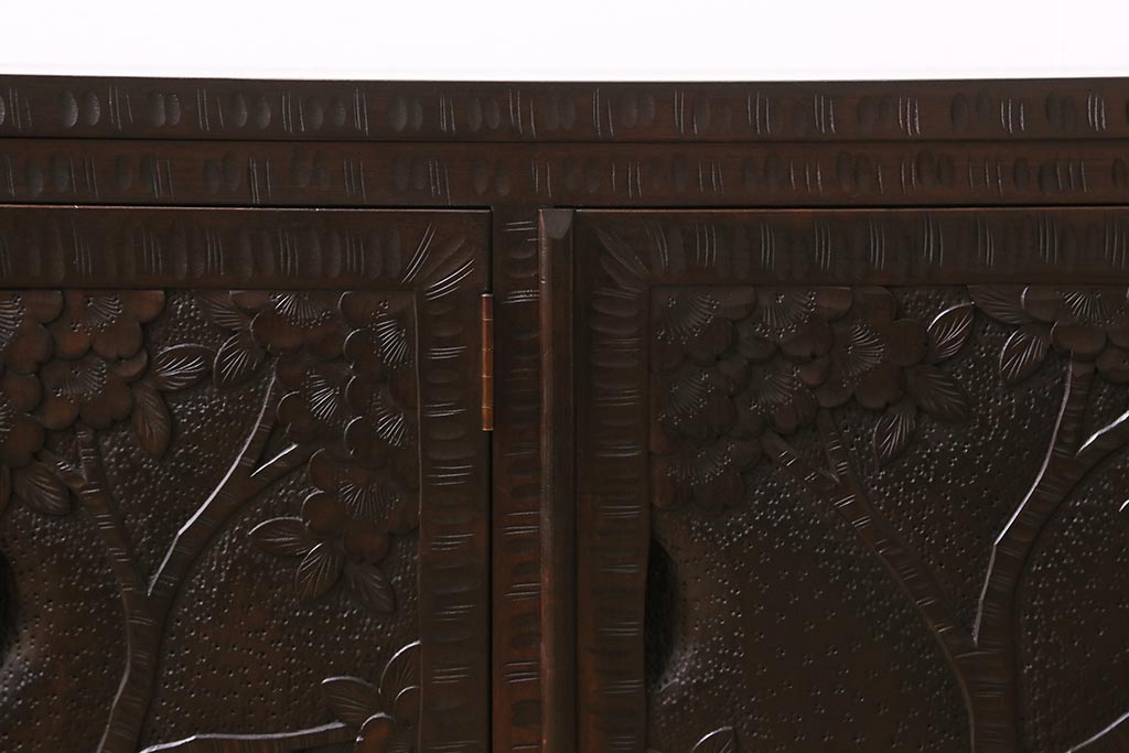 キャビネット・戸棚> テレビ台・ローボード > 中古 美品 軽井沢彫り レアな横長サイズ!美しい桜の意匠が目を惹く戸棚(収納棚、キャビネット、テレビ台、ローボード)(R-043503)