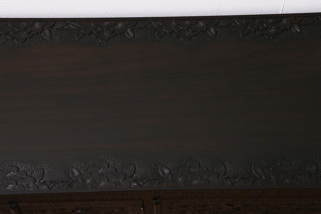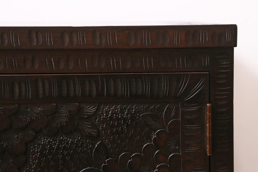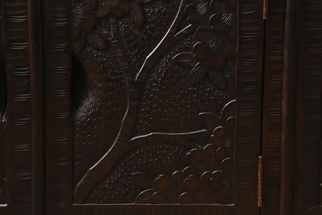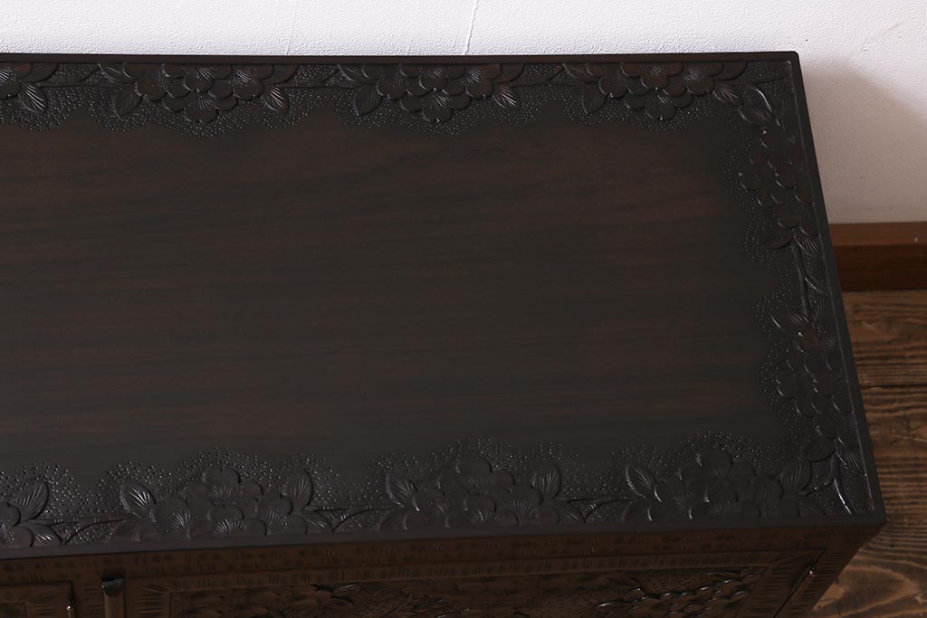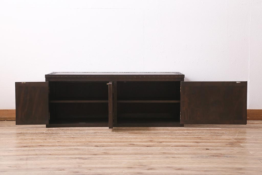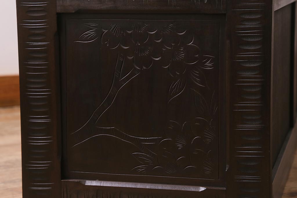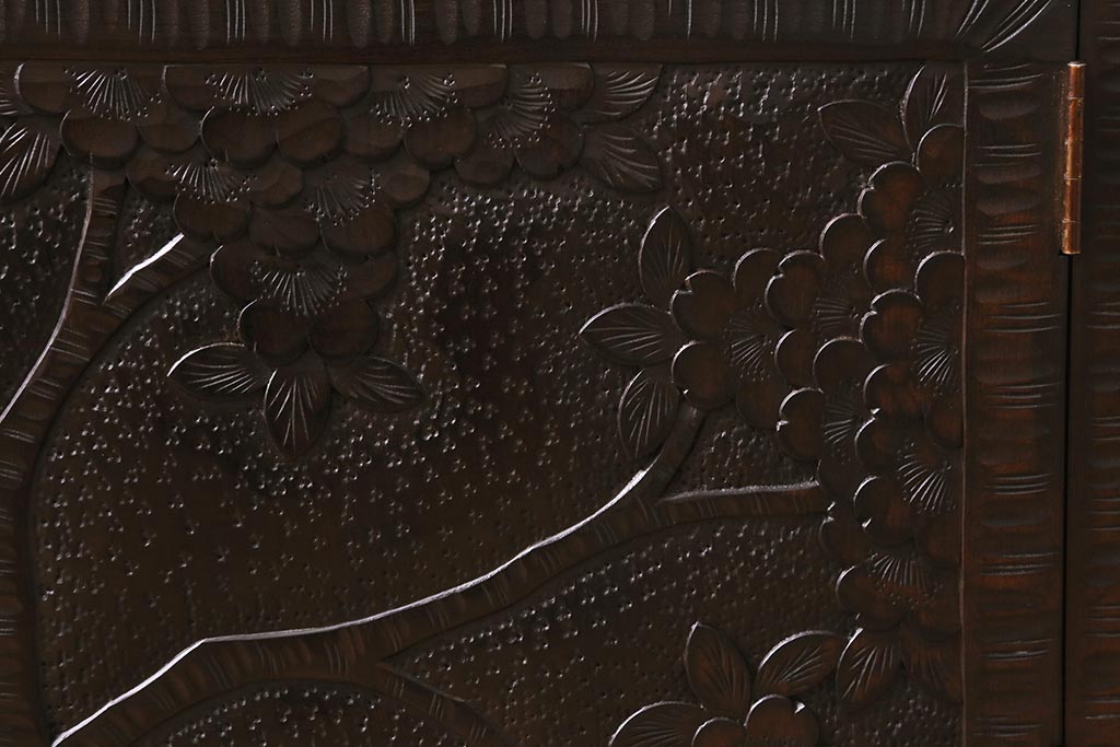 キャビネット・戸棚> テレビ台・ローボード > 中古 美品 軽井沢彫り レアな横長サイズ!美しい桜の意匠が目を惹く戸棚(収納棚、キャビネット、テレビ台、ローボード)(R-043503)