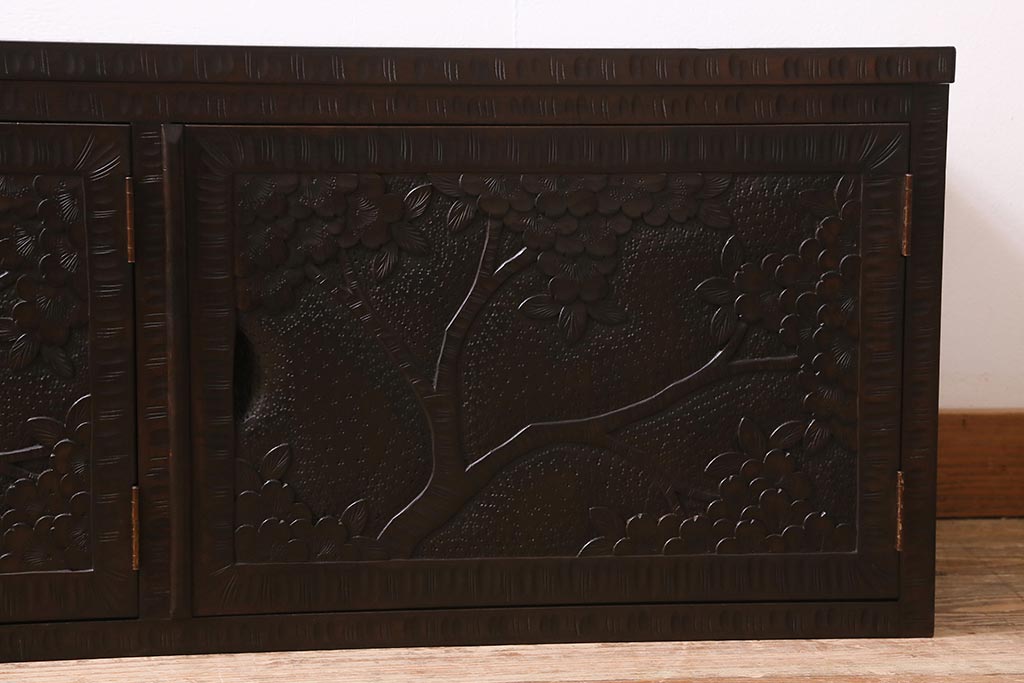 中古 美品 軽井沢彫り レアな横長サイズ!美しい桜の意匠が目を惹く戸棚(収納棚、キャビネット、テレビ台、ローボード)(R-043503)