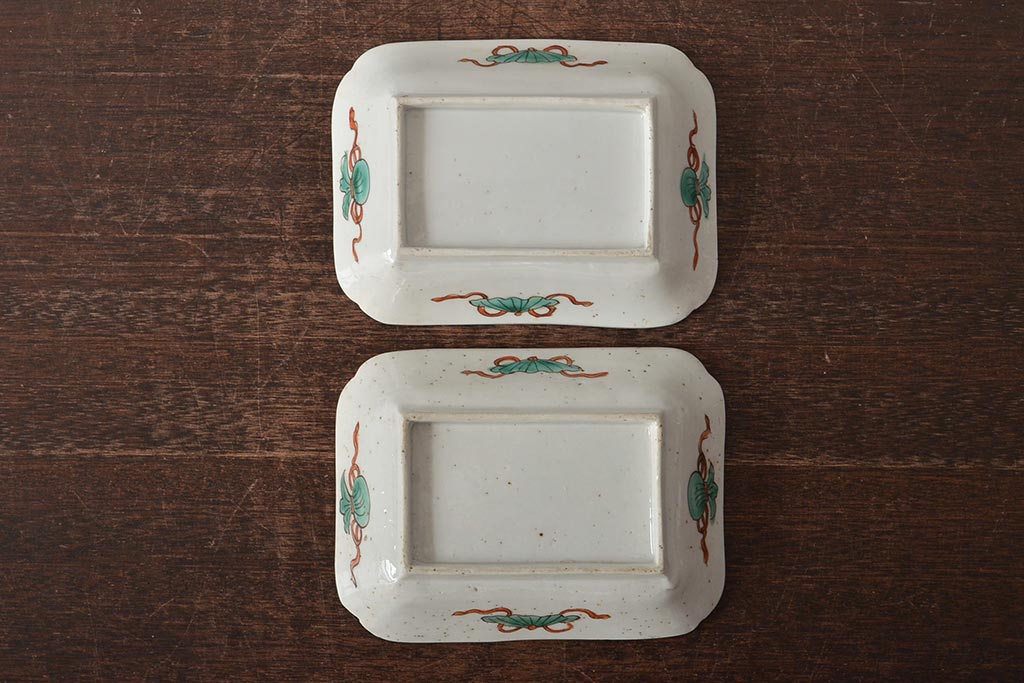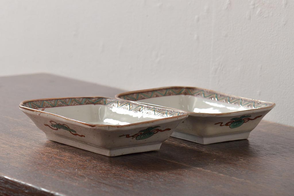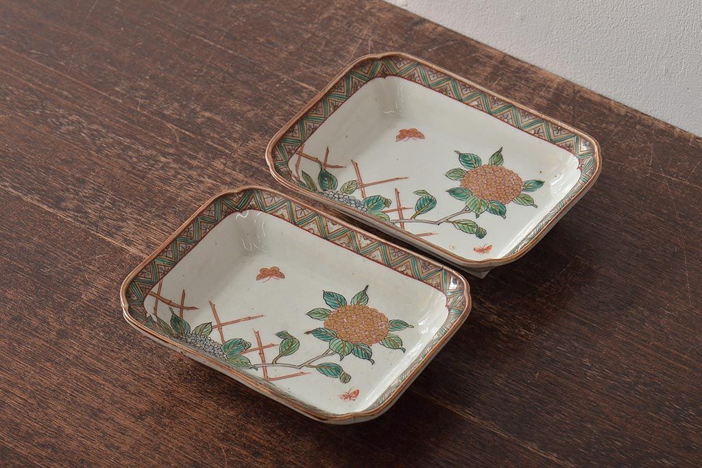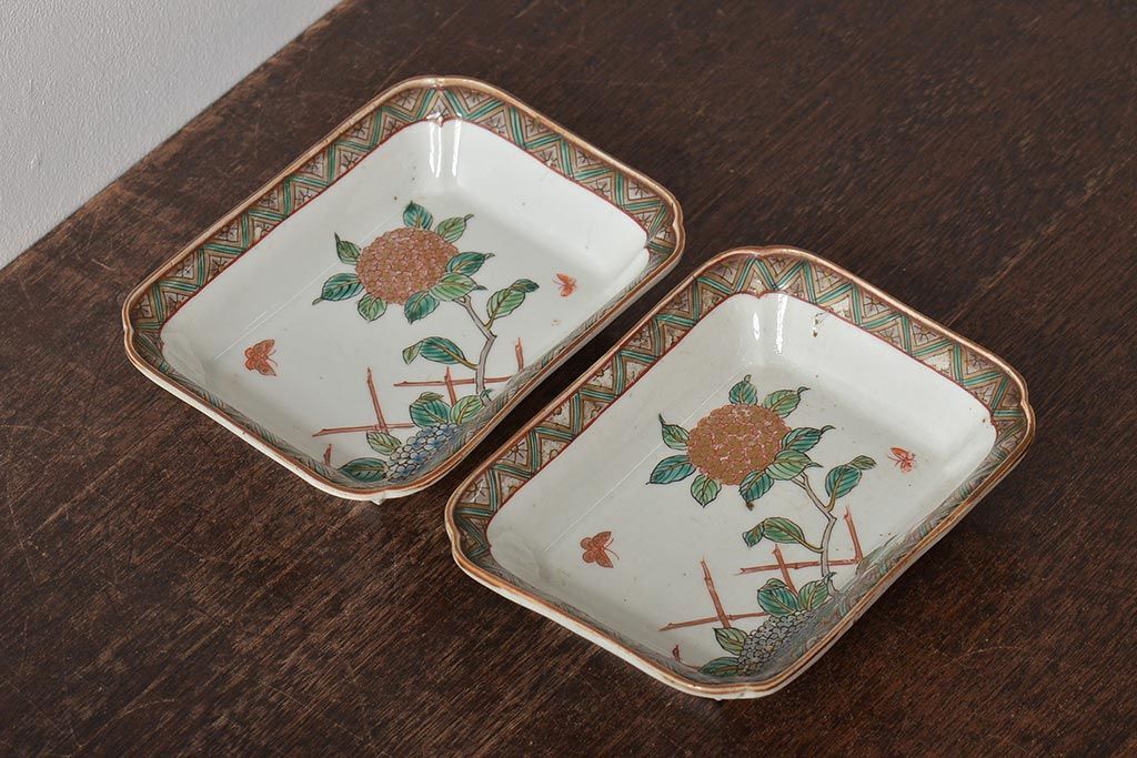 ラフジュ工房> 和食器・茶道具> 皿 > アンティーク雑貨 江戸期 九谷焼 花蝶図 角皿2枚セット(古九谷、古伊万里)(R-043237)