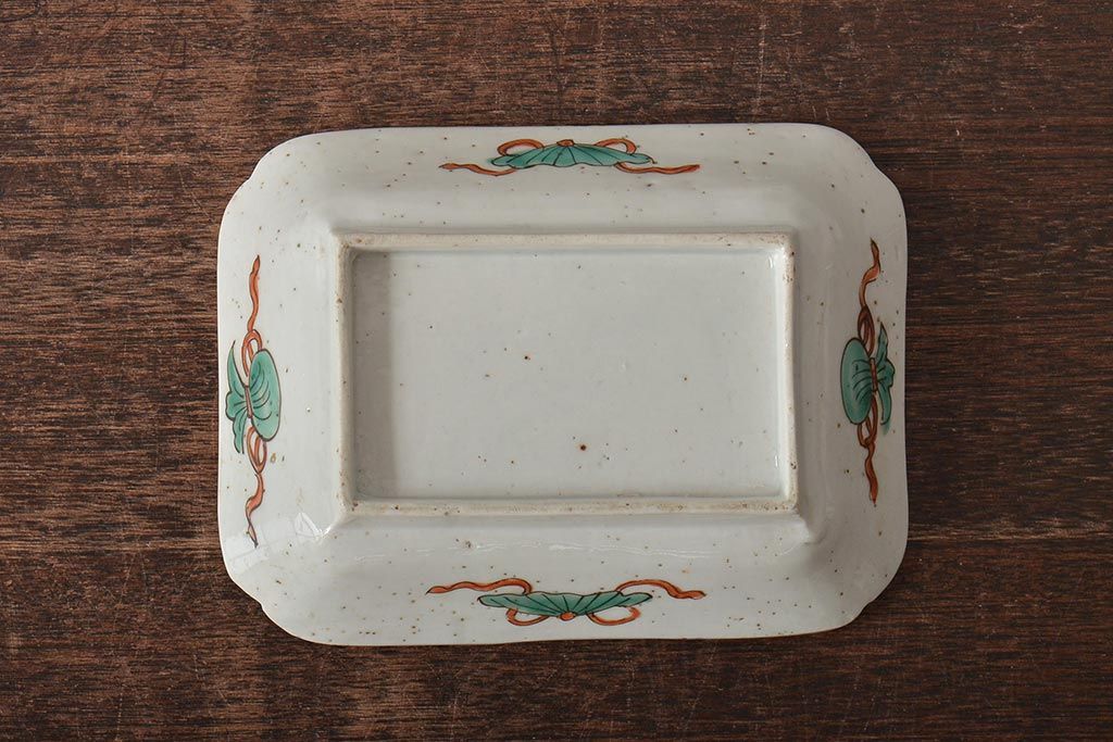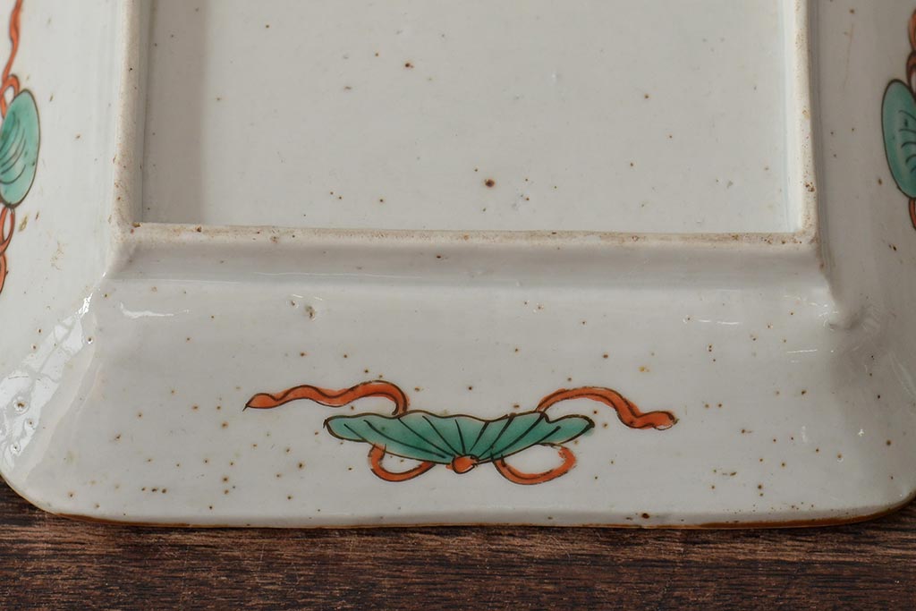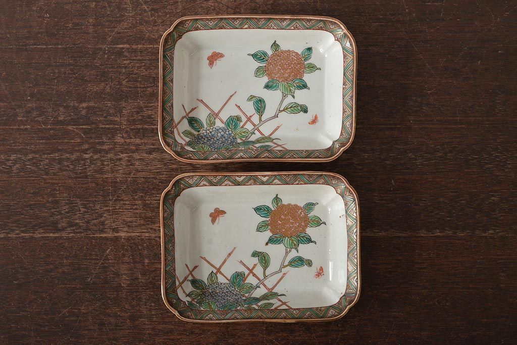 アンティーク雑貨 江戸期 九谷焼 花蝶図 角皿2枚セット(古九谷、古伊万里)(R-043237)
