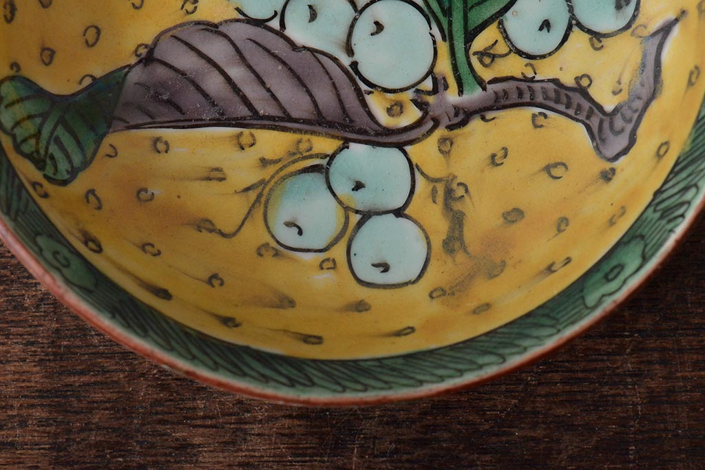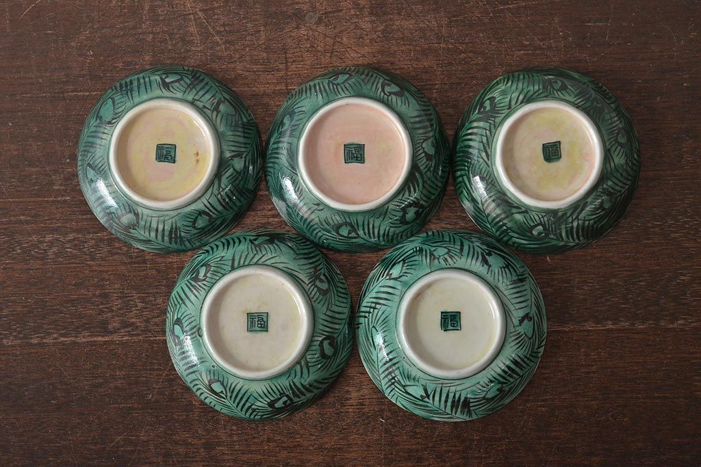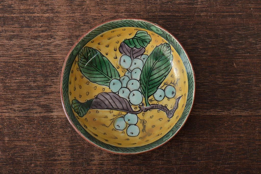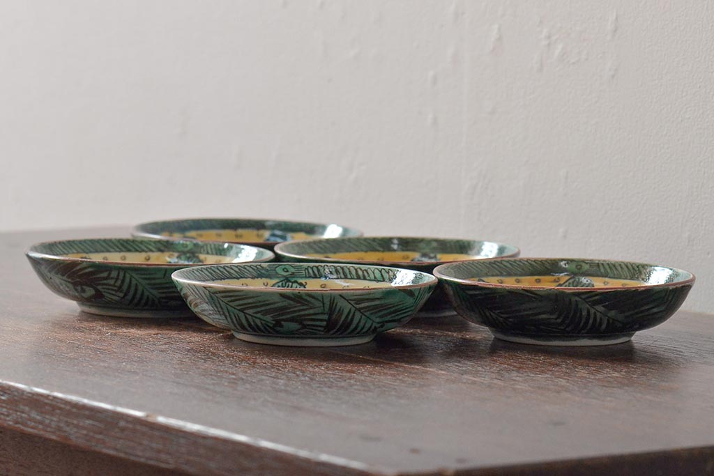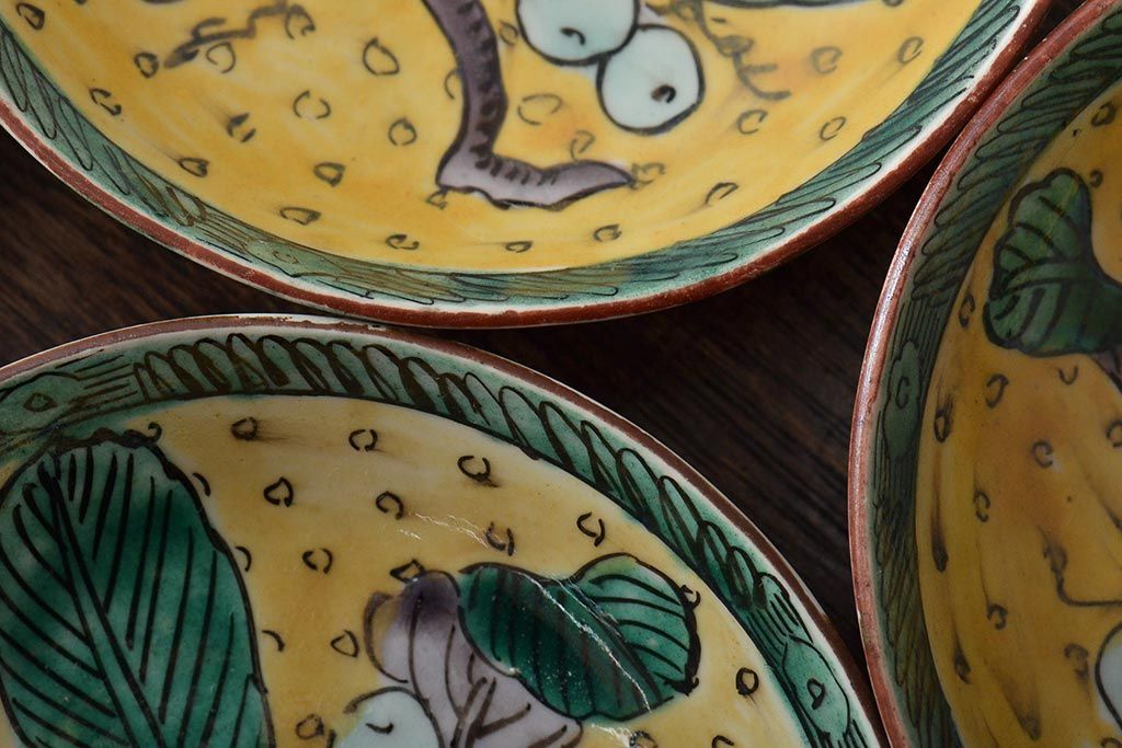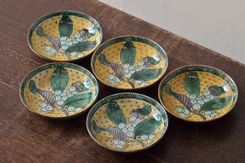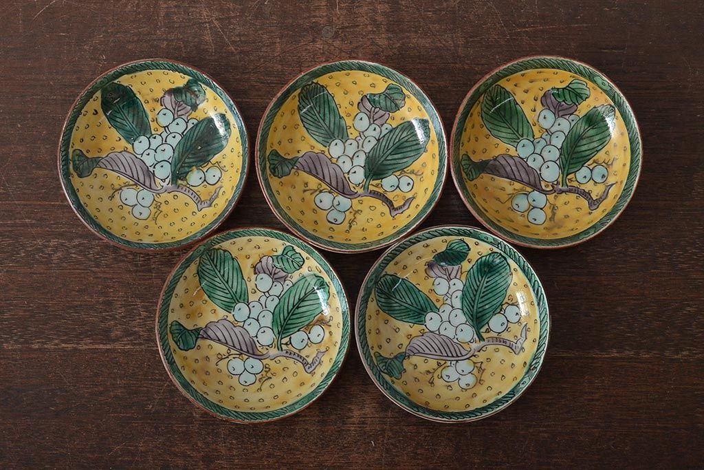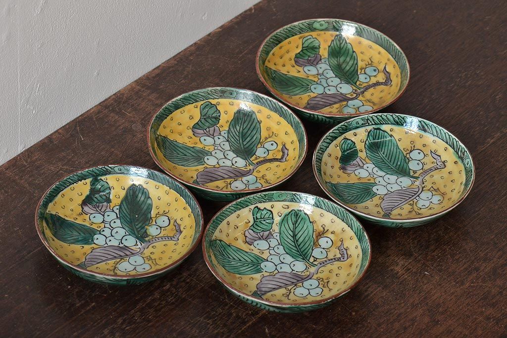 アンティーク雑貨 江戸明治期 九谷焼 角福 色絵果実染付小皿5枚セット(和食器)(R-043229)
