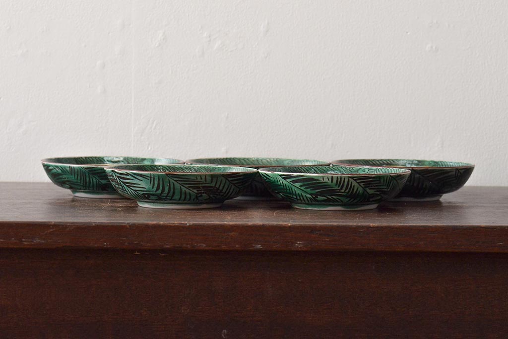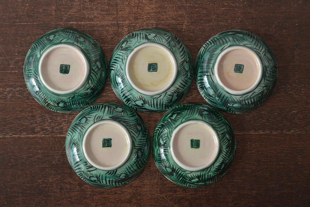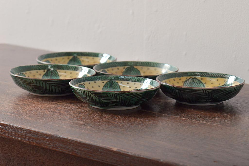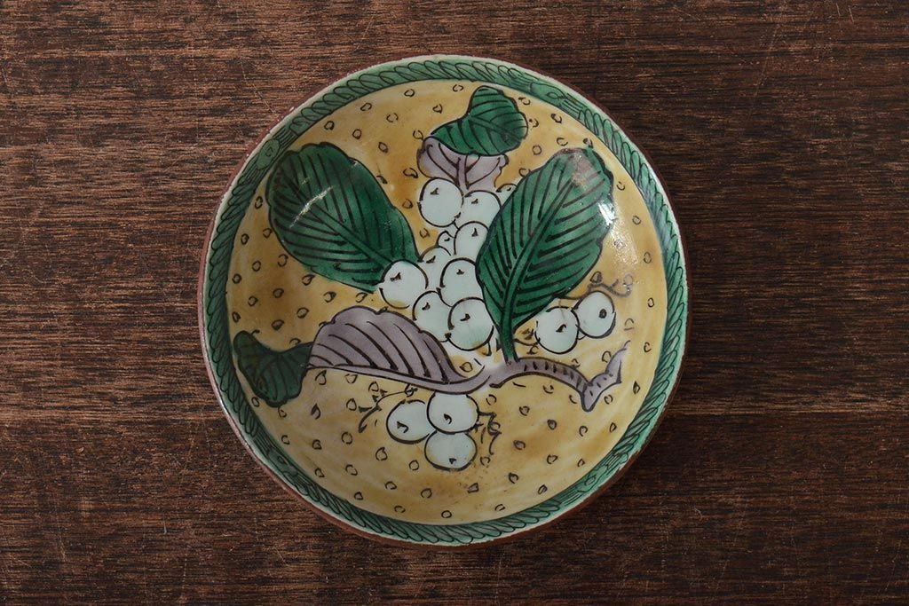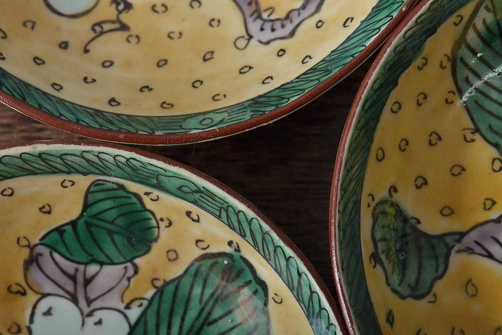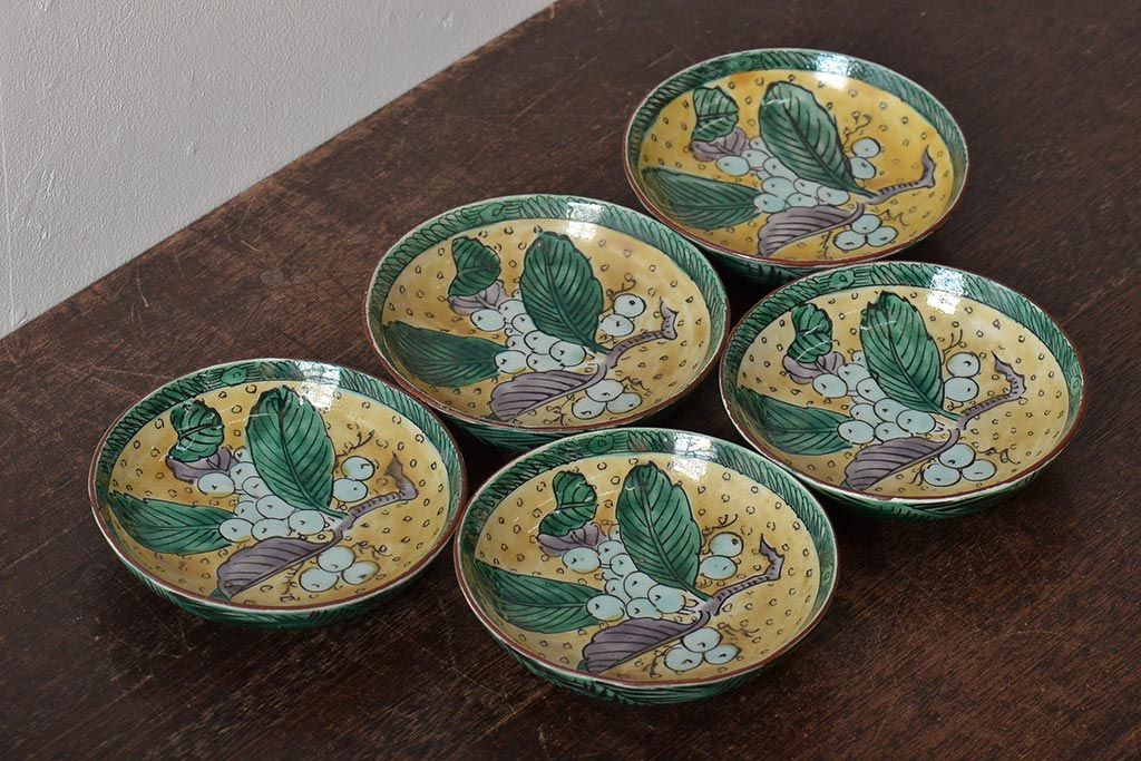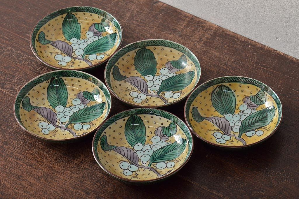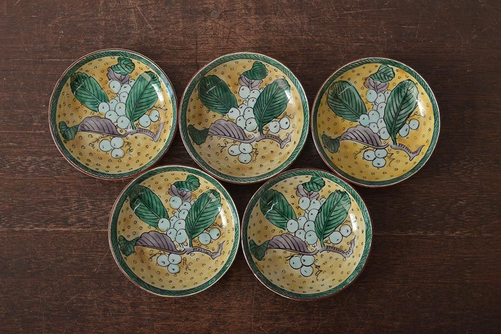 アンティーク雑貨 江戸明治期 九谷焼 角福 色絵果実染付小皿5枚セット(和食器)(R-043230)