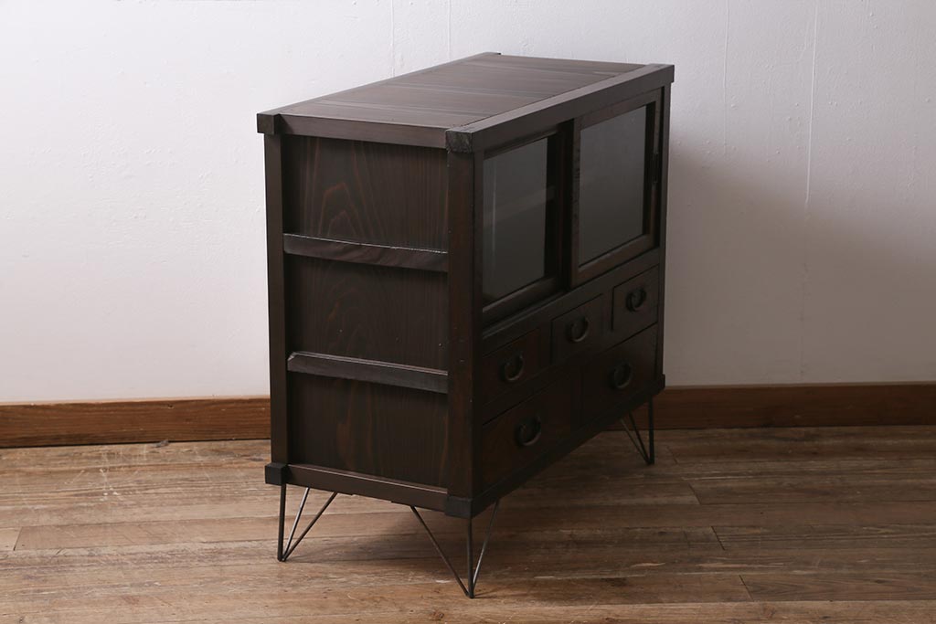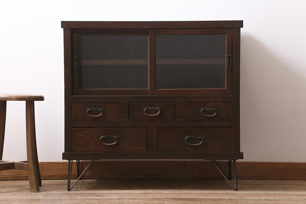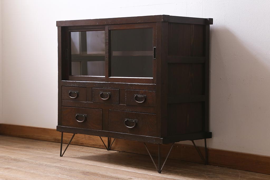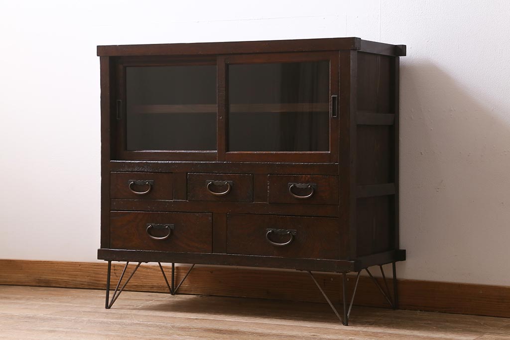 キャビネット・戸棚 > アンティーク家具 引き出し付き 木味が魅力の鉄脚リビングボード(ガラス戸棚、収納棚、キャビネット)(R-043508)