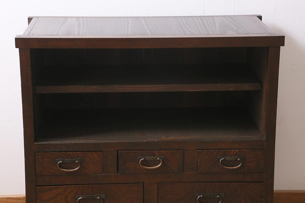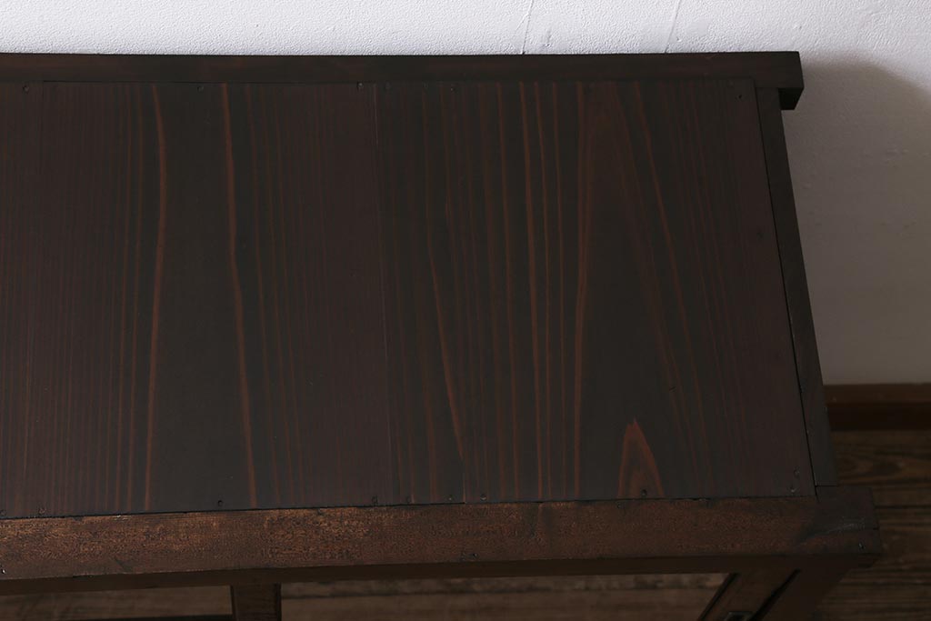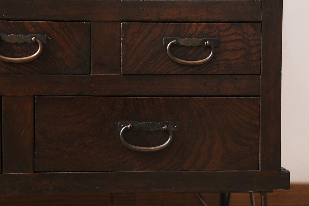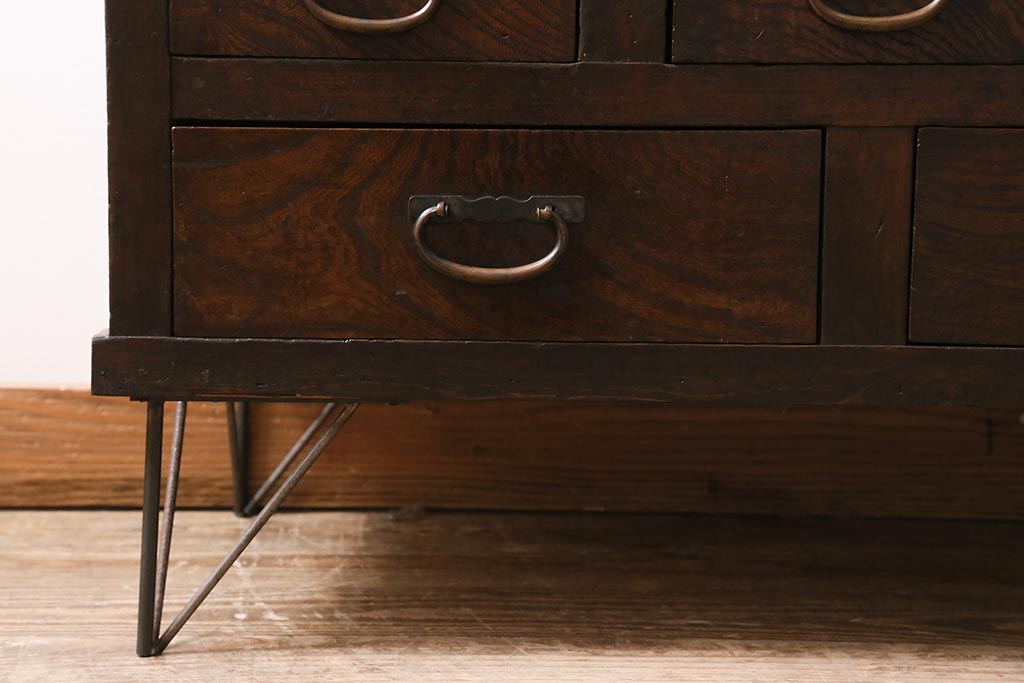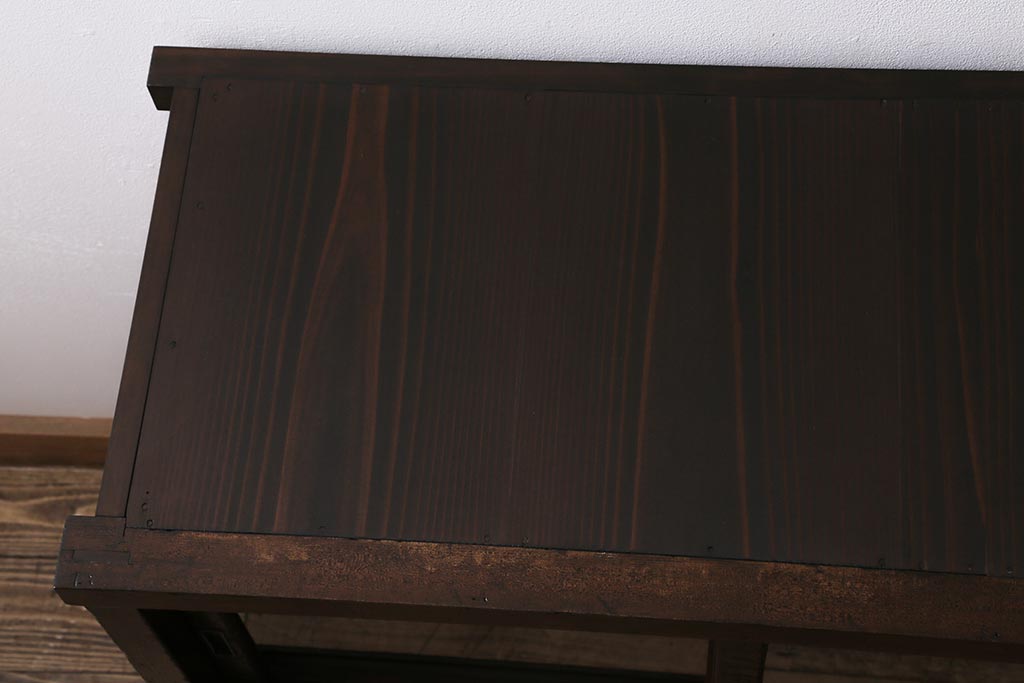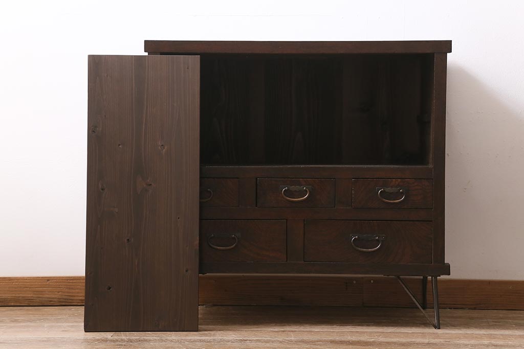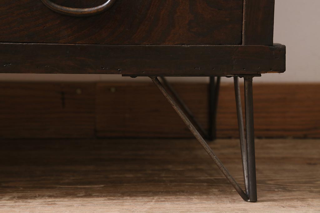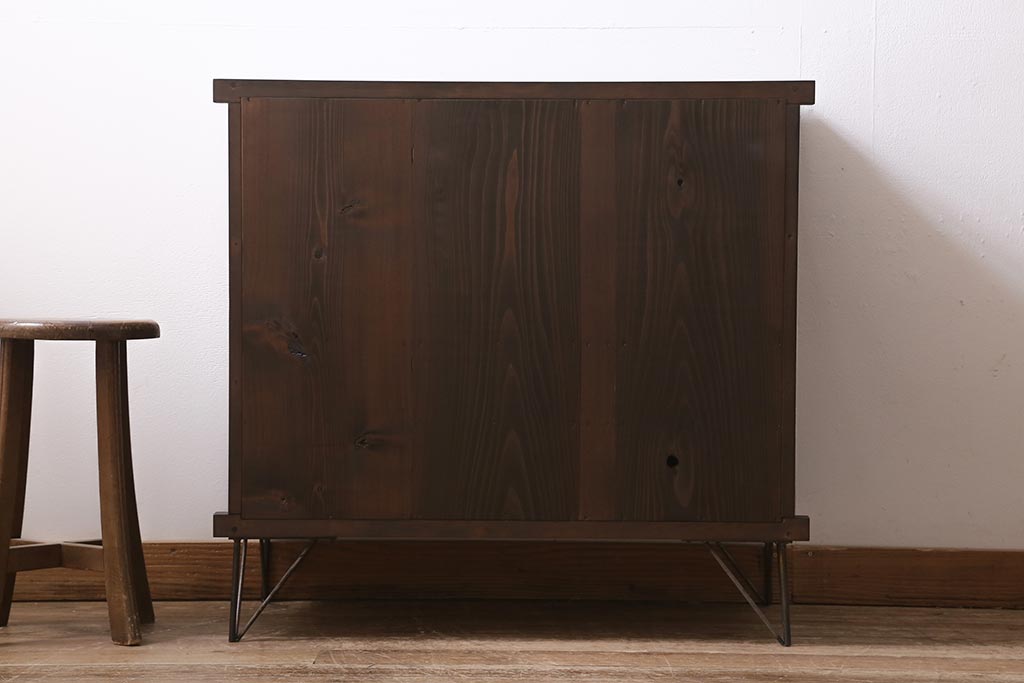 アンティーク家具 引き出し付き 木味が魅力の鉄脚リビングボード(ガラス戸棚、収納棚、キャビネット)(R-043508)です。