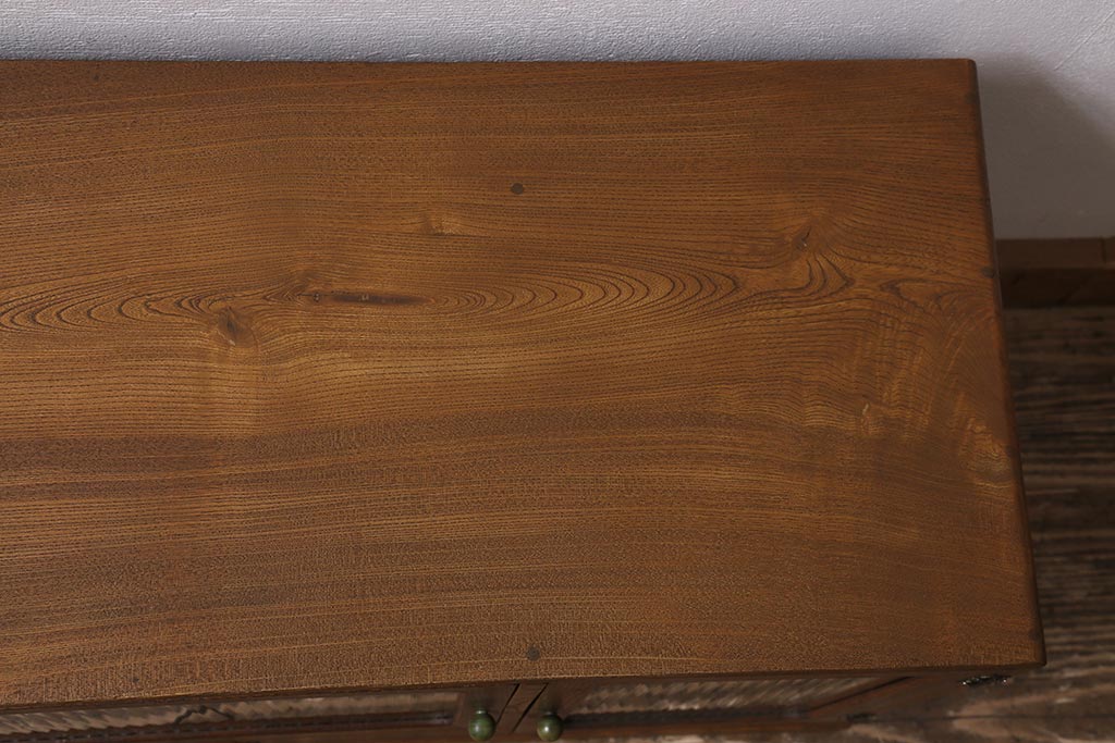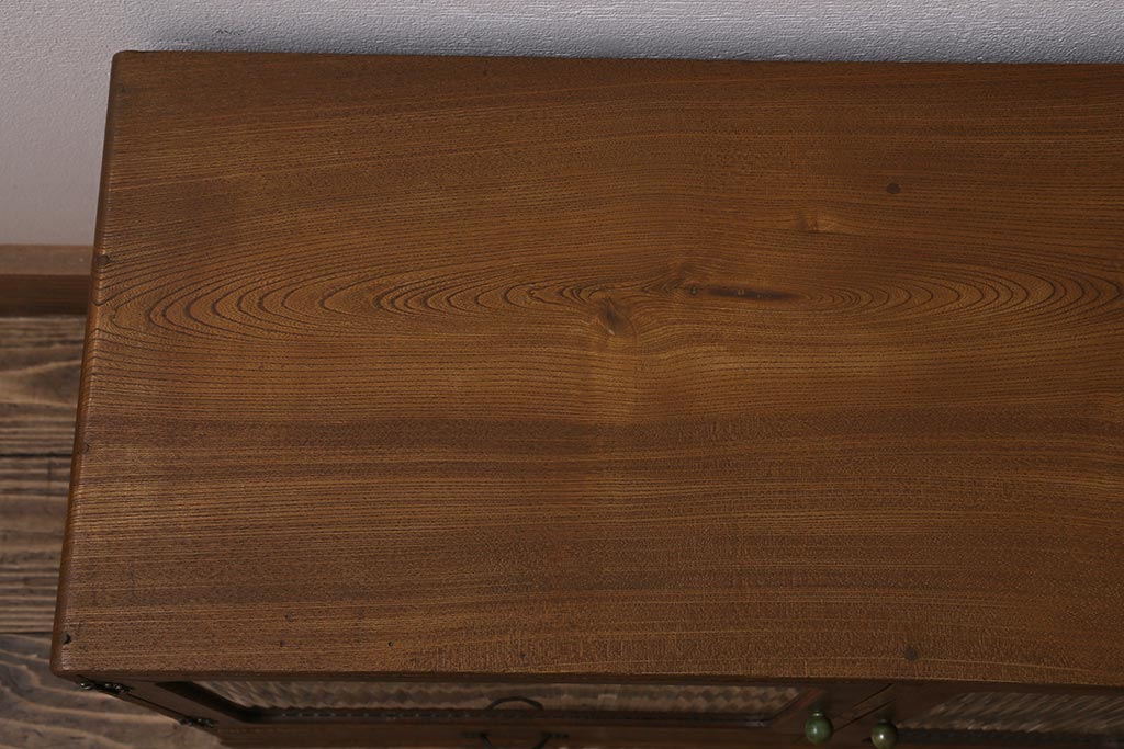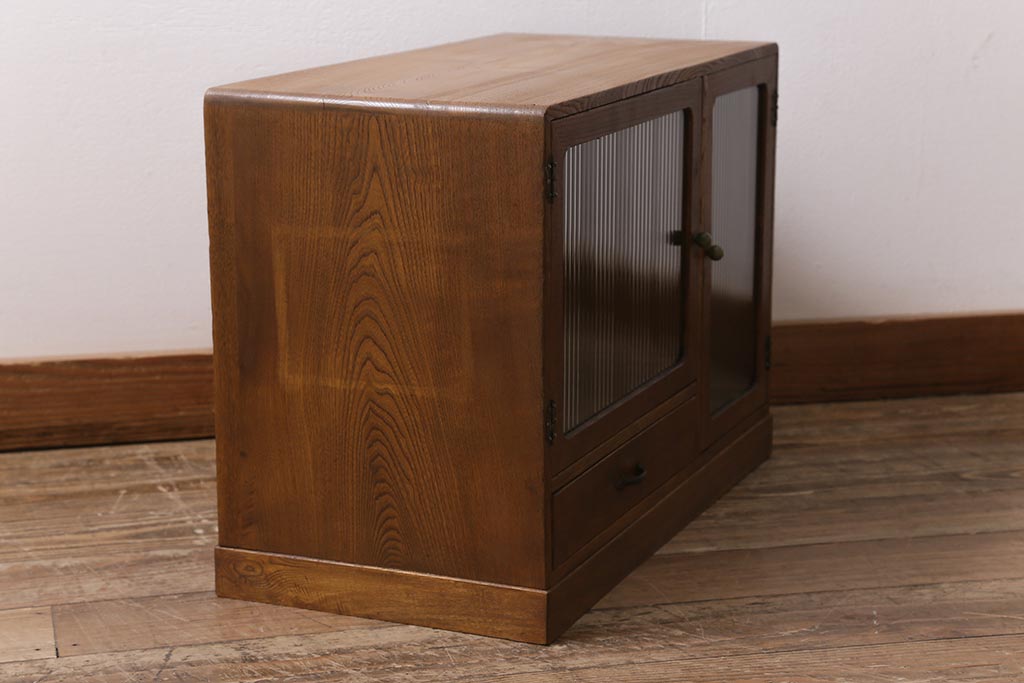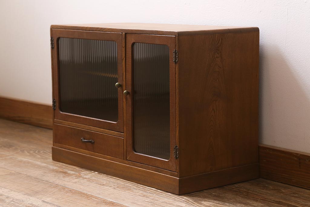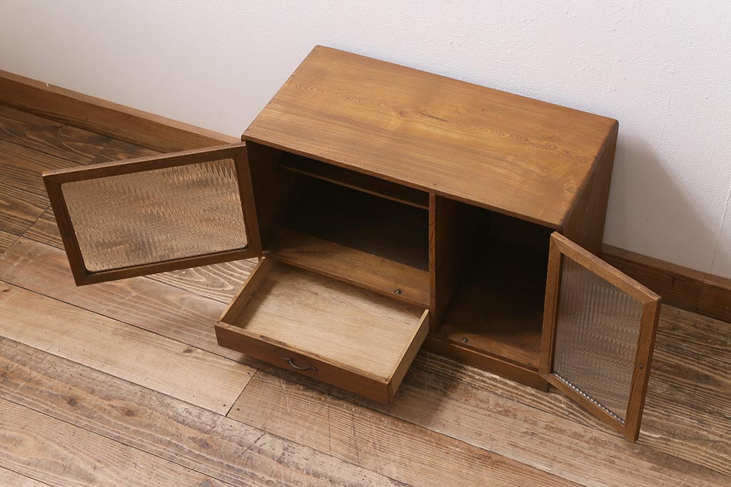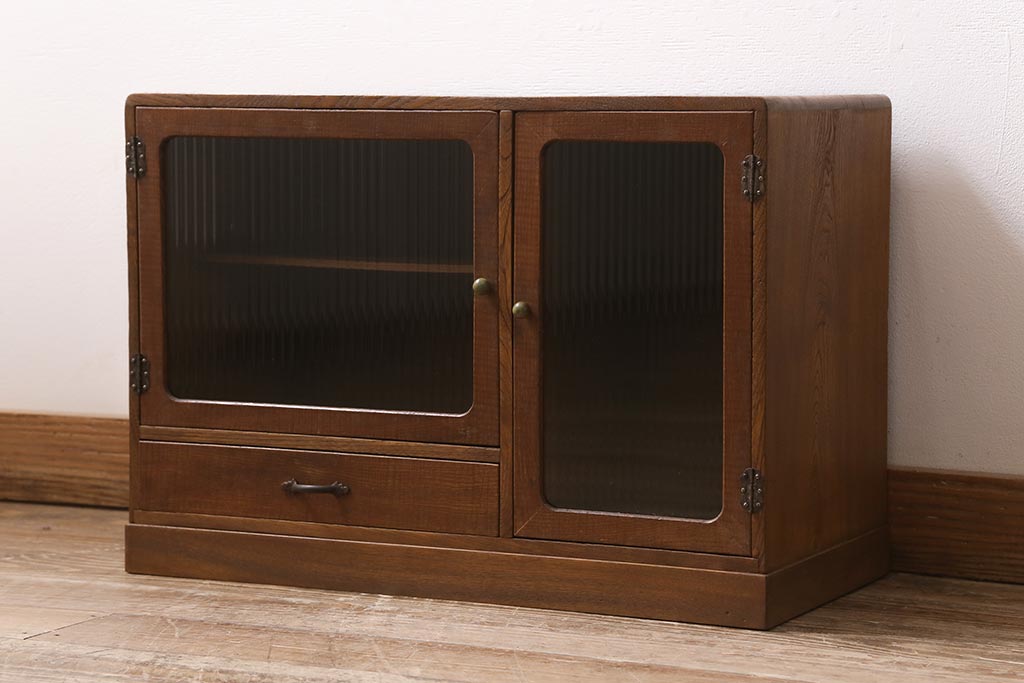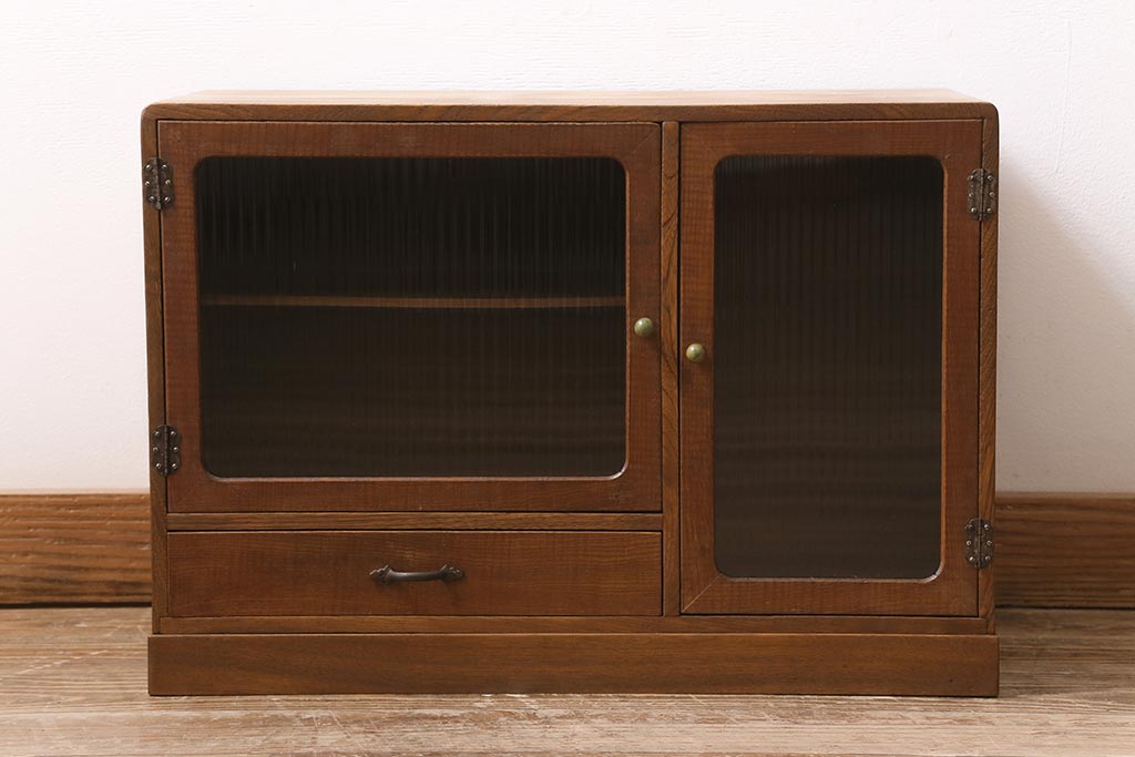 ビンテージ家具 栓材製 引き出し付き モールガラス 小さいレトロなガラス戸棚(収納棚)(R-043568)です。