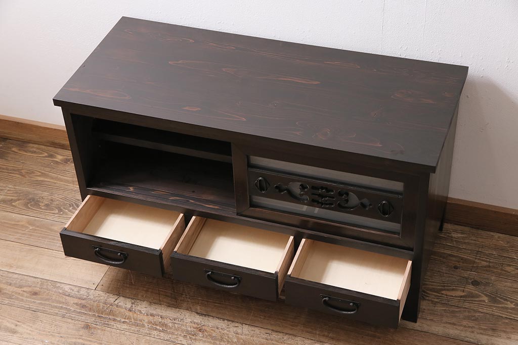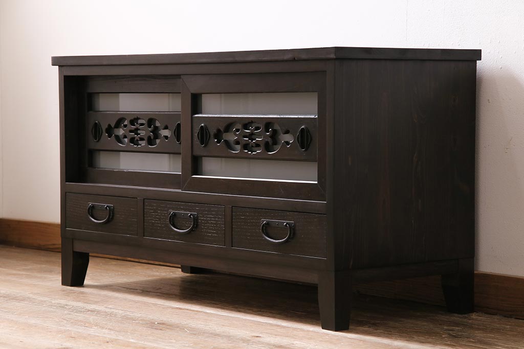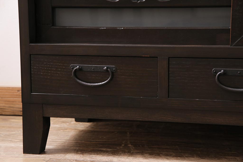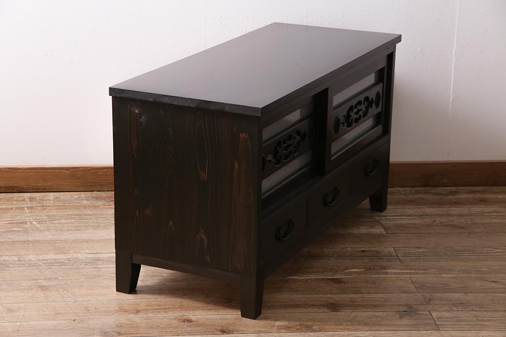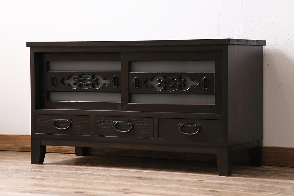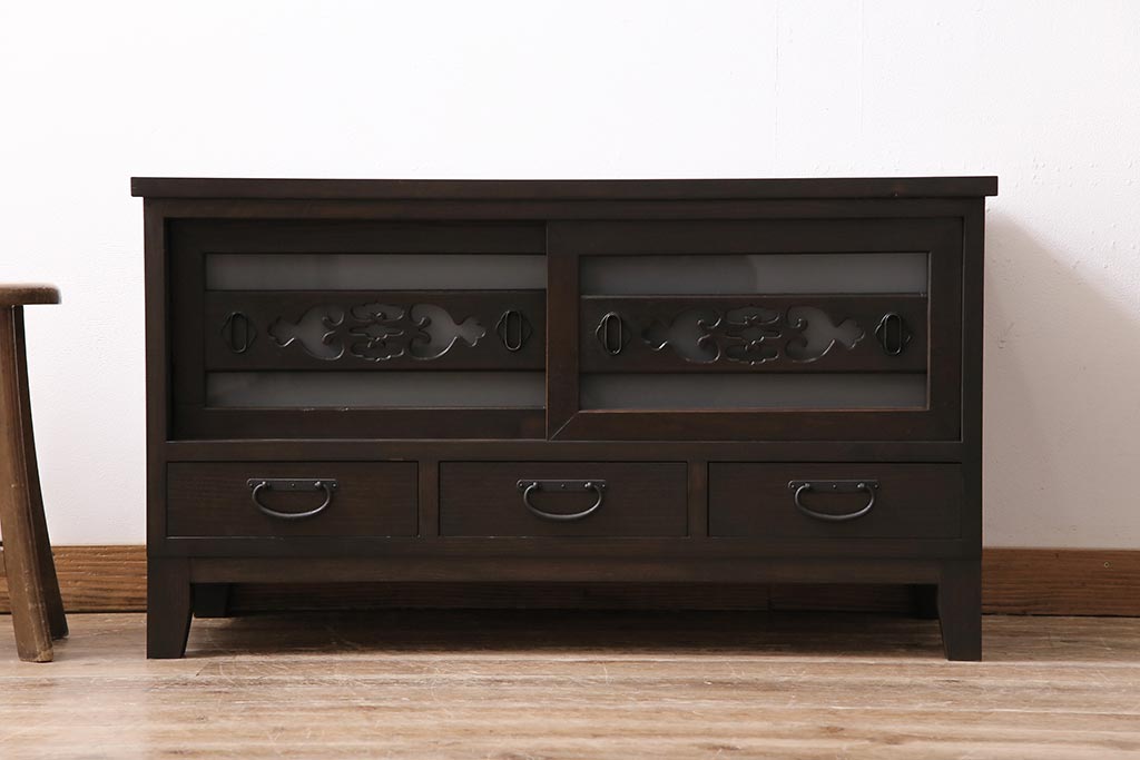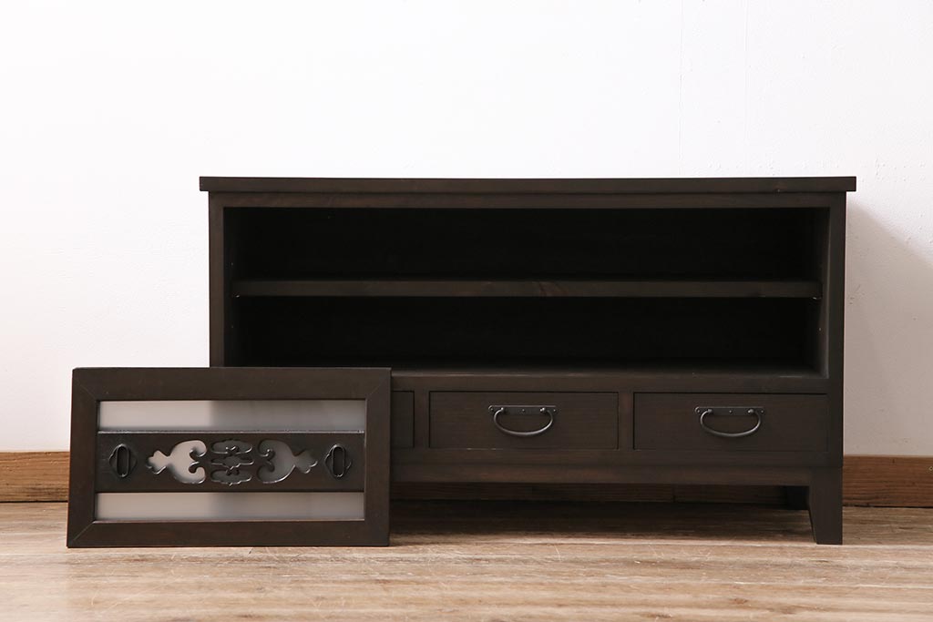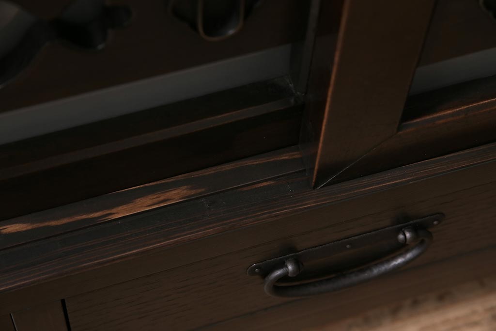 ラフジュ工房オリジナル 古建具リメイク 前板栗材 引き出し付き 和モダンな脚付きローボード(水屋、収納棚、戸棚)(R-043702)です。