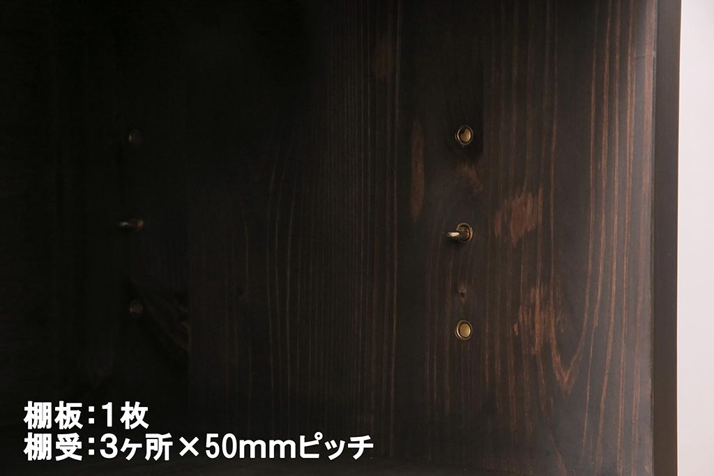 棚板は取り外しできます。棚板は1枚あります。棚受けは3ヶ所、50mmピッチで調整できます。棚幅サイズのものが1枚の作りです。
