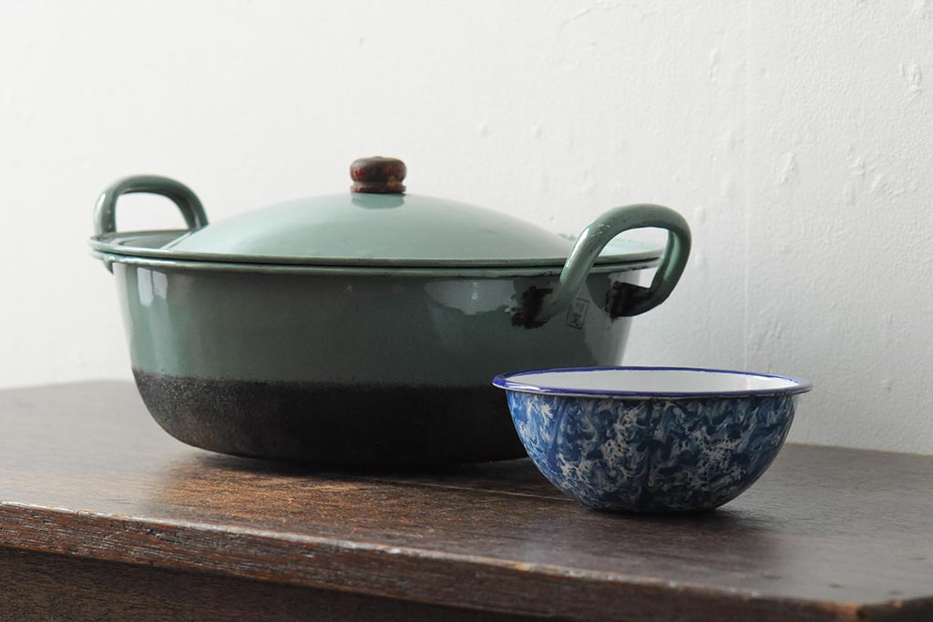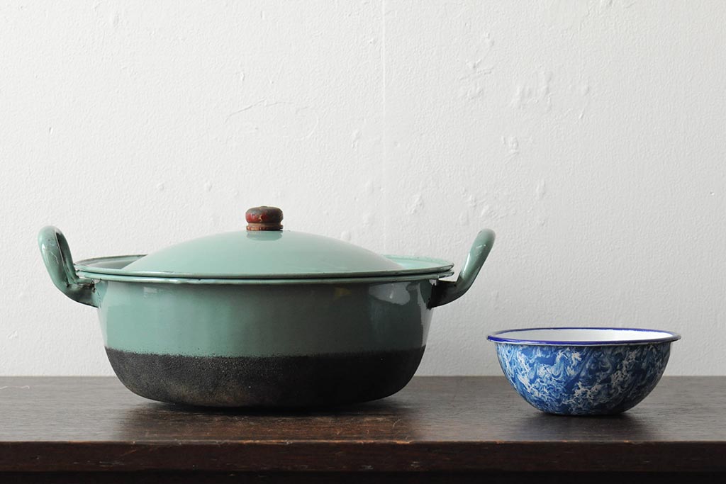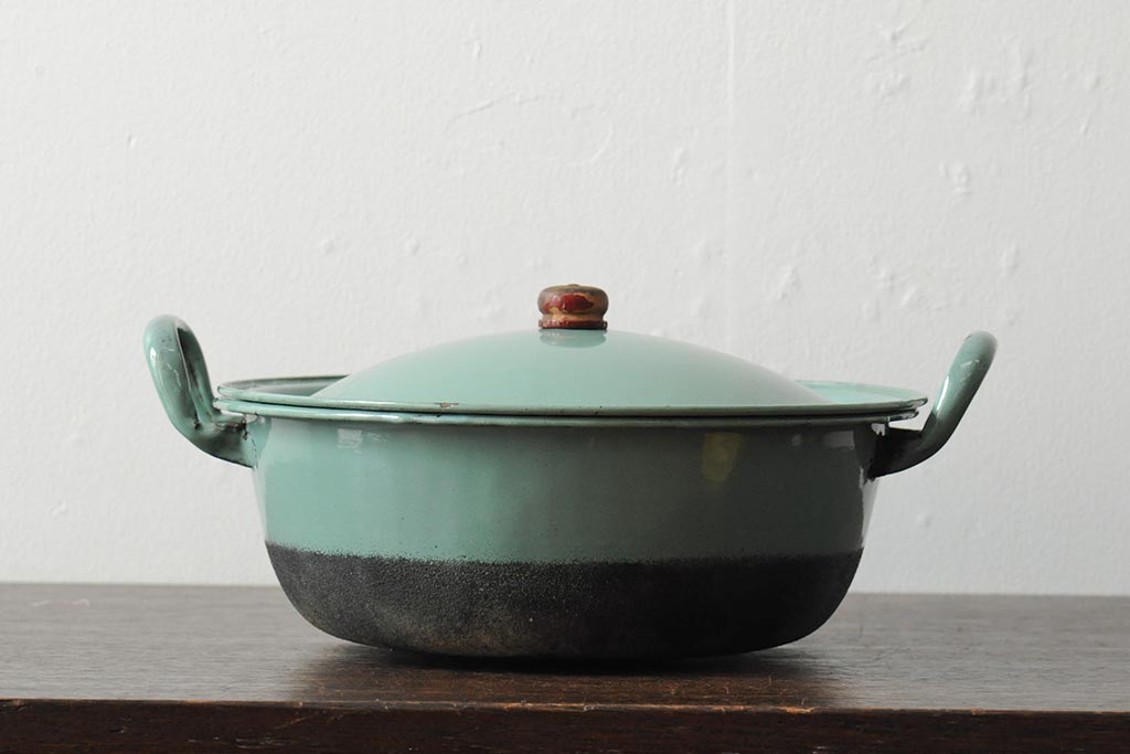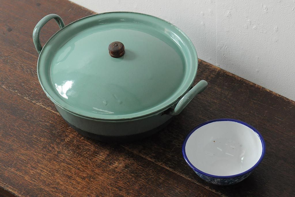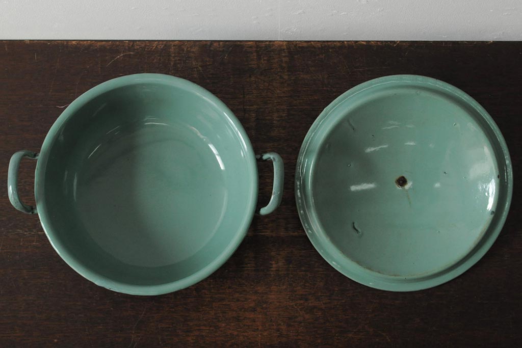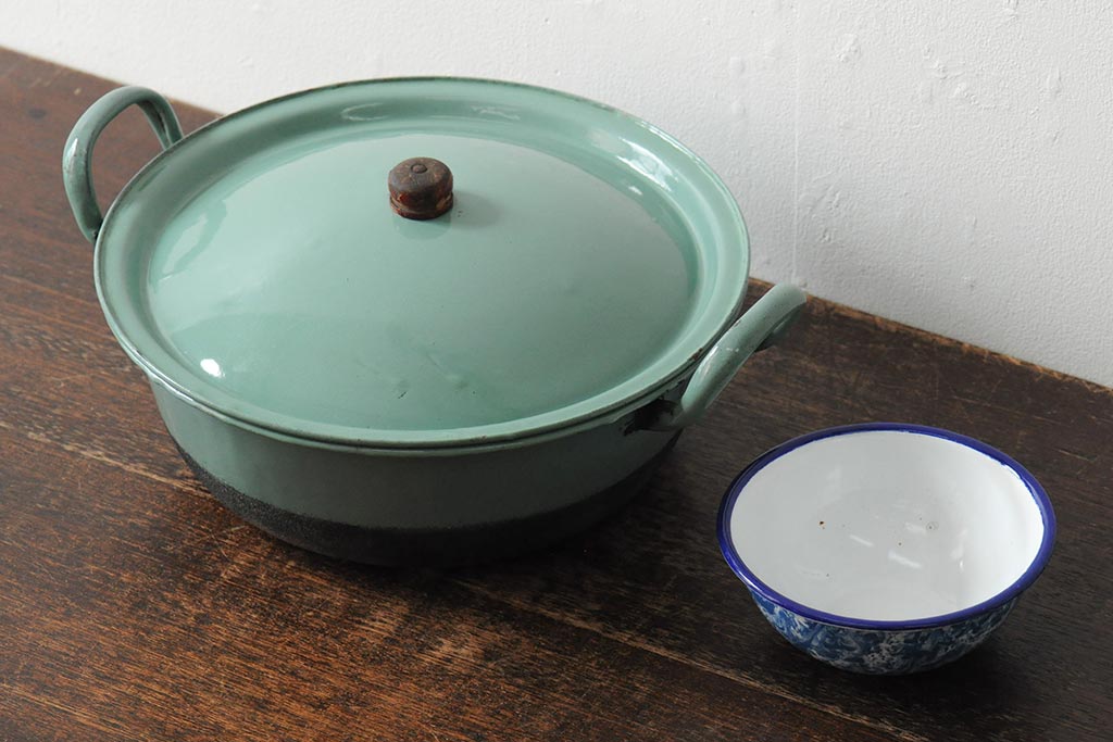 ラフジュ工房> 洋食器・キッチン用品 > アンティーク雑貨 昭和期 レトロなホーロー両手鍋・ボウル(琺瑯、蓋付きなべ、ディスプレイ)(R-043621)