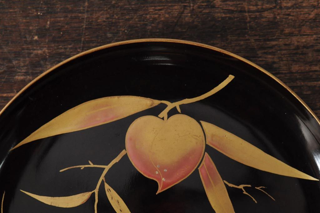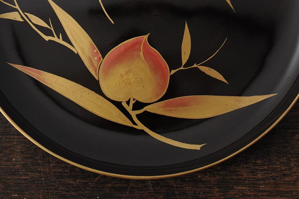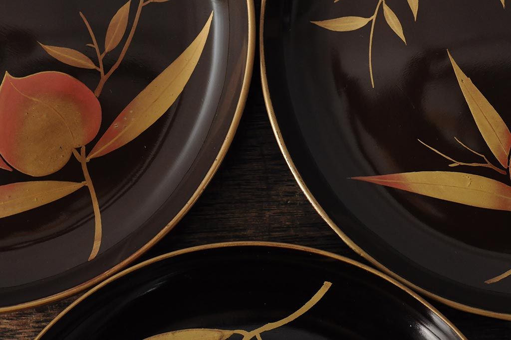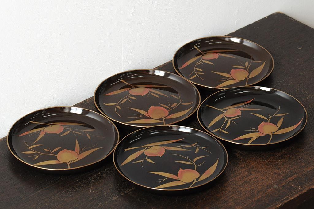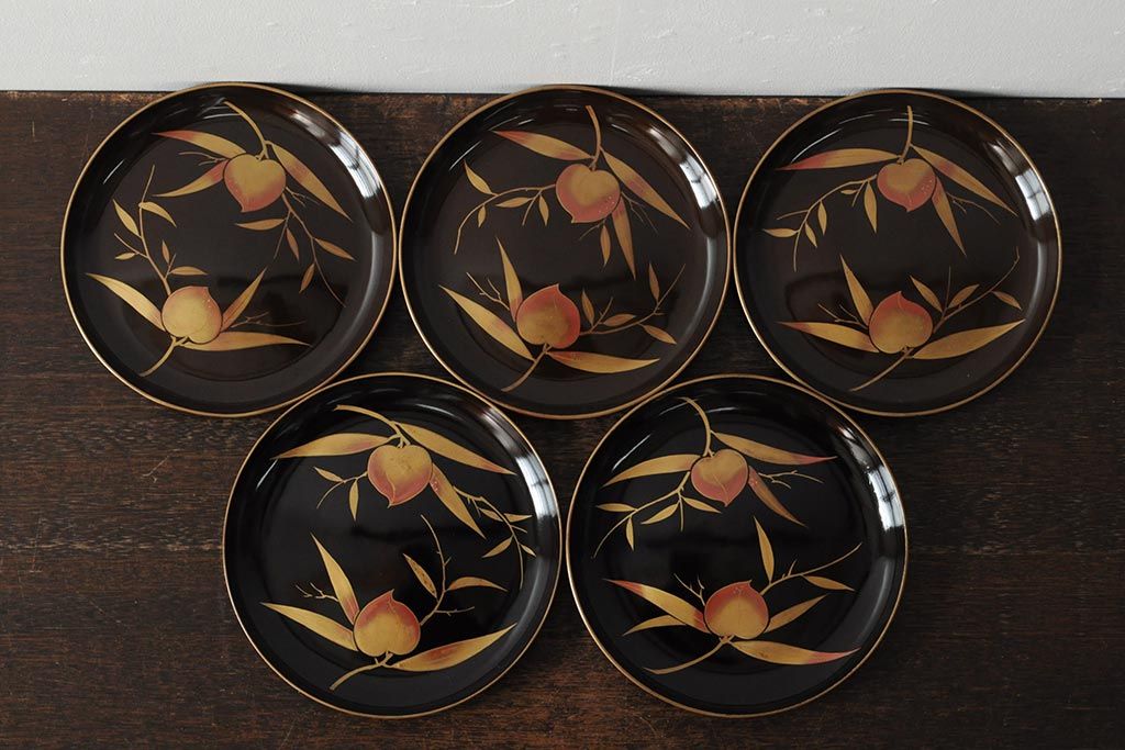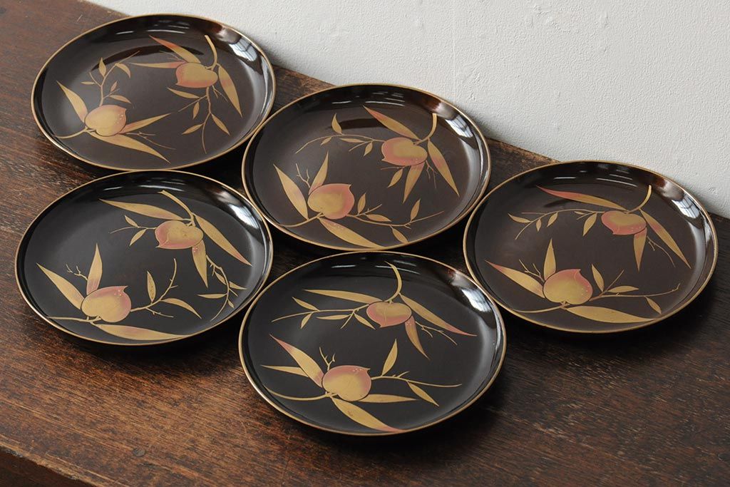 ラフジュ工房> 骨董・美術品> 骨董-漆器 > 大正昭和初期 桃図 蒔絵木皿5枚セット(漆器、木製皿、銘々皿)(R-043623)
