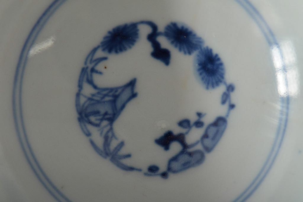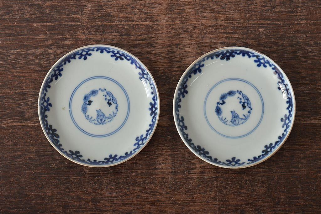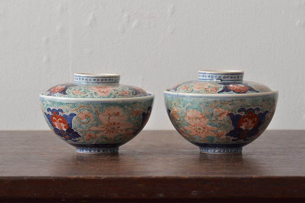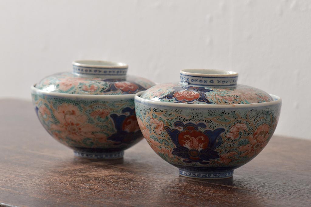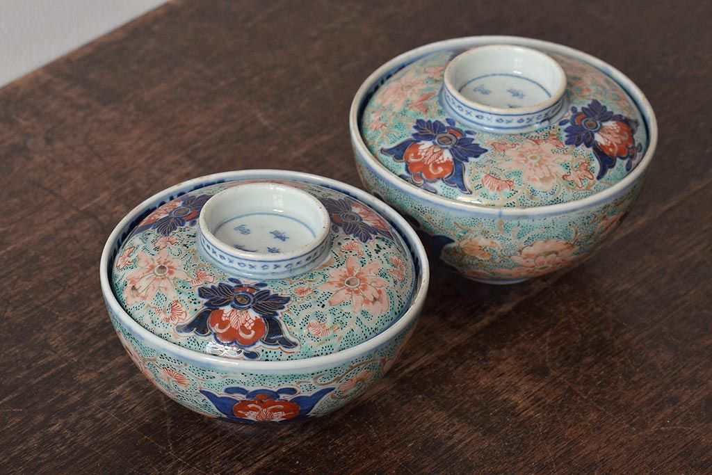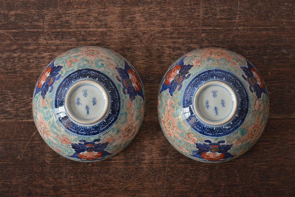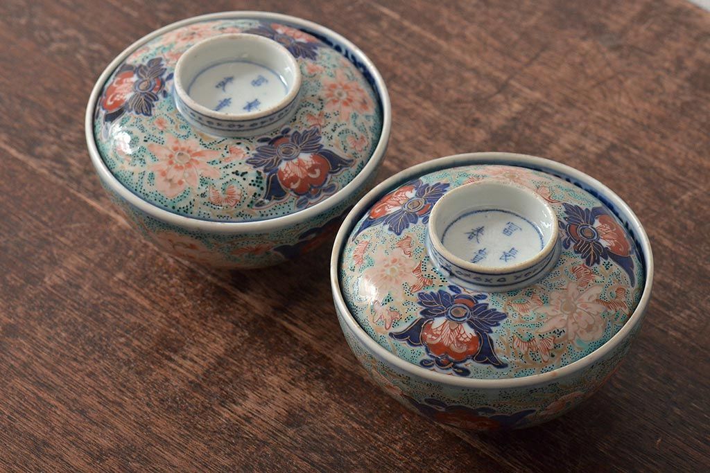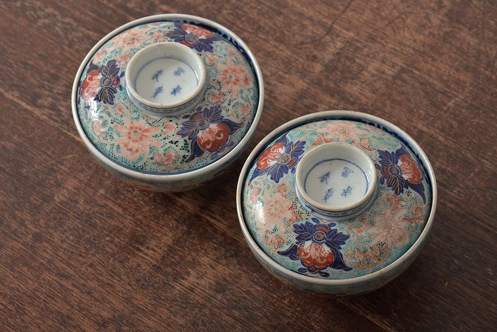 古民具・骨董 幕末明治 富長貴春銘 色絵染付蓋茶碗2客セット(和食器)(R-043345)