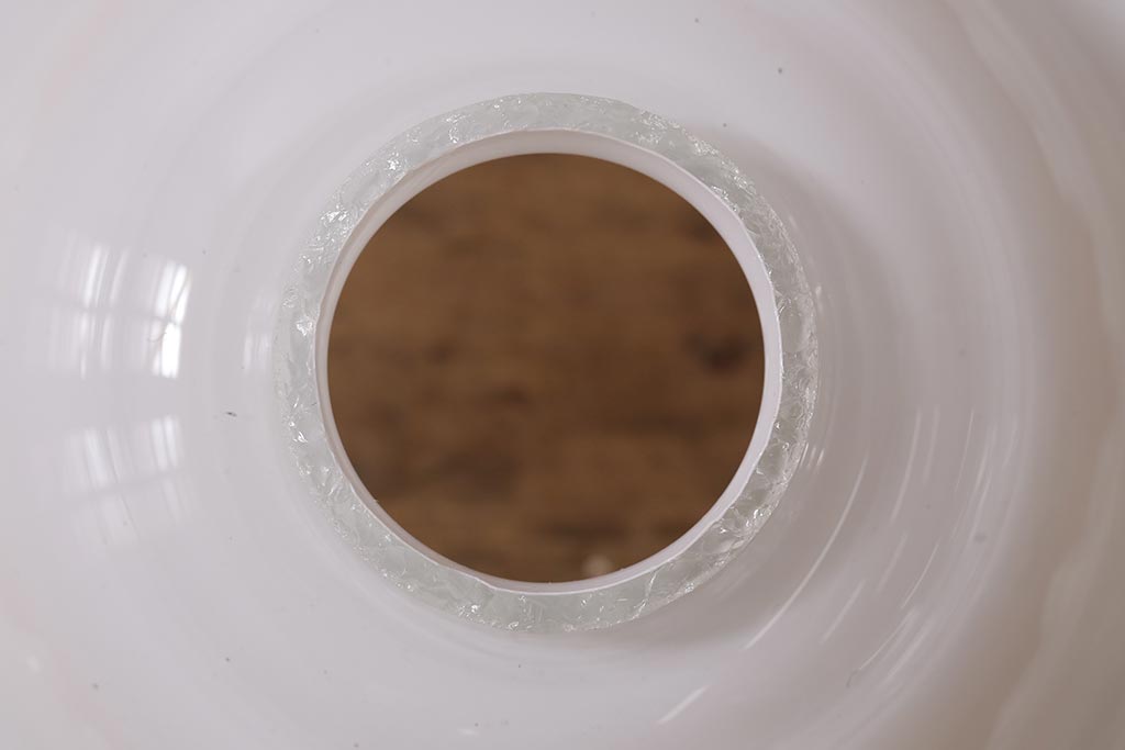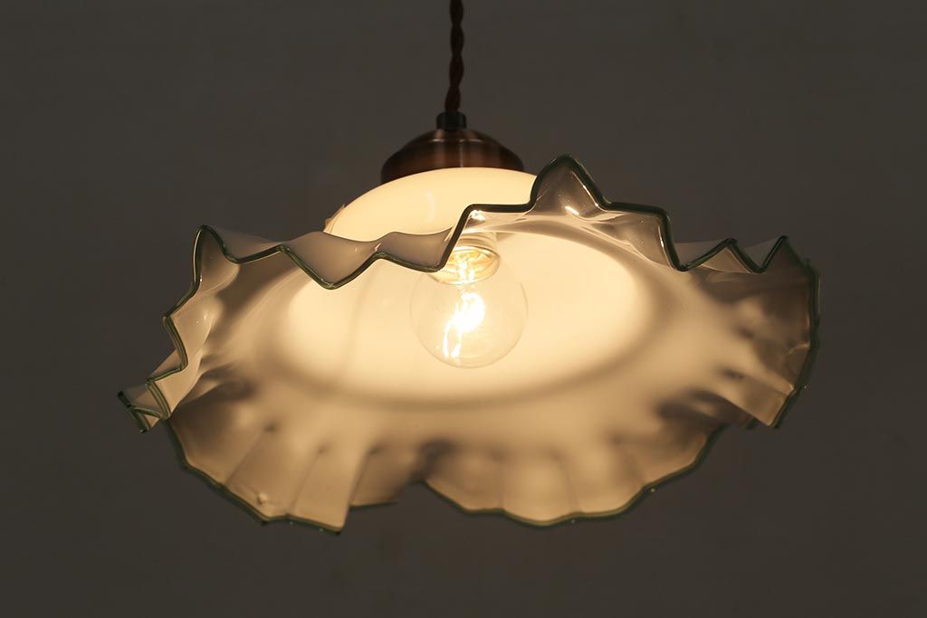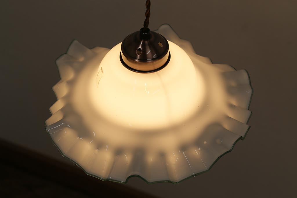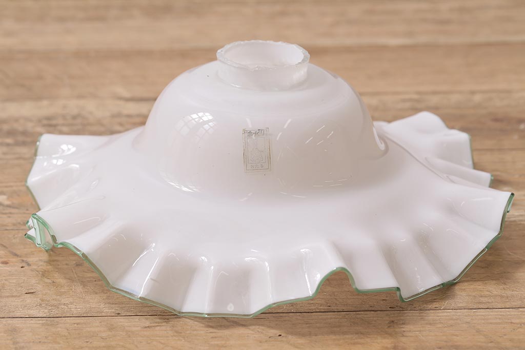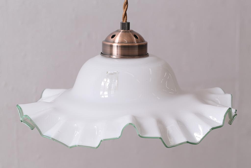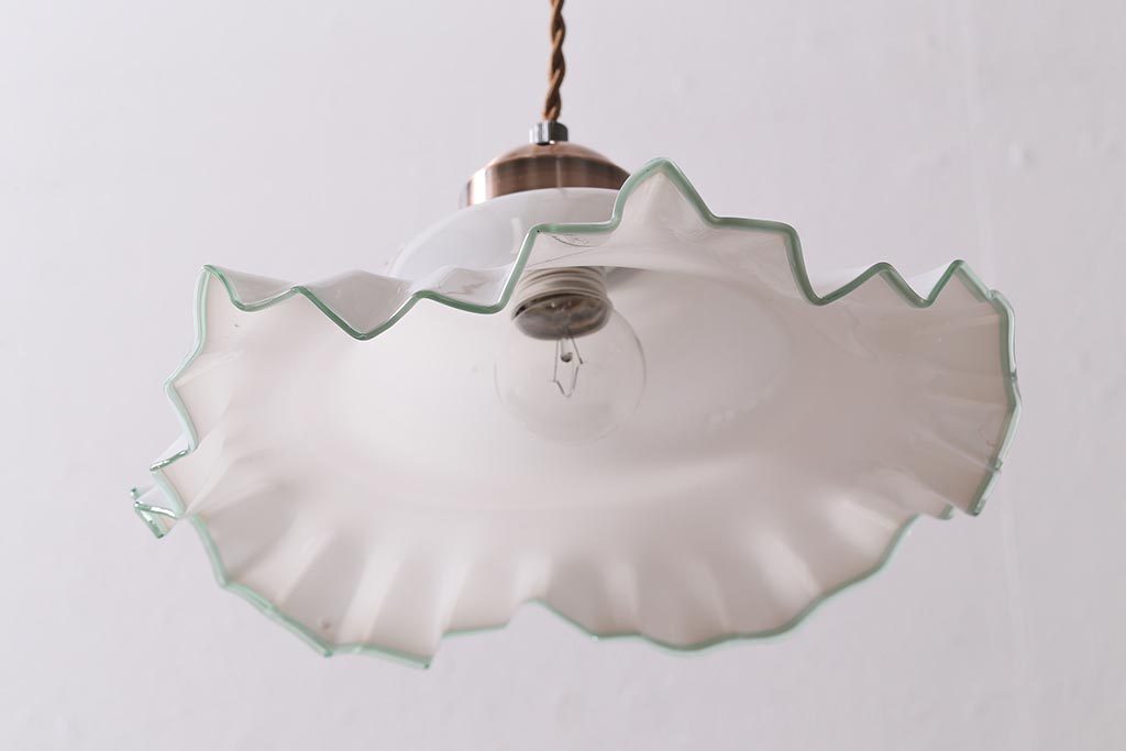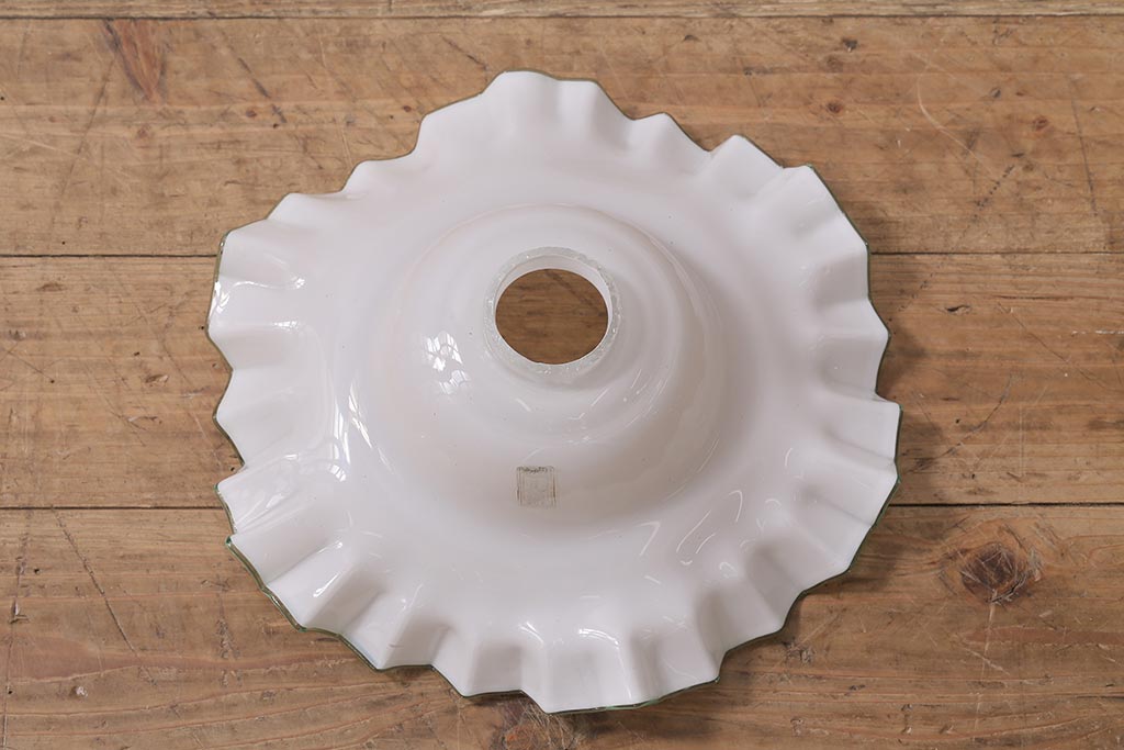 アンティーク照明 昭和初期 おたるガラス 緑縁 フリルシェードの天井照明(北一硝子?ランプシェード、電笠、花笠)(R-043588)