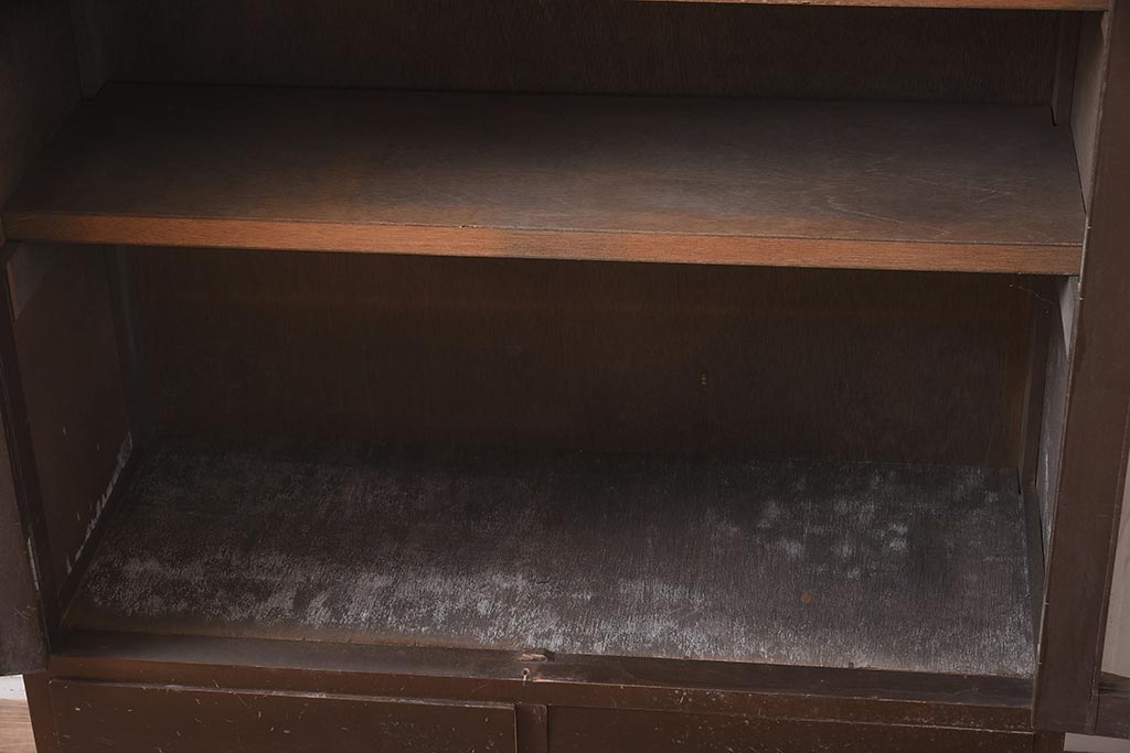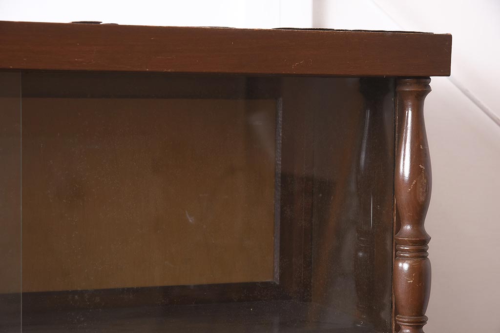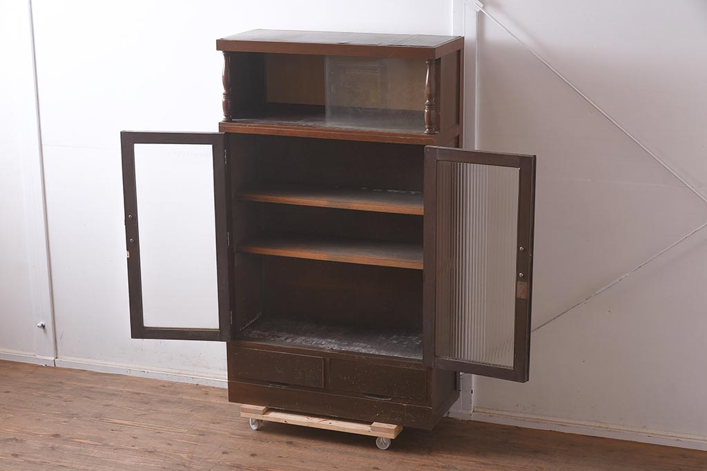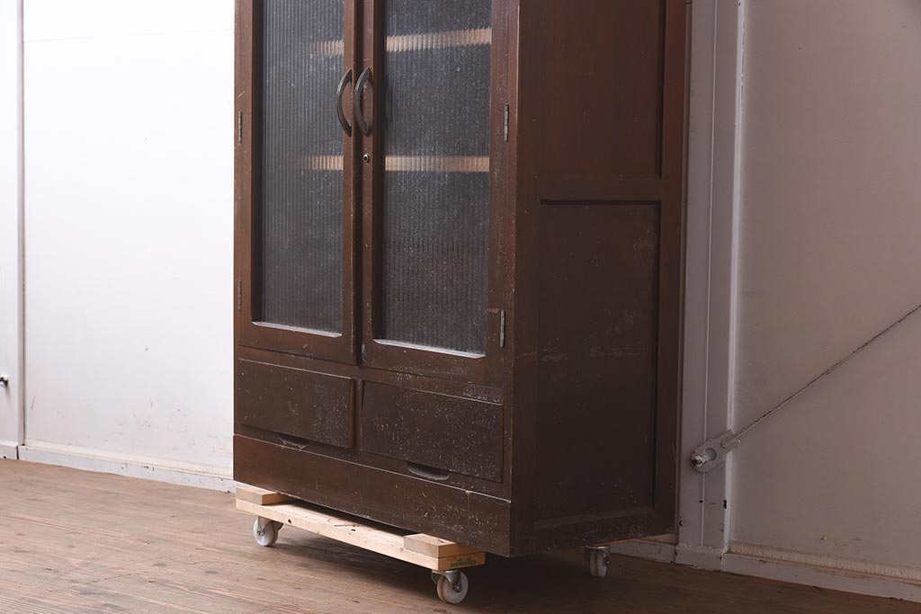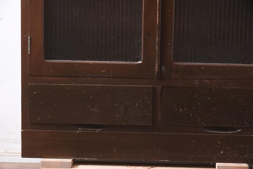 レトロ家具 昭和中期 モールガラス入り 大振りで薄型サイズのレトロな本箱(キャビネット、収納棚、戸棚)(R-043639)