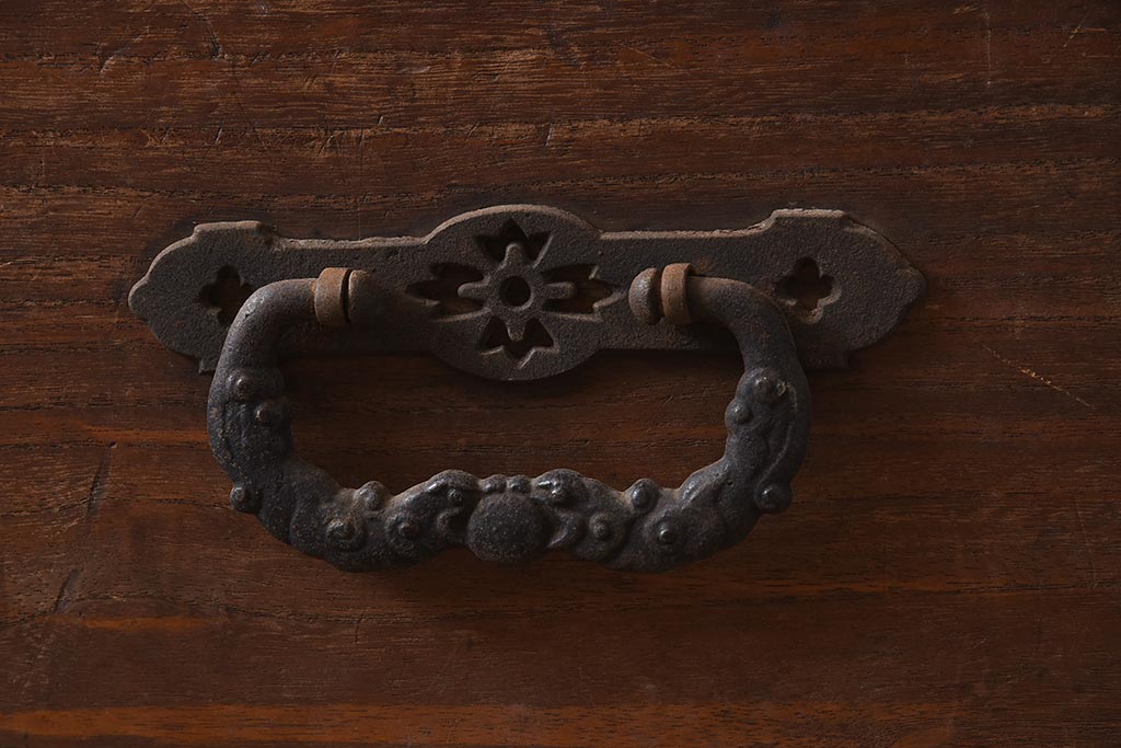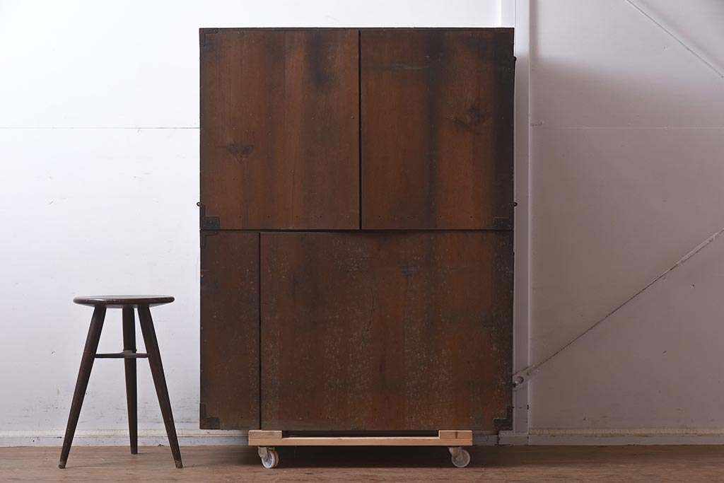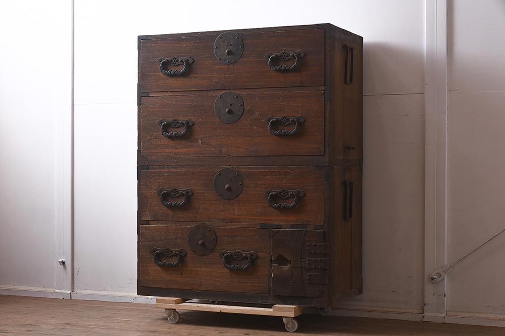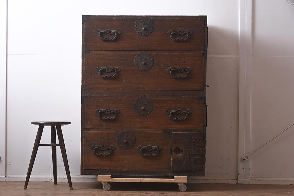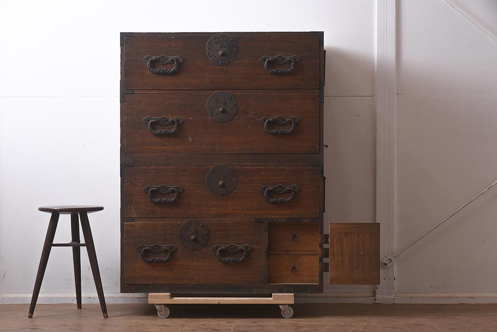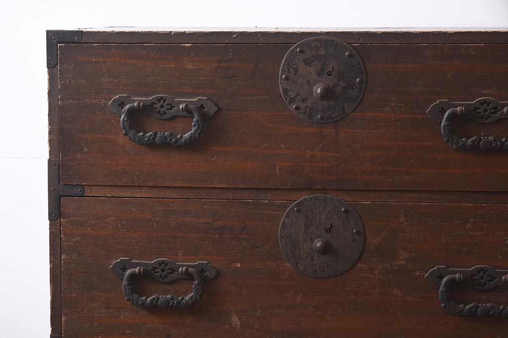 和箪笥> 衣装箪笥 > アンティーク家具 和製アンティーク 大正昭和初期 金具の意匠が珍しい!重ねの和箪笥(衣装箪笥、引き出し、チェスト)(R-043559)