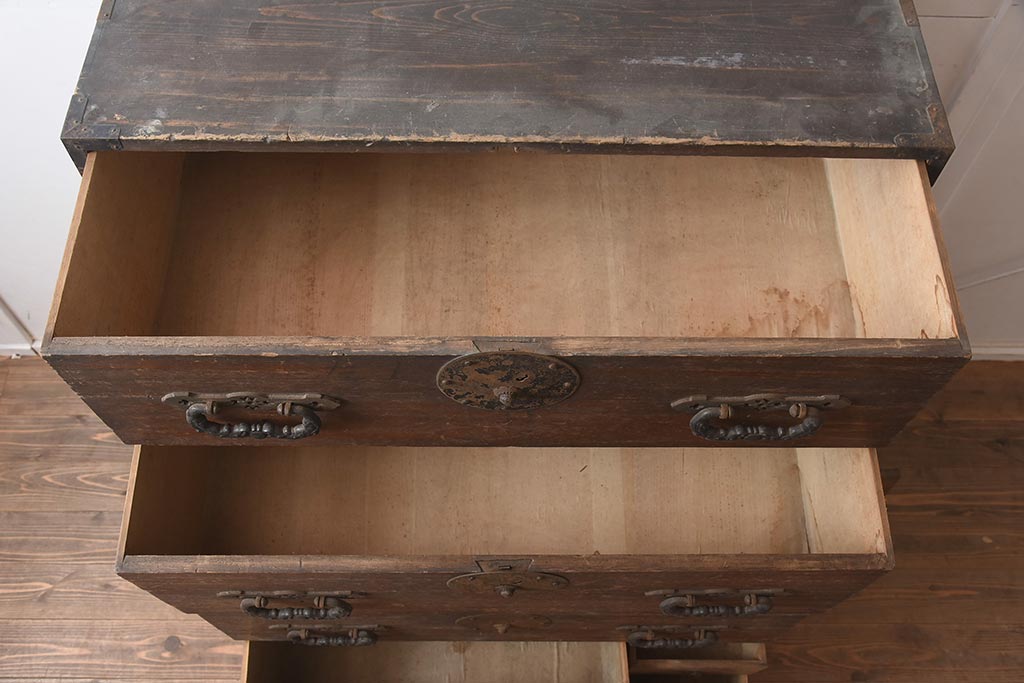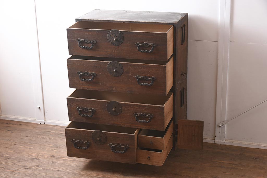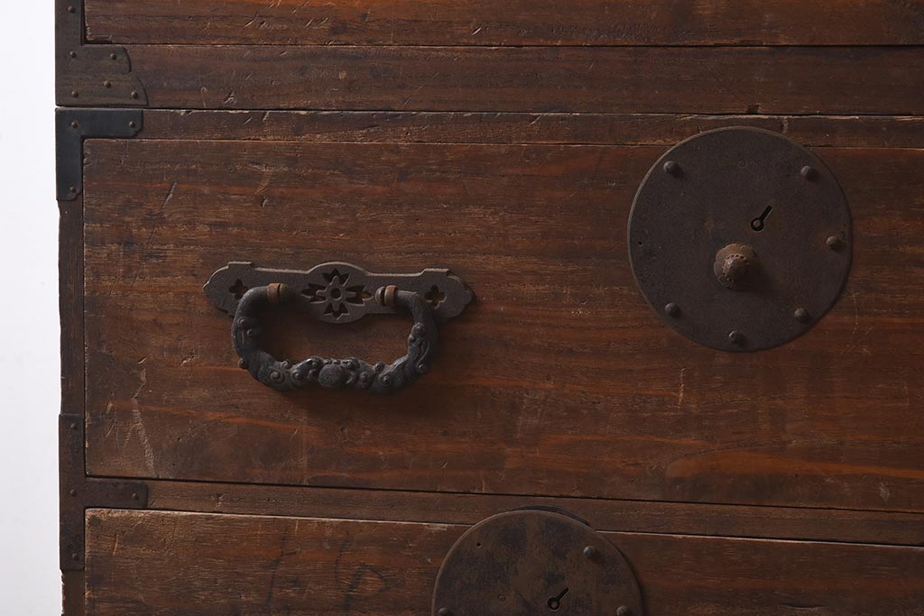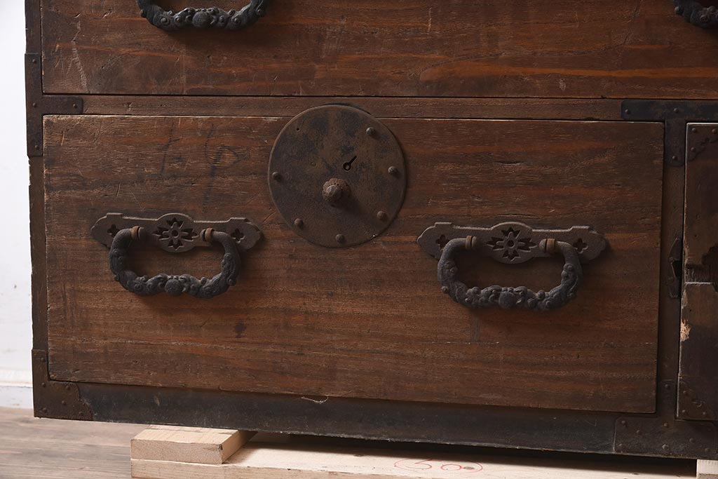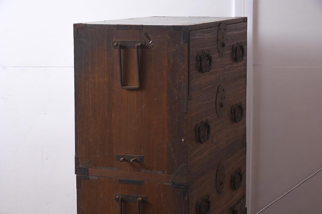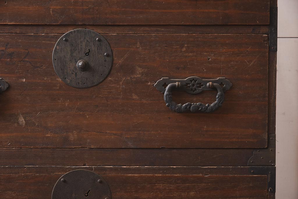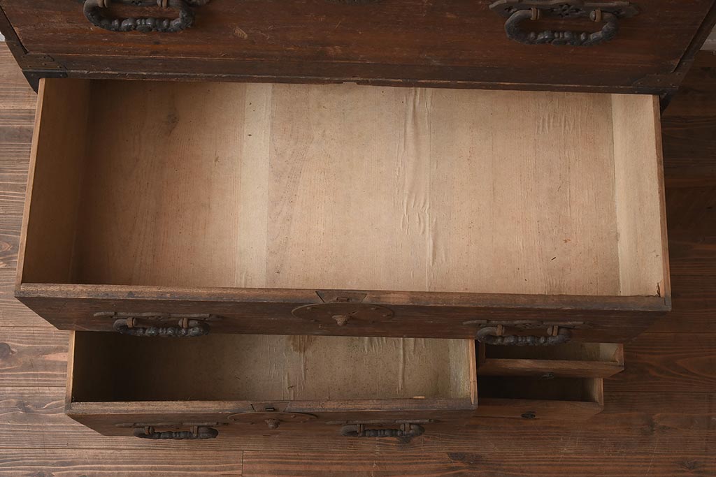 アンティーク家具 和製アンティーク 大正昭和初期 金具の意匠が珍しい!重ねの和箪笥(衣装箪笥、引き出し、チェスト)(R-043559)