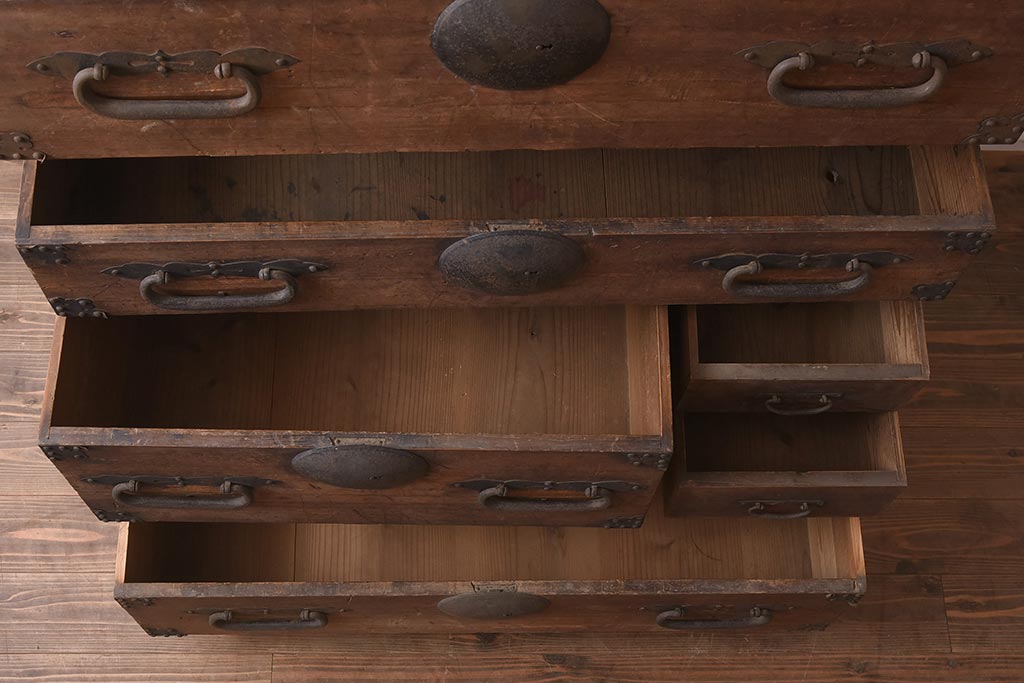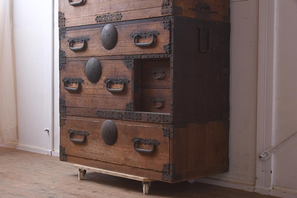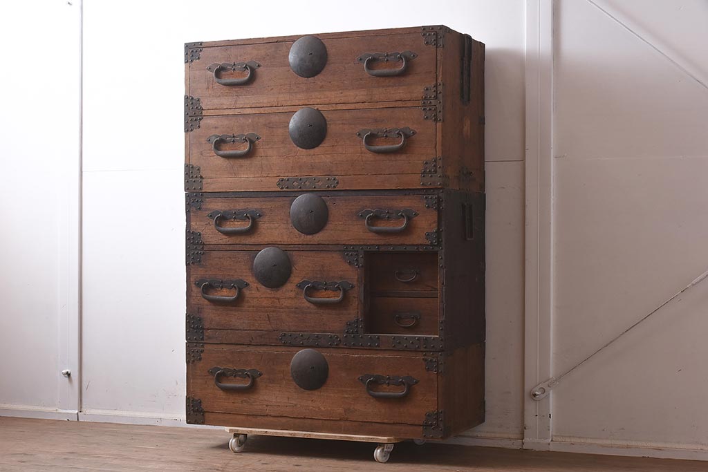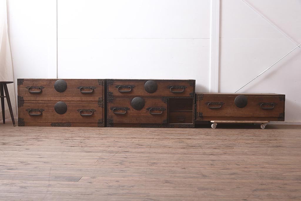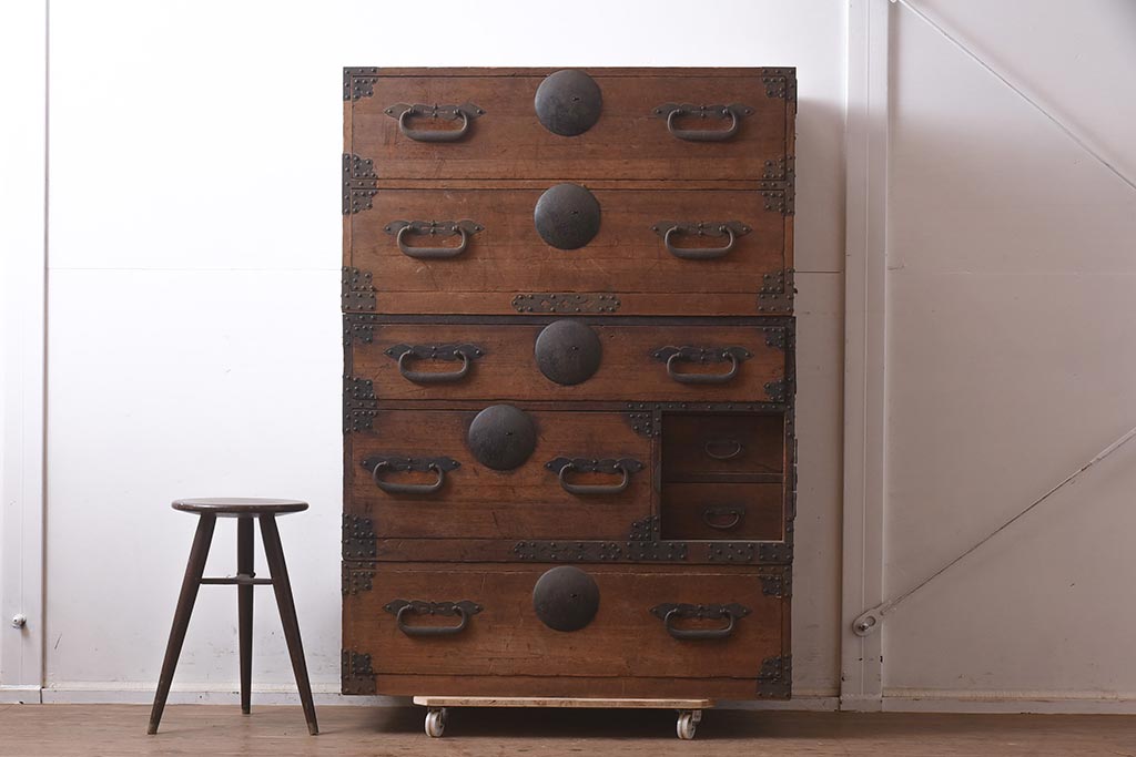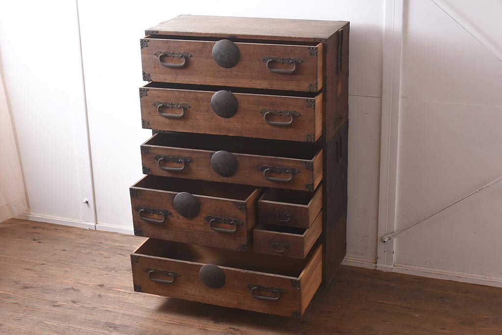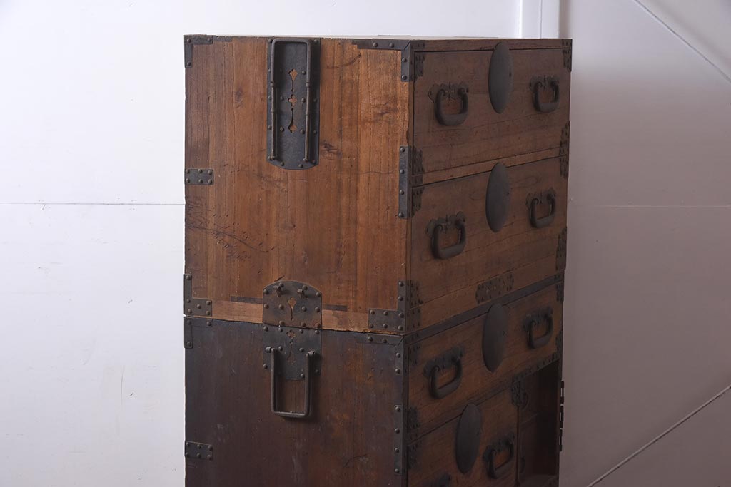 アンティーク家具 和製アンティーク 明治大正期 三段重ね 希少な五丁引き!和の趣漂う箪笥(重ね箪笥、衣装箪笥、引き出し)(R-043489)です。
