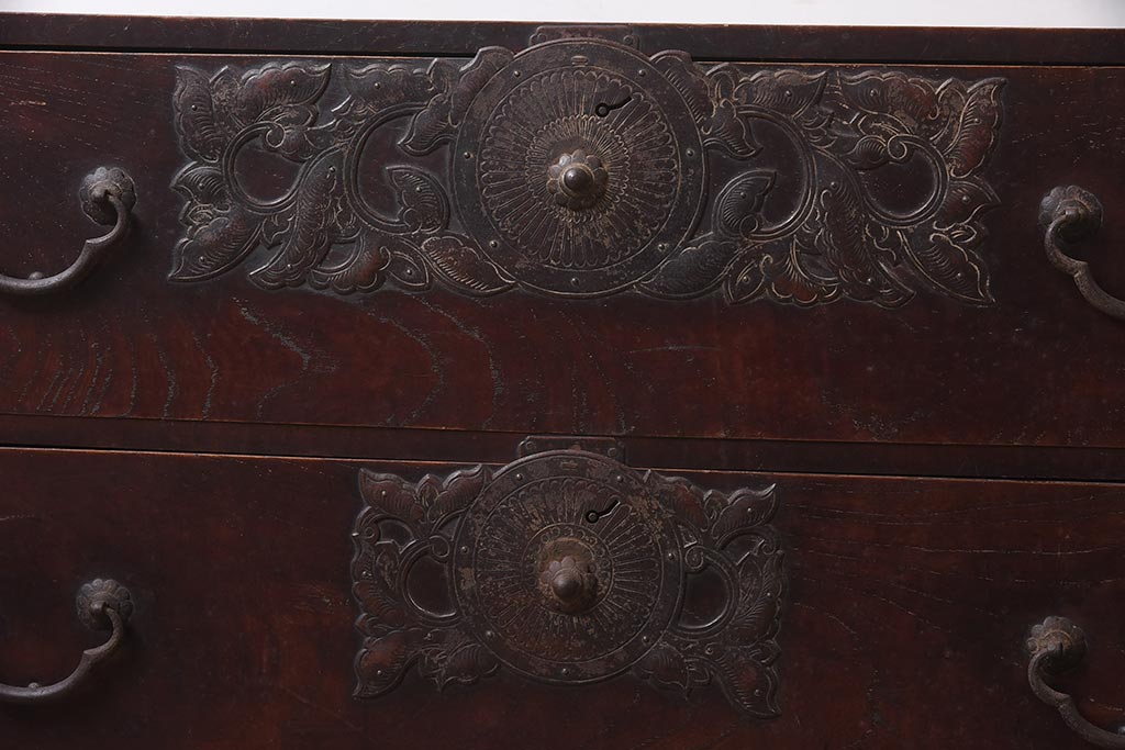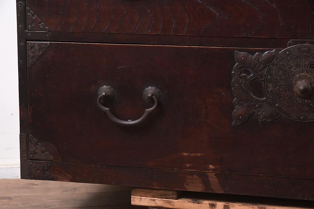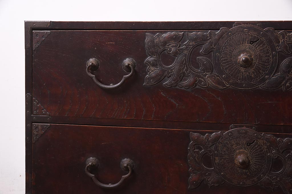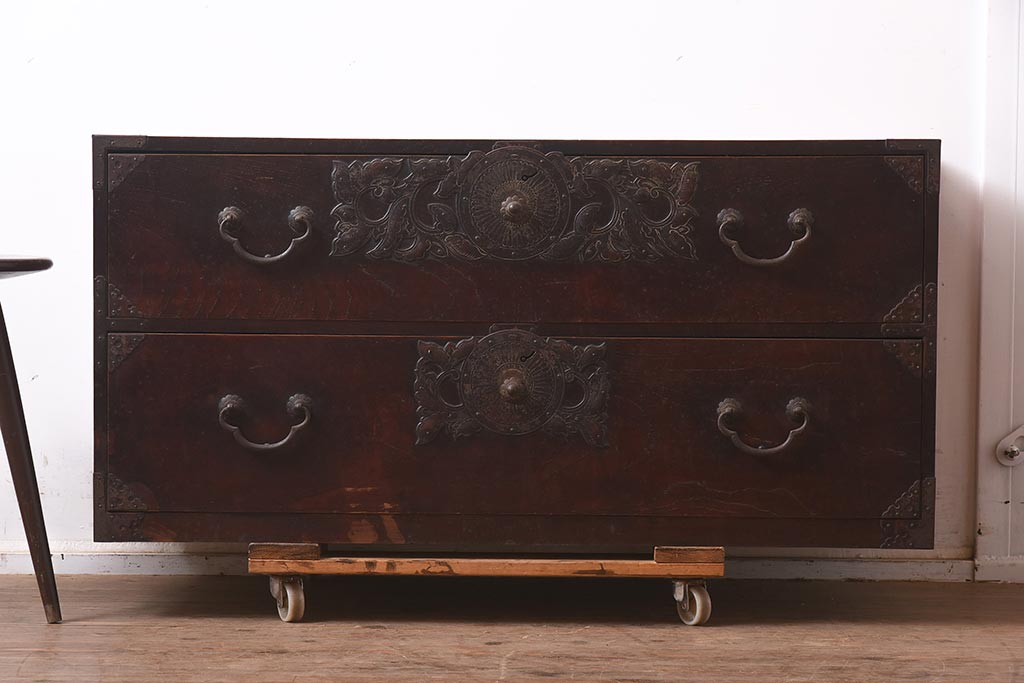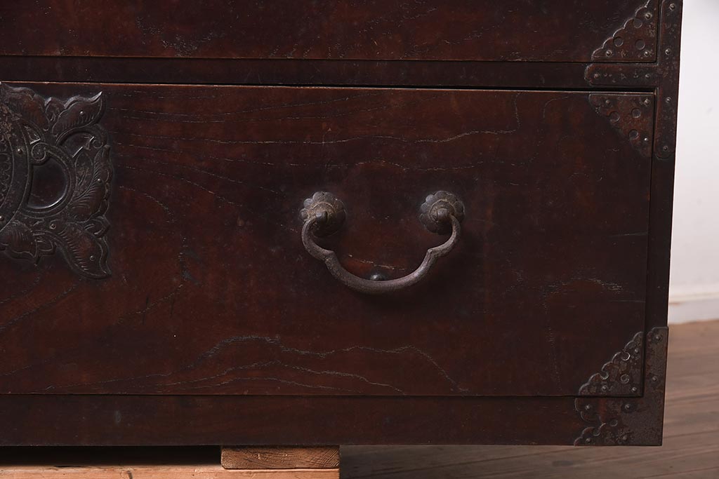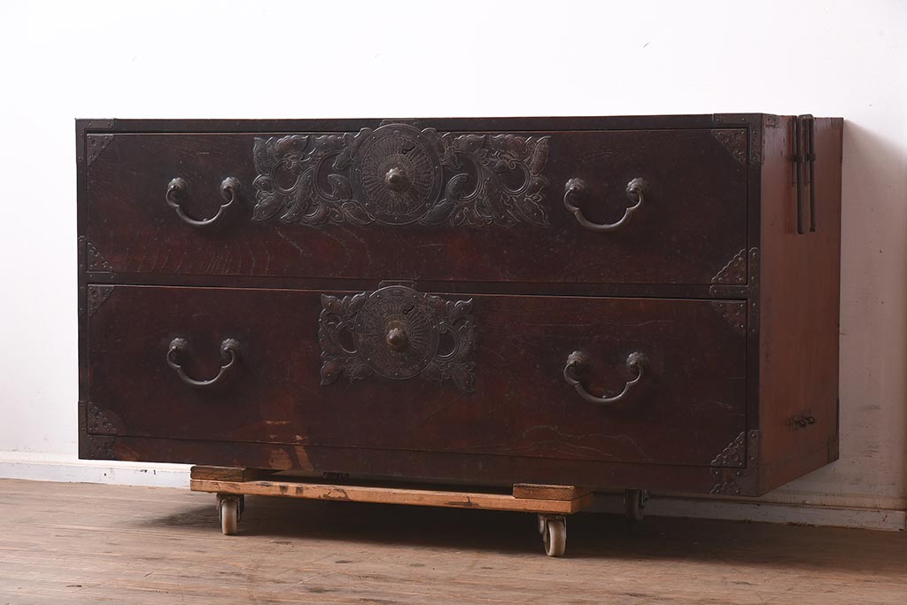 和箪笥 > アンティーク家具 明治大正期 前面ケヤキ材 迫力ある金具の仙台箪笥ローボード(野郎箪笥、時代箪笥、衣装箪笥、テレビ台)(R-043601)
