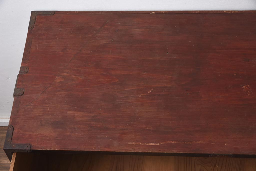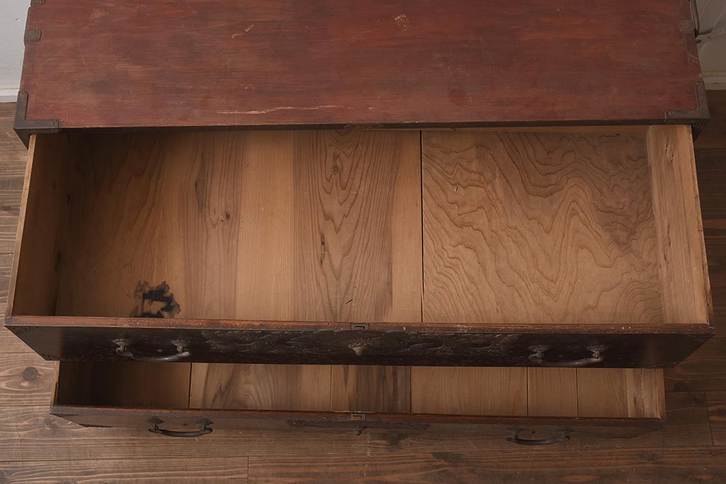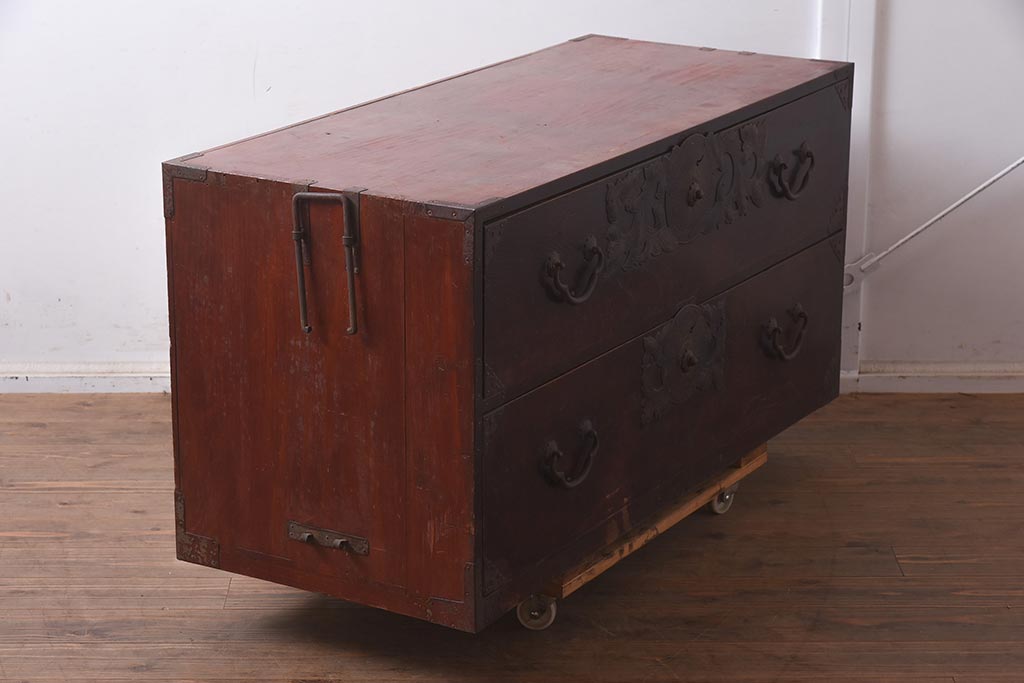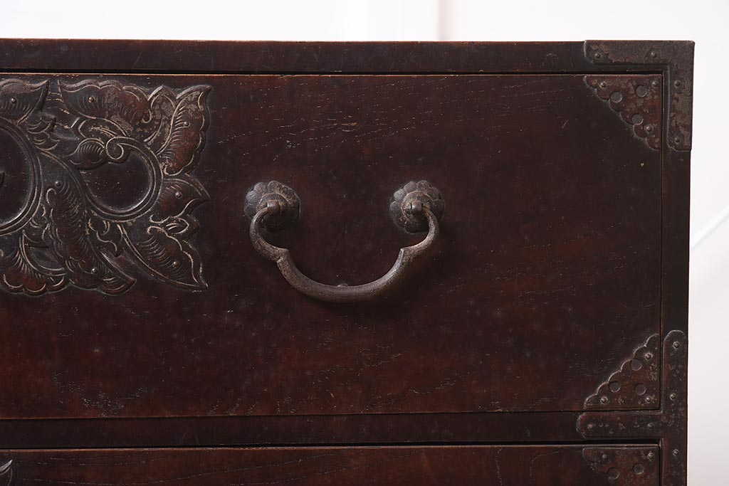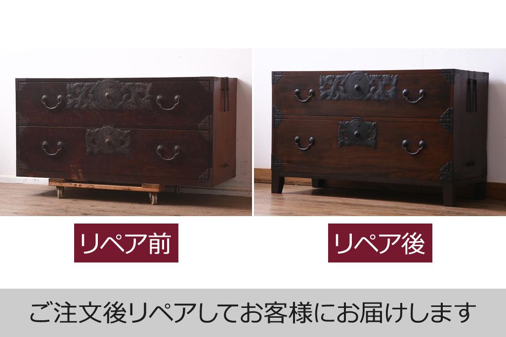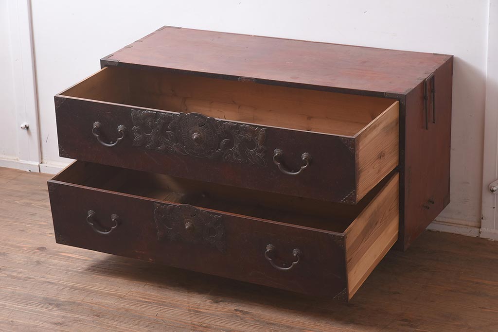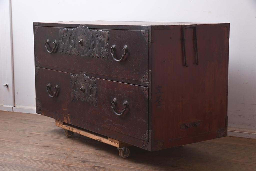 和箪笥 > アンティーク家具 明治大正期 前面ケヤキ材 迫力ある金具の仙台箪笥ローボード(野郎箪笥、時代箪笥、衣装箪笥、テレビ台)(R-043601)