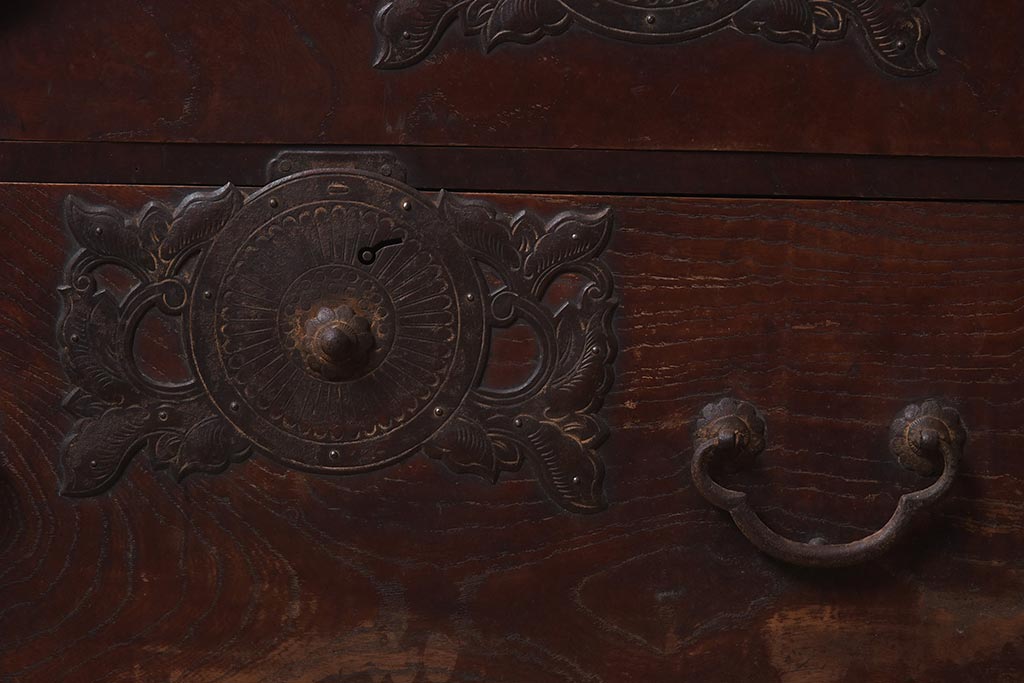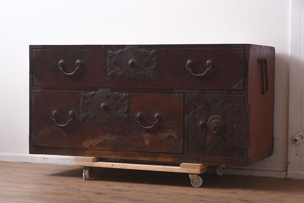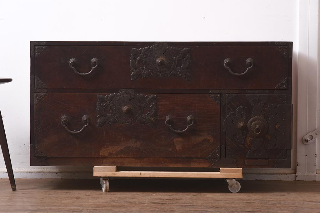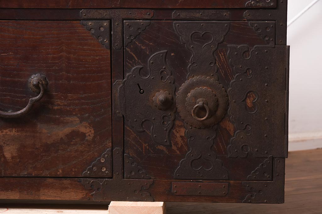 和箪笥 > アンティーク家具 明治大正期 前面ケヤキ材 迫力ある金具の仙台箪笥ローボード(野郎箪笥、時代箪笥、衣装箪笥、テレビ台)(R-043602)