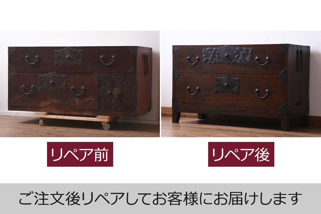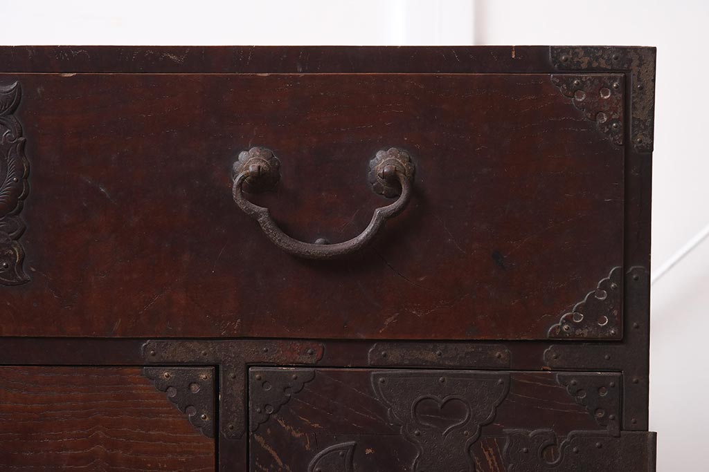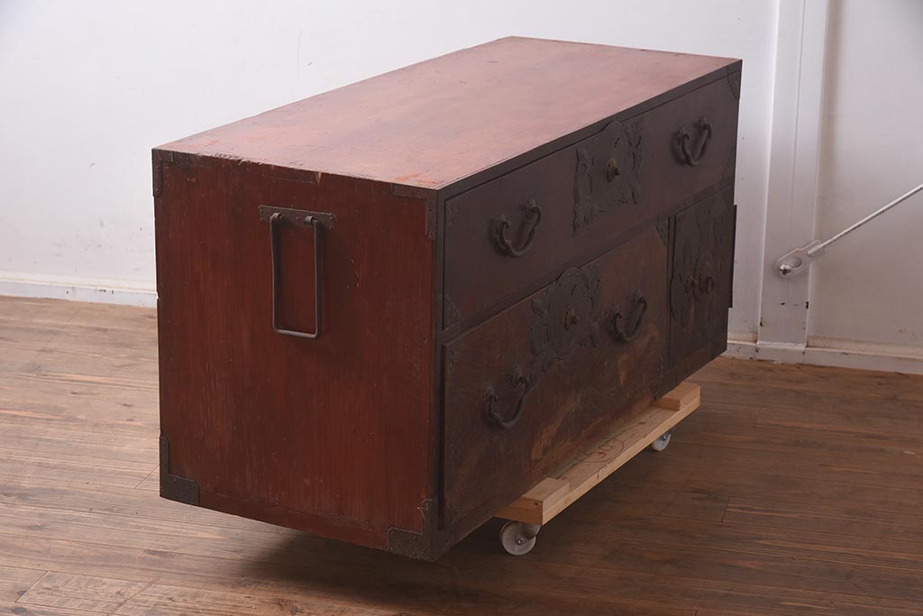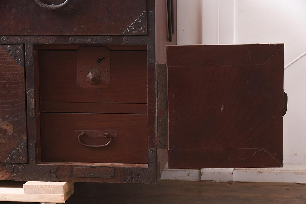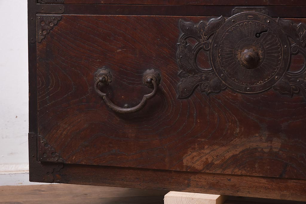 和箪笥 > アンティーク家具 明治大正期 前面ケヤキ材 迫力ある金具の仙台箪笥ローボード(野郎箪笥、時代箪笥、衣装箪笥、テレビ台)(R-043602)