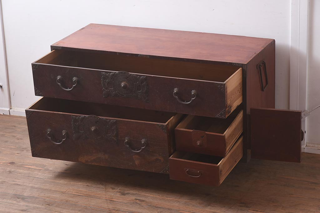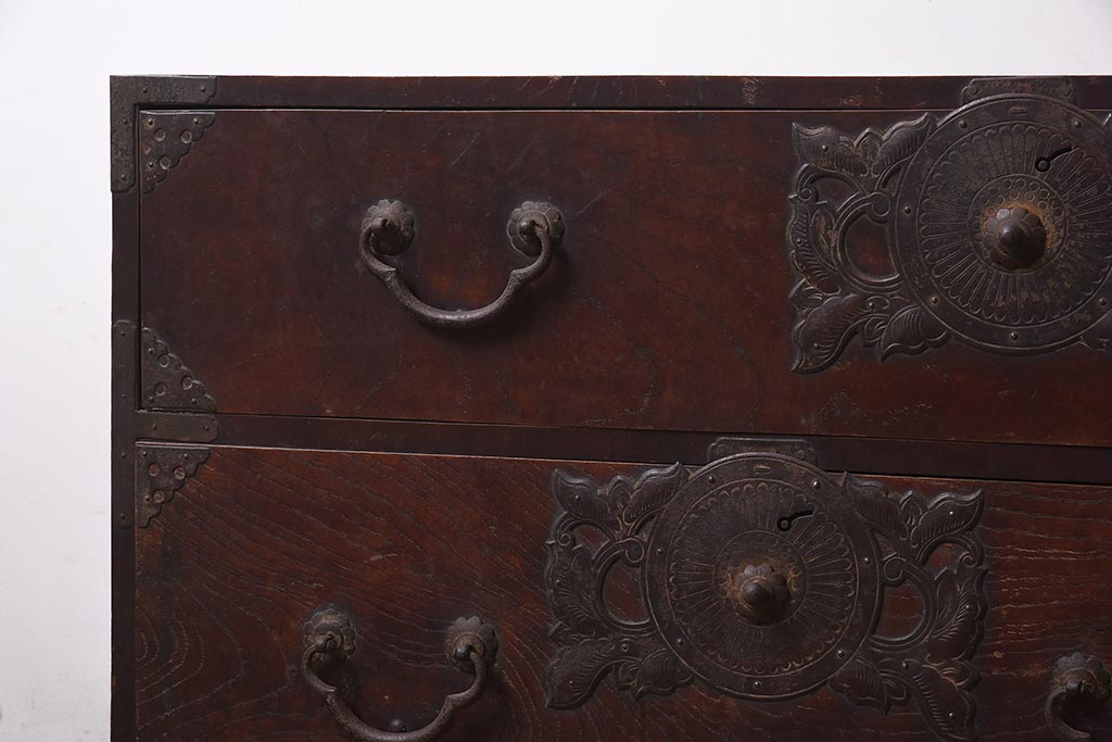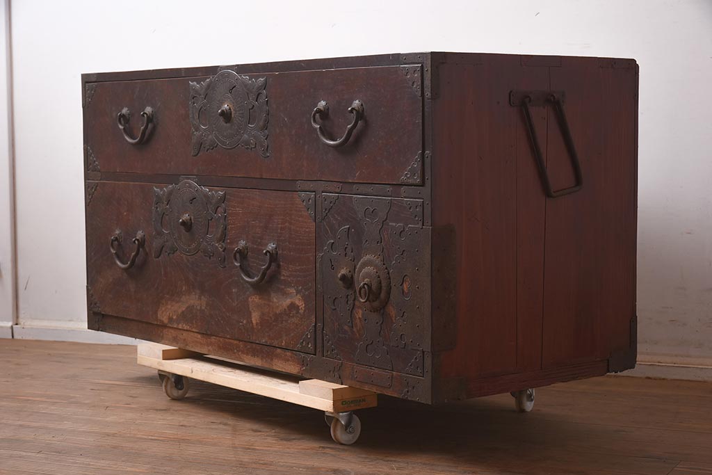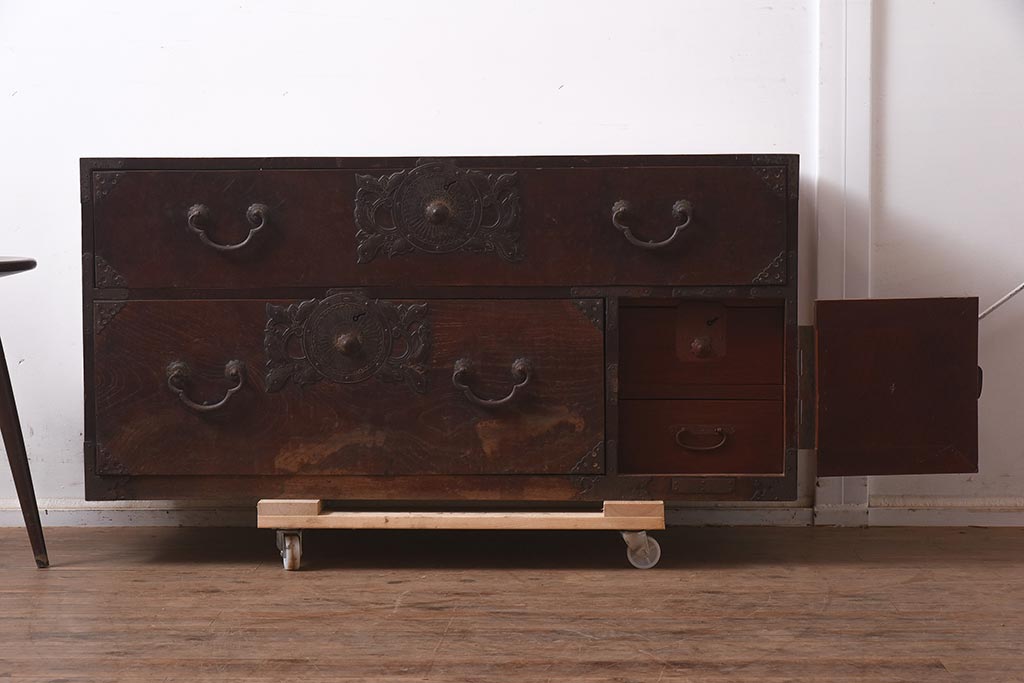 和箪笥> 衣装箪笥 > アンティーク家具 明治大正期 前面ケヤキ材 迫力ある金具の仙台箪笥ローボード(野郎箪笥、時代箪笥、衣装箪笥、テレビ台)(R-043602)
