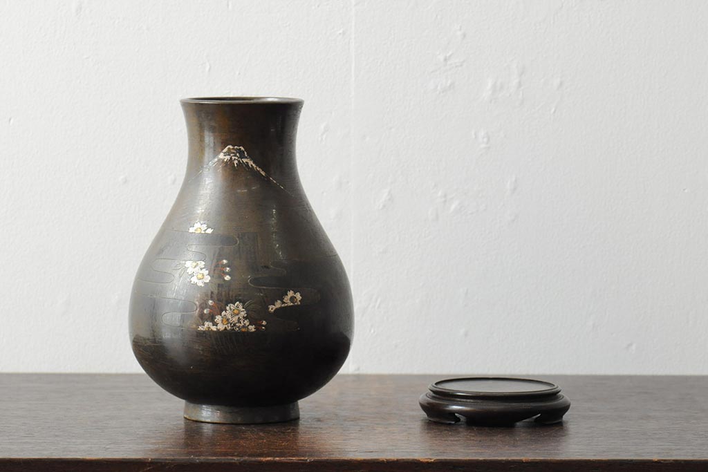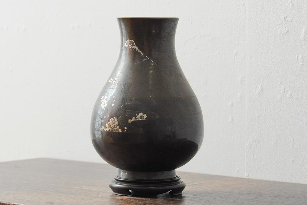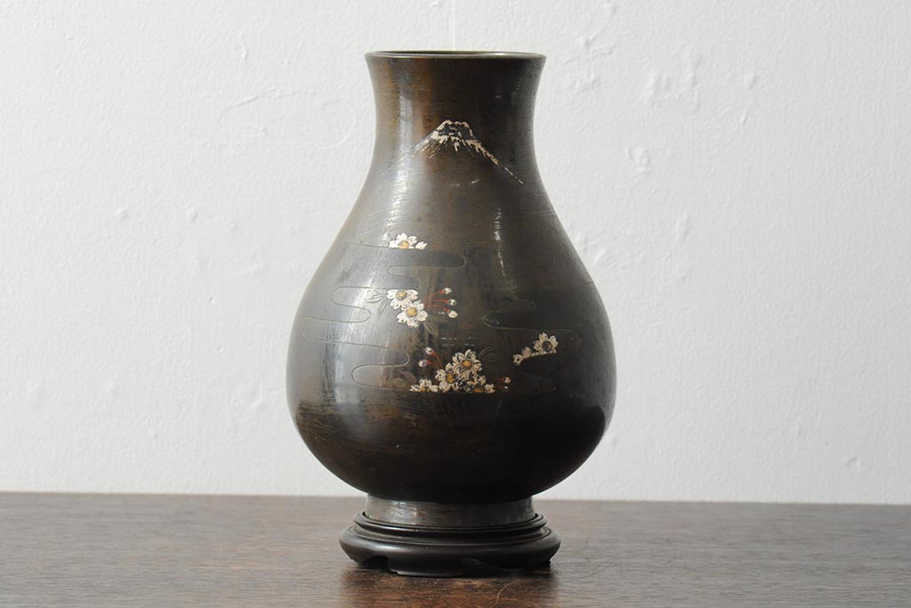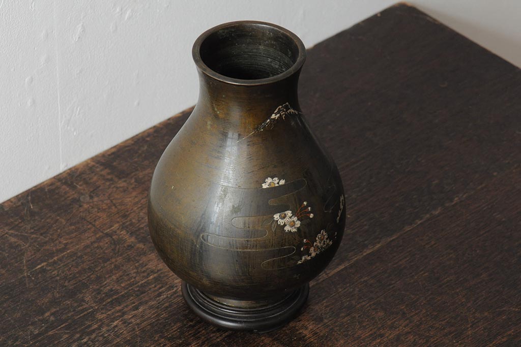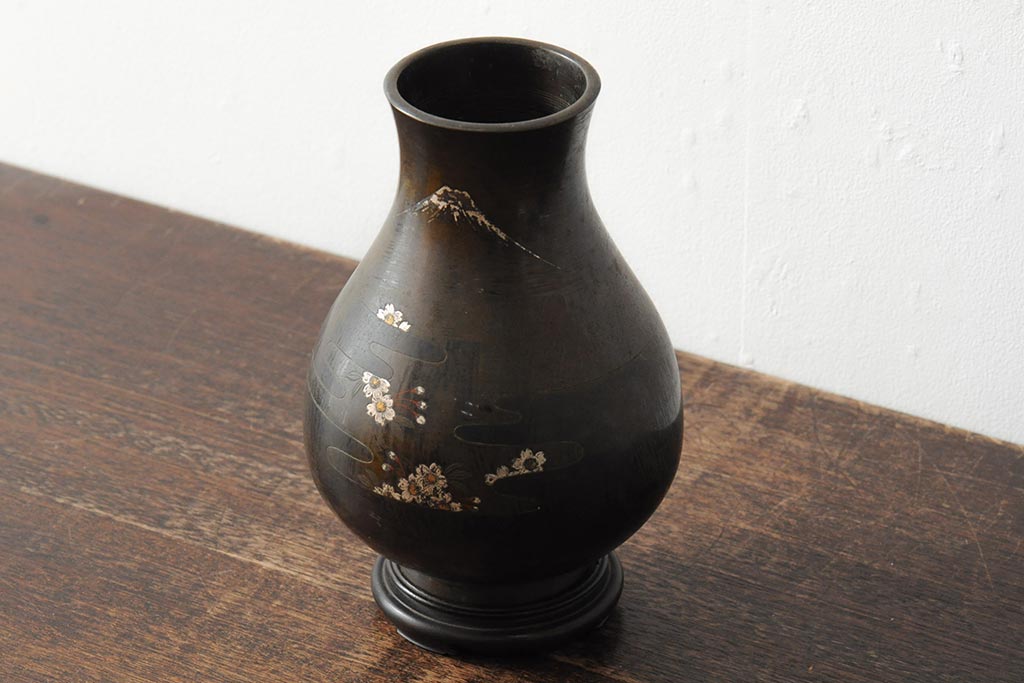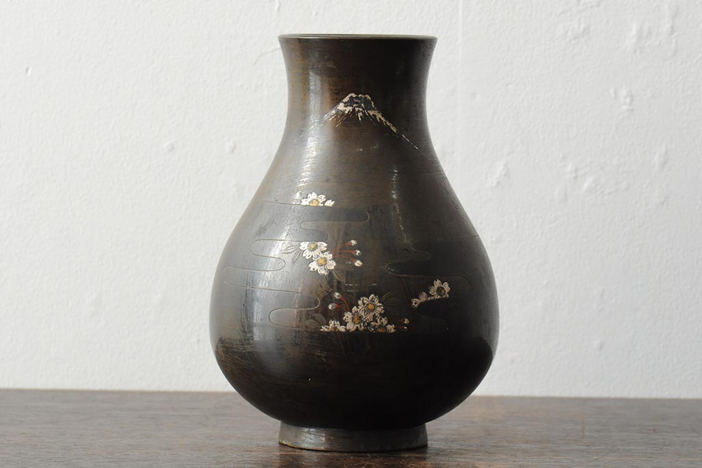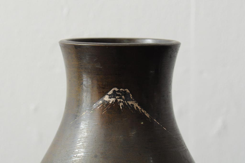 アンティーク雑貨 大正昭和初期 花に富士山図 銀象嵌彫金花瓶(菅原作蔵、花器、フラワーベース)(R-043519)