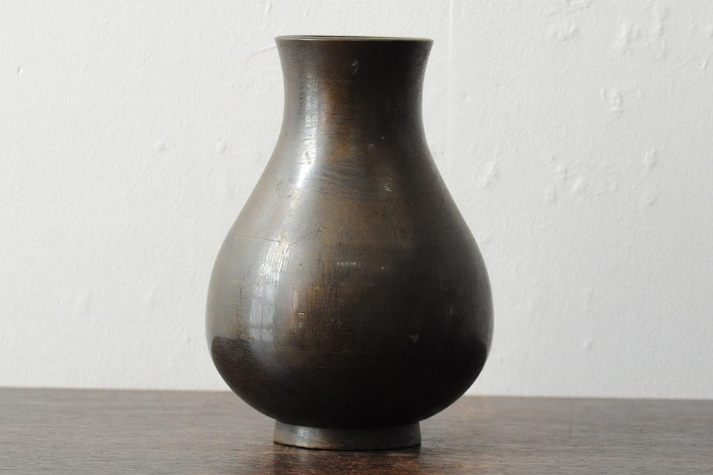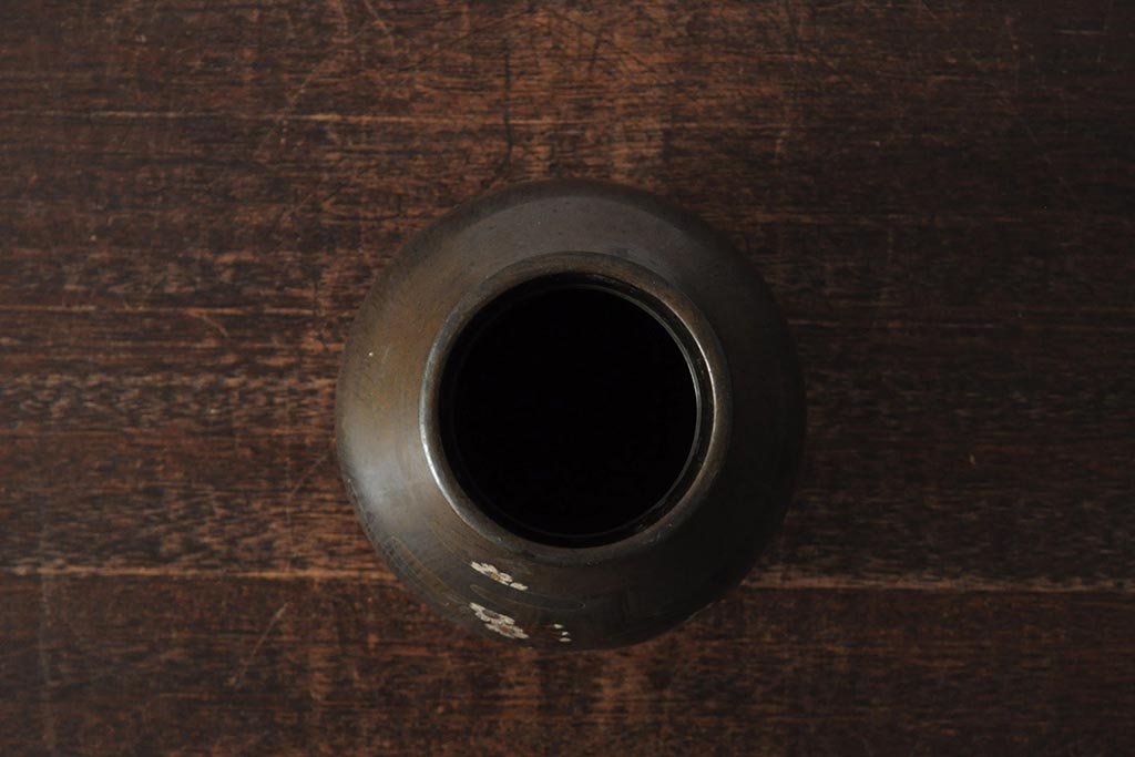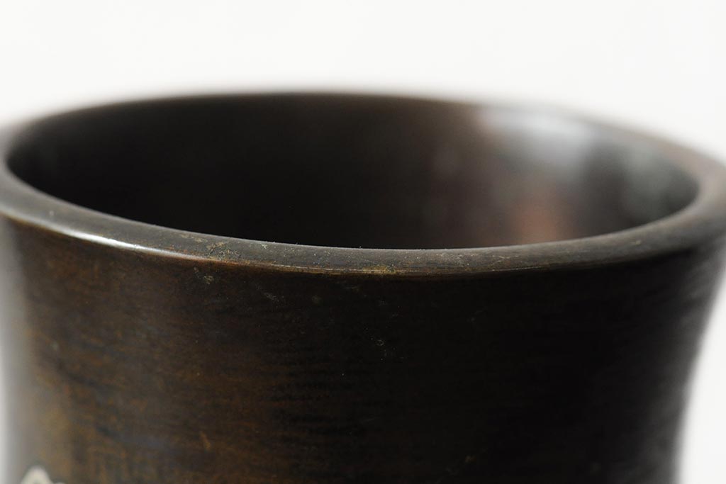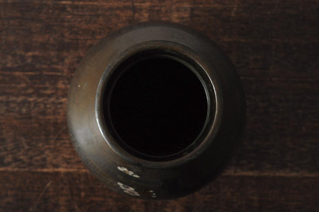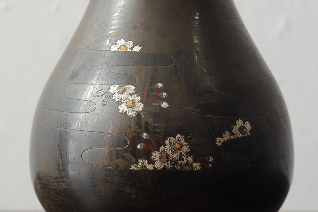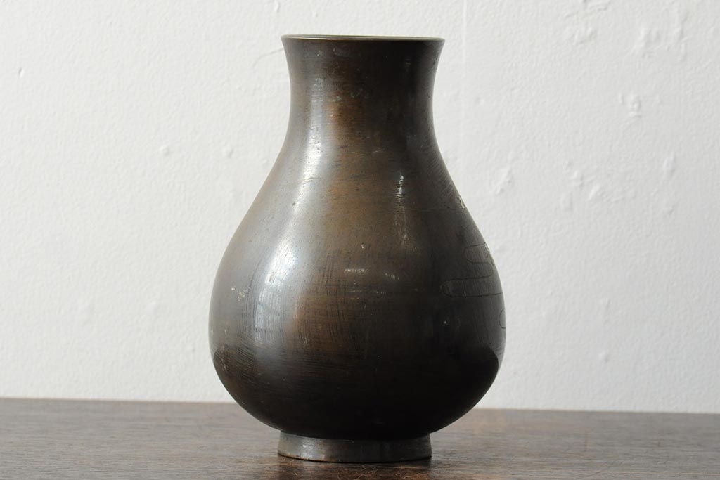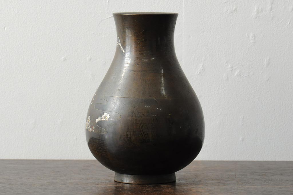アンティーク雑貨 大正昭和初期 花に富士山図 銀象嵌彫金花瓶(菅原作蔵、花器、フラワーベース)(R-043519)