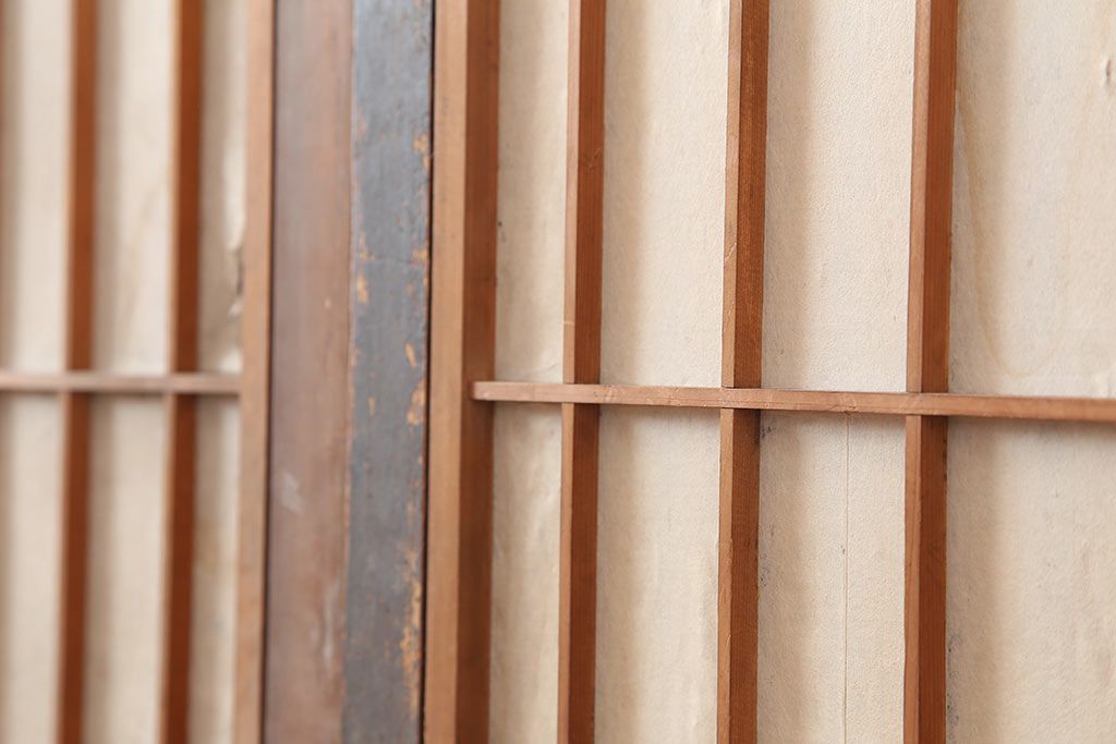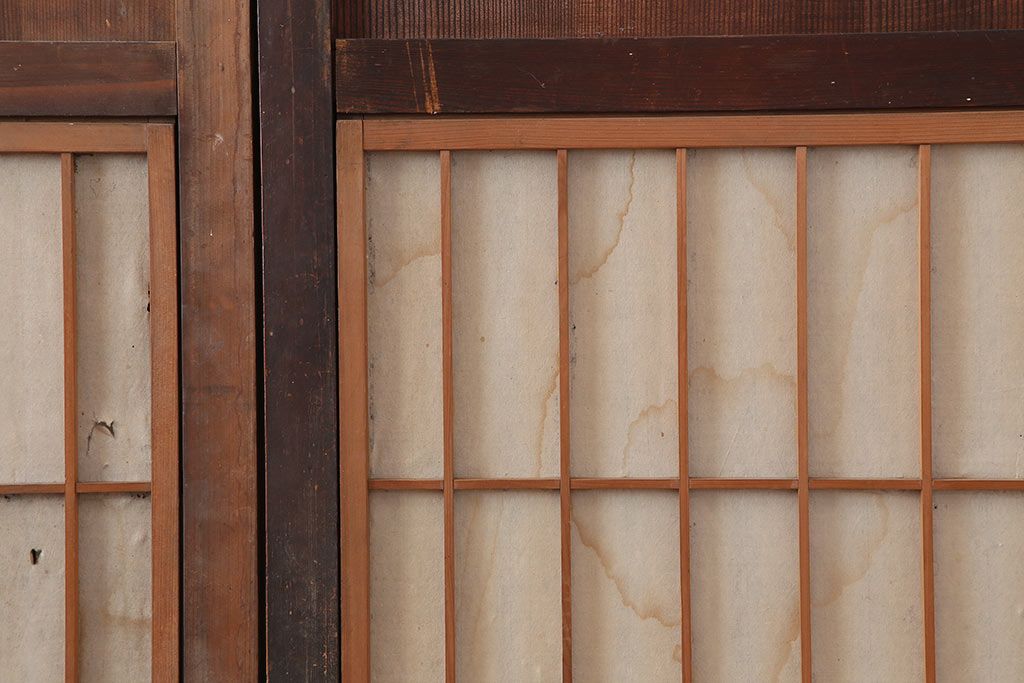 ラフジュ工房> ドア・建具> 障子戸 > アンティーク建具 大正昭和初期 裏障子付き 味わい深い木肌が魅力の格子帯戸4枚セット(引き戸)(R-043909)