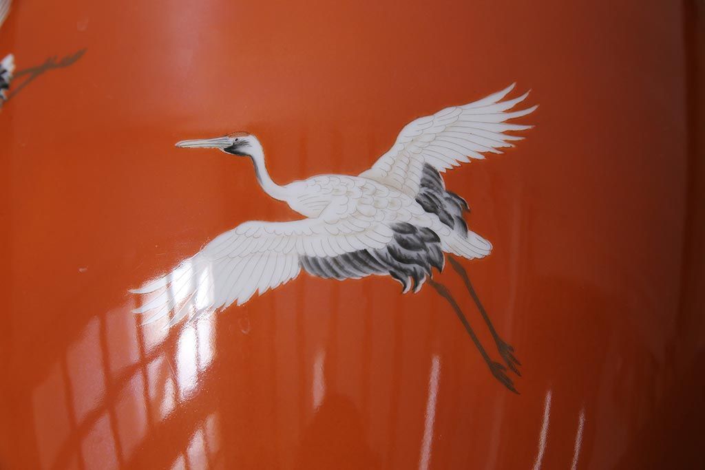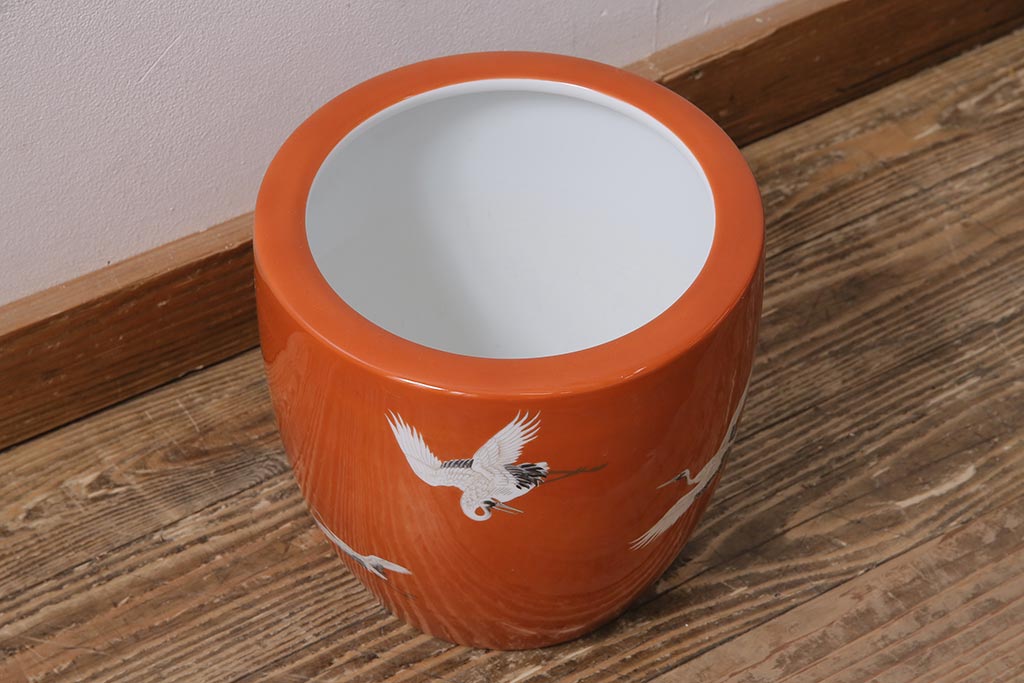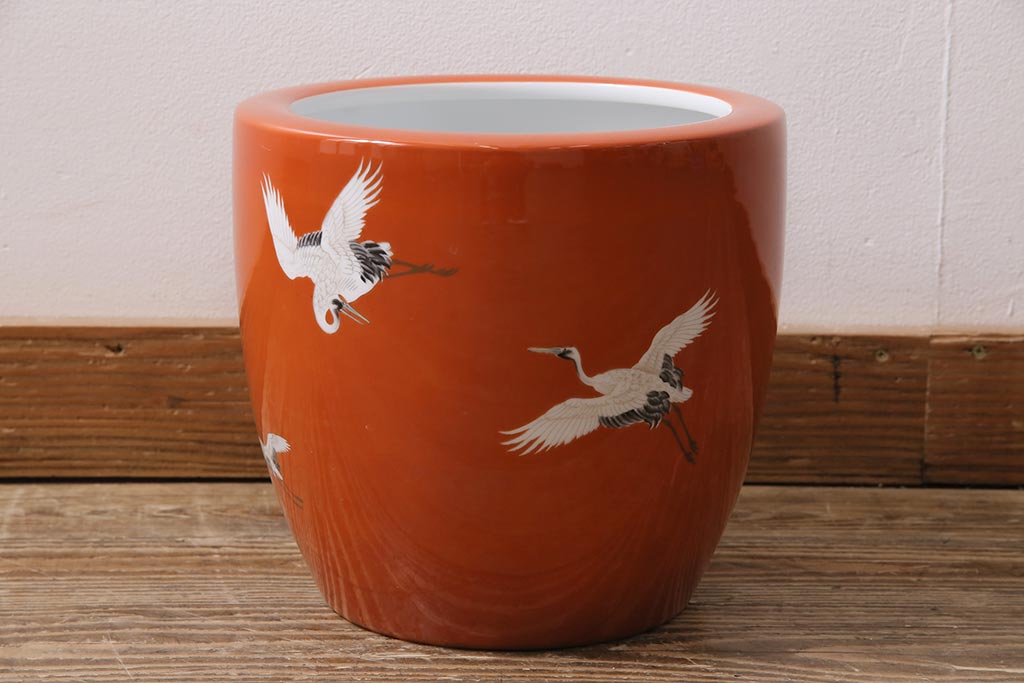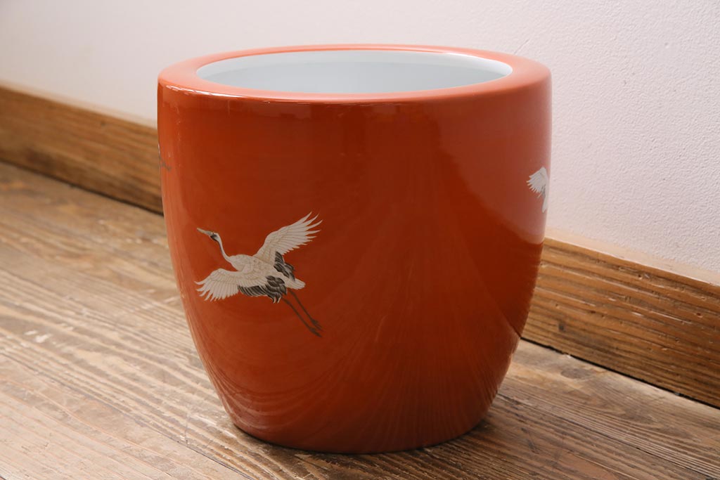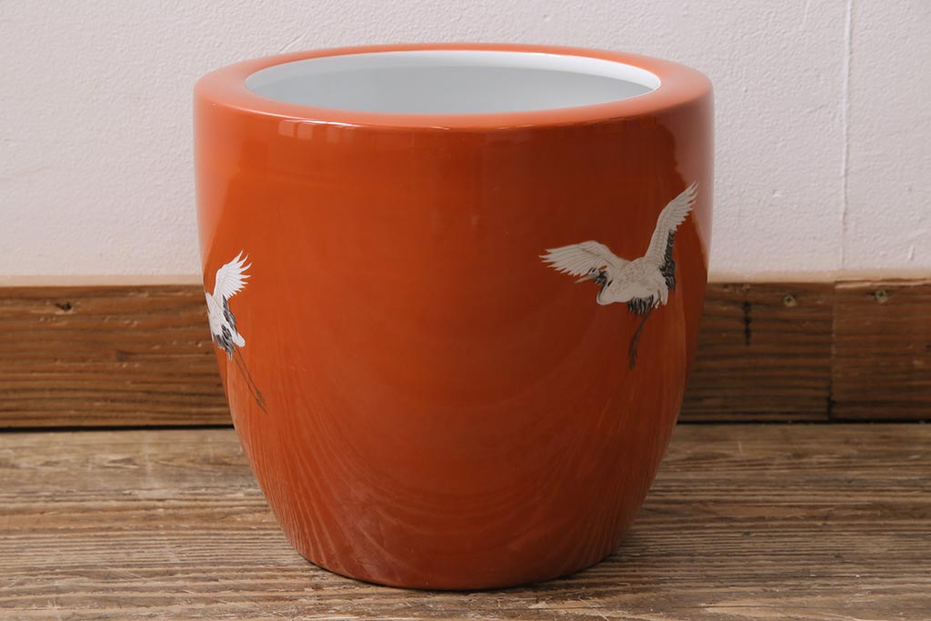 アンティーク雑貨 ノリタケ・則武(日陶) 鶴の図 朱色が目を引く小振りの瀬戸火鉢(手あぶり、鉢カバー)(R-043817)