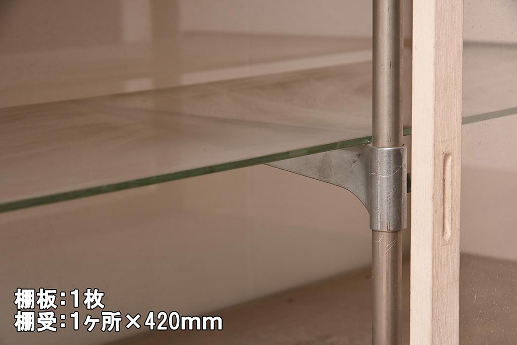 棚板は取り外しできます。棚板は1枚あります。棚受けは1ヶ所、420mmピッチで調整できます。棚幅サイズのものが1枚の作りです。