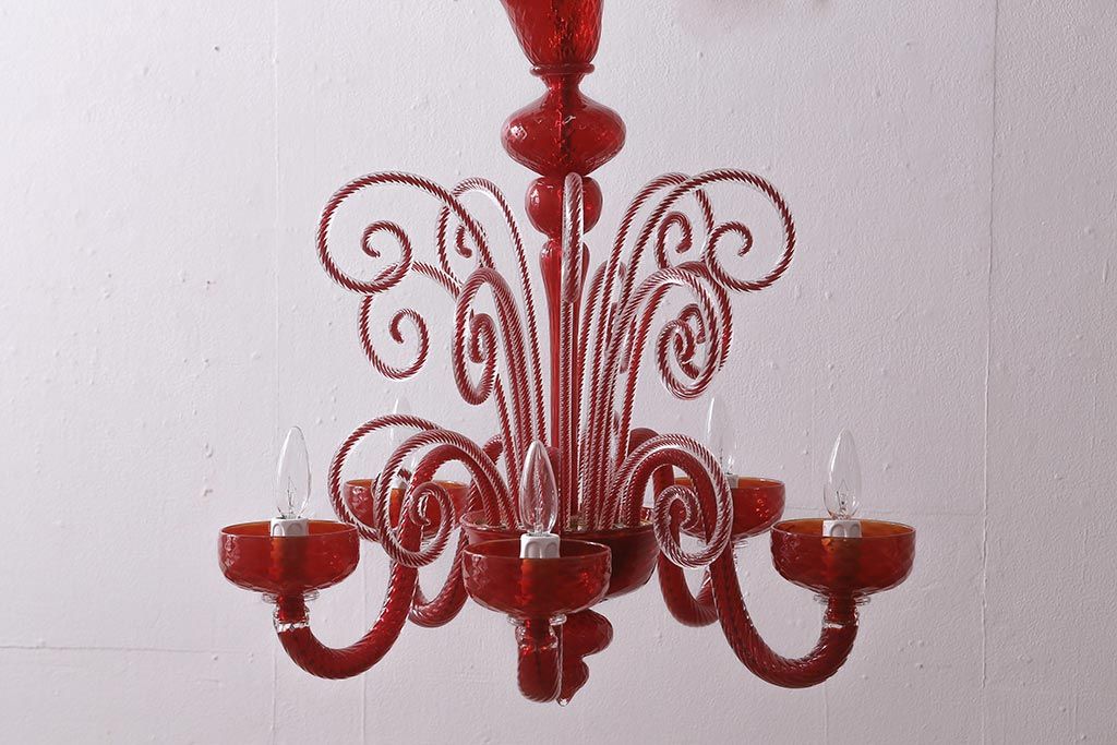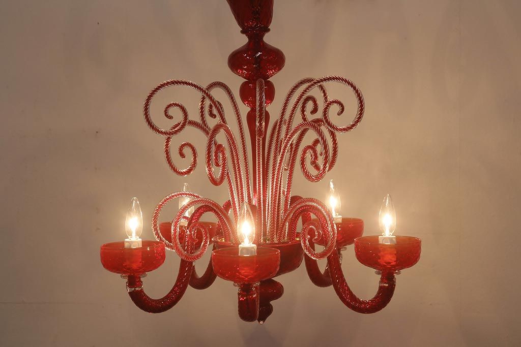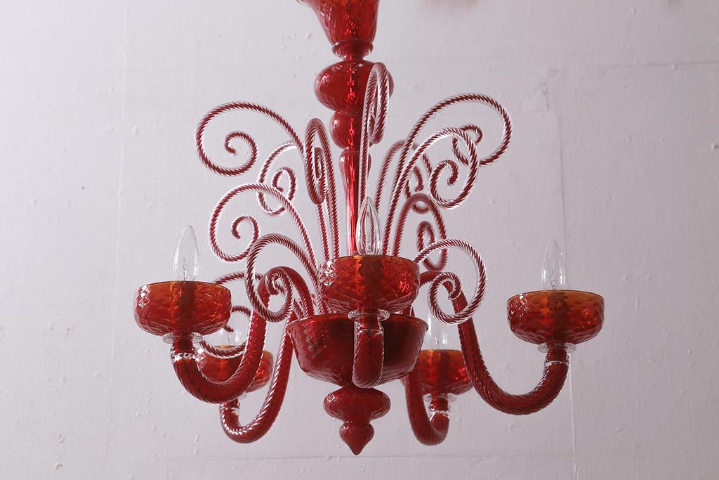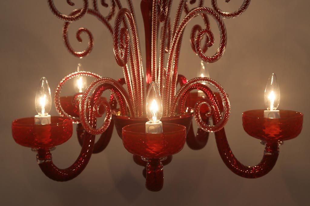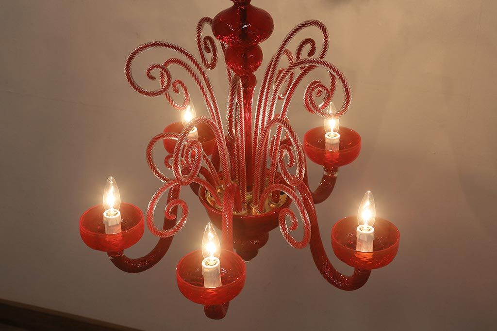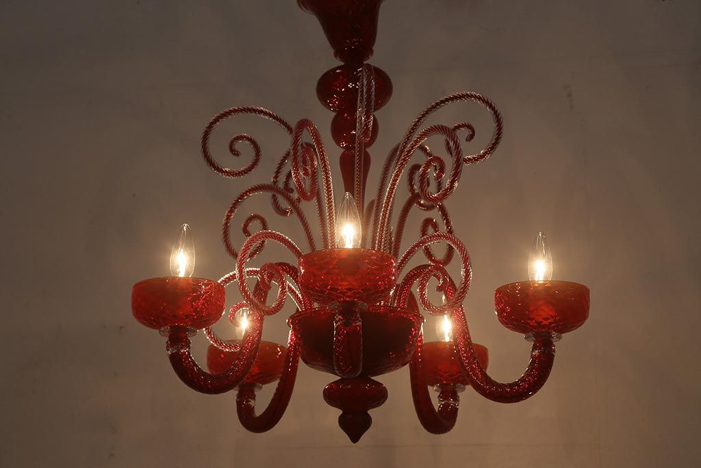 ラフジュ工房> 照明・ランプ> シャンデリア > 中古 SIGNORETTO LAMPADARI ムラノガラス(ベネチア) レッド インパクトのある5灯シャンデリア(天井照明)(R-043443)