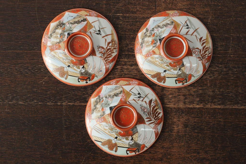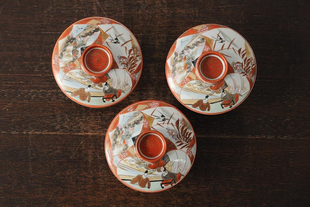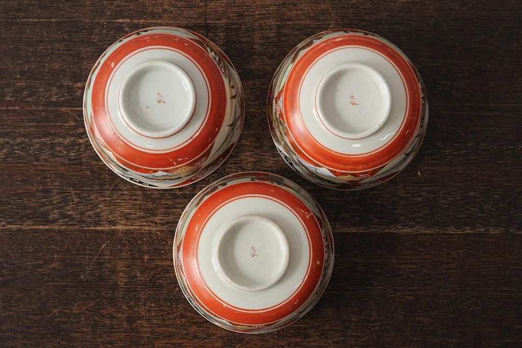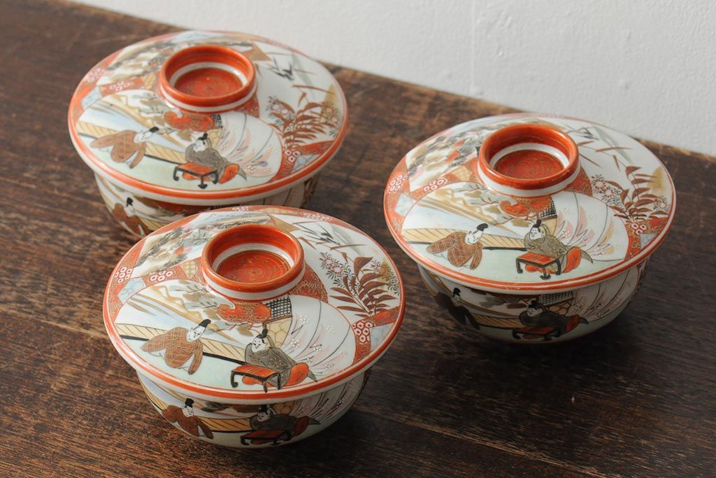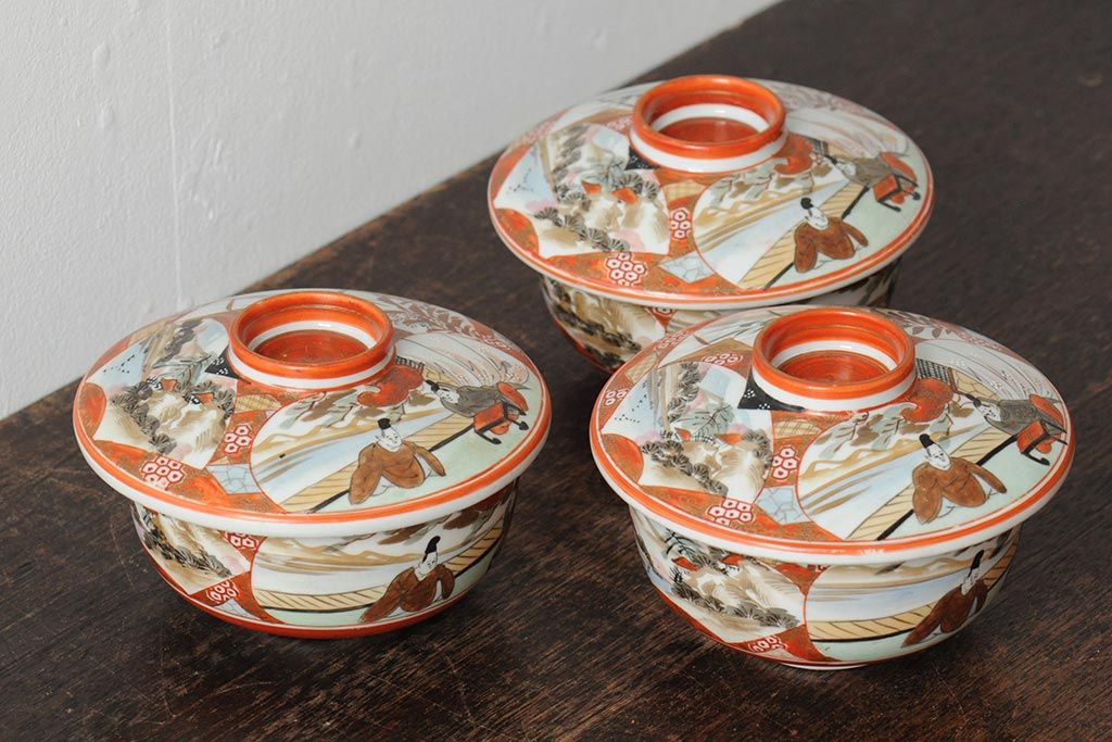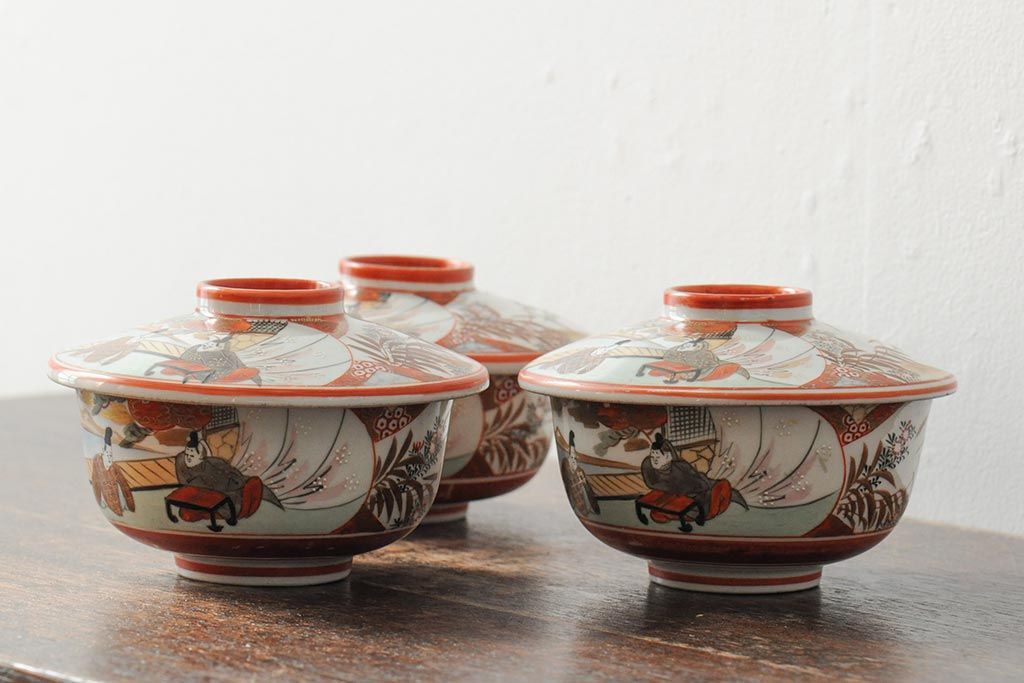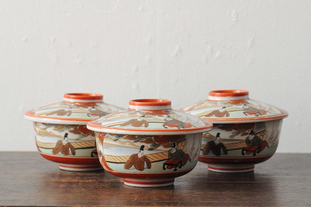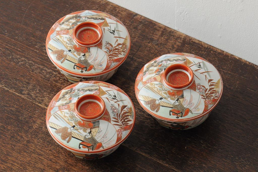 アンティーク雑貨 明治期 九谷焼赤絵蓋茶碗3客(和食器)(R-043515)