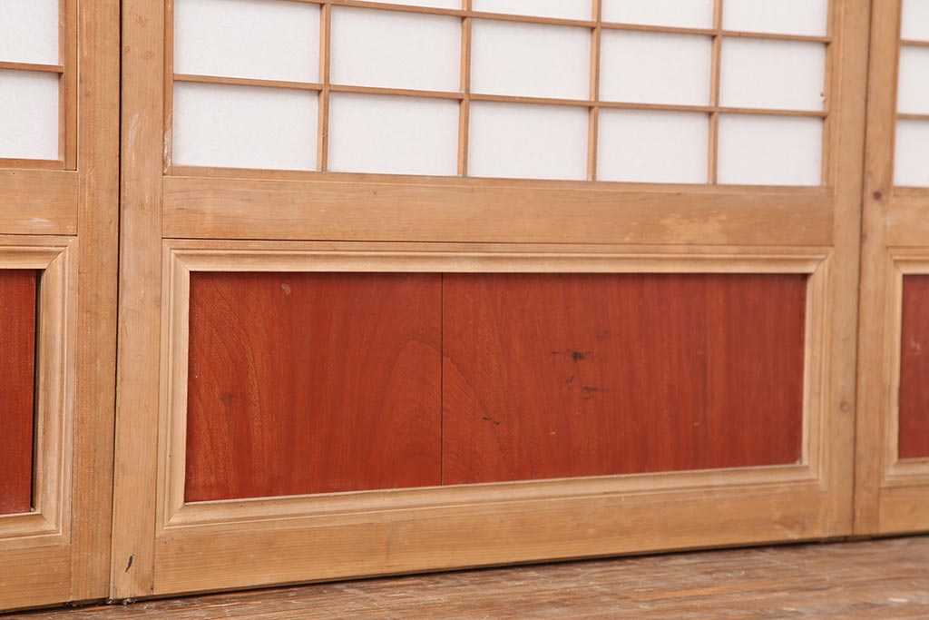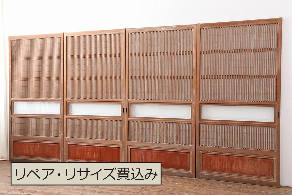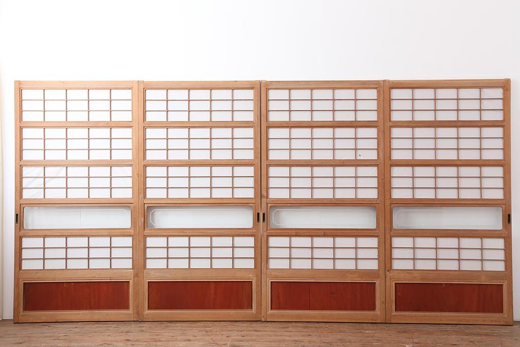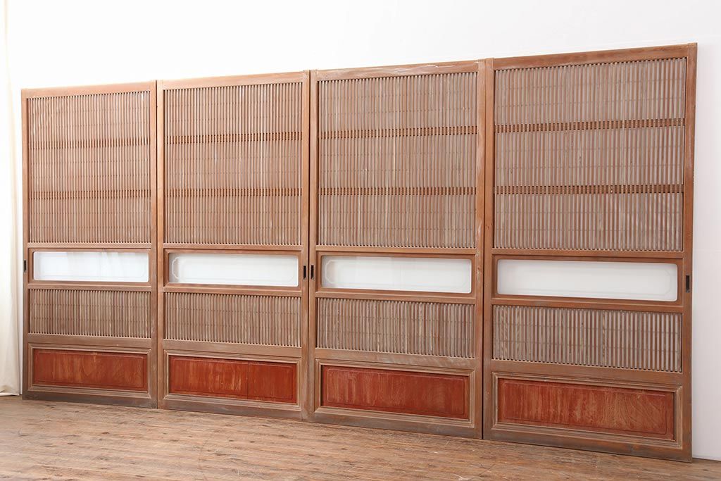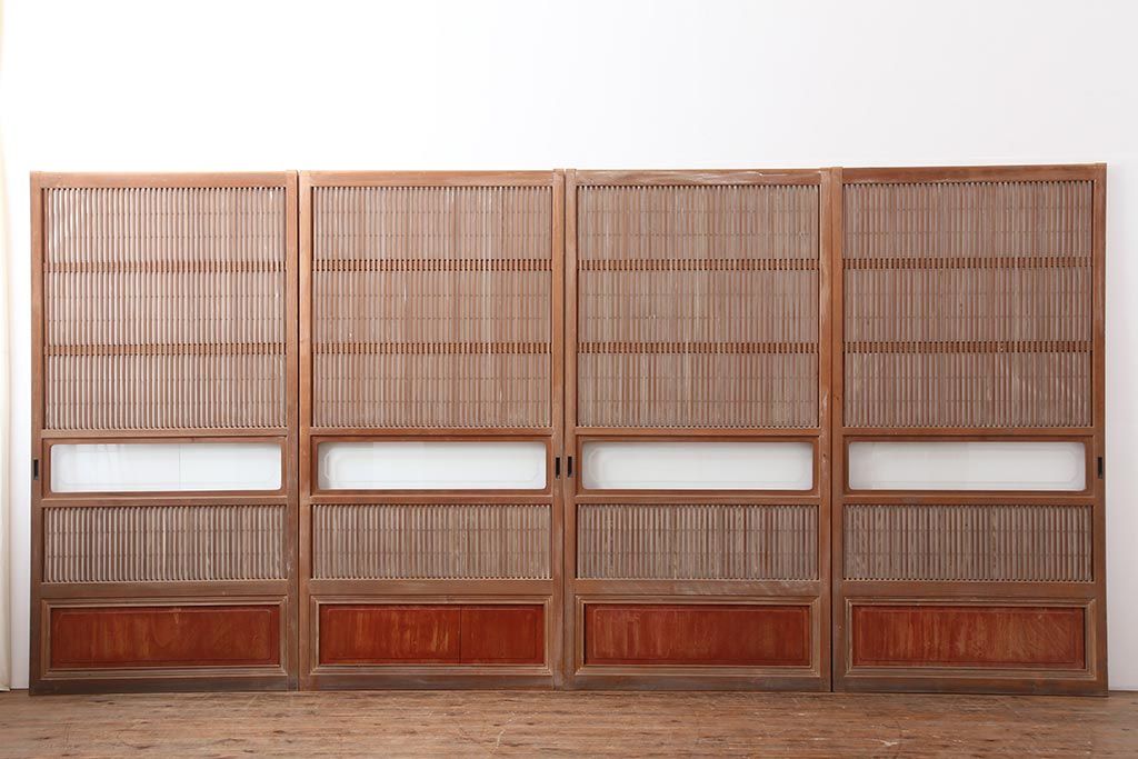 ラフジュ工房> ドア・建具> 格子戸 > アンティーク建具 昭和中期 腰板ケヤキ材 裏障子付きの格子戸4枚セット(建具、ガラス帯戸、引き戸)(R-043866)