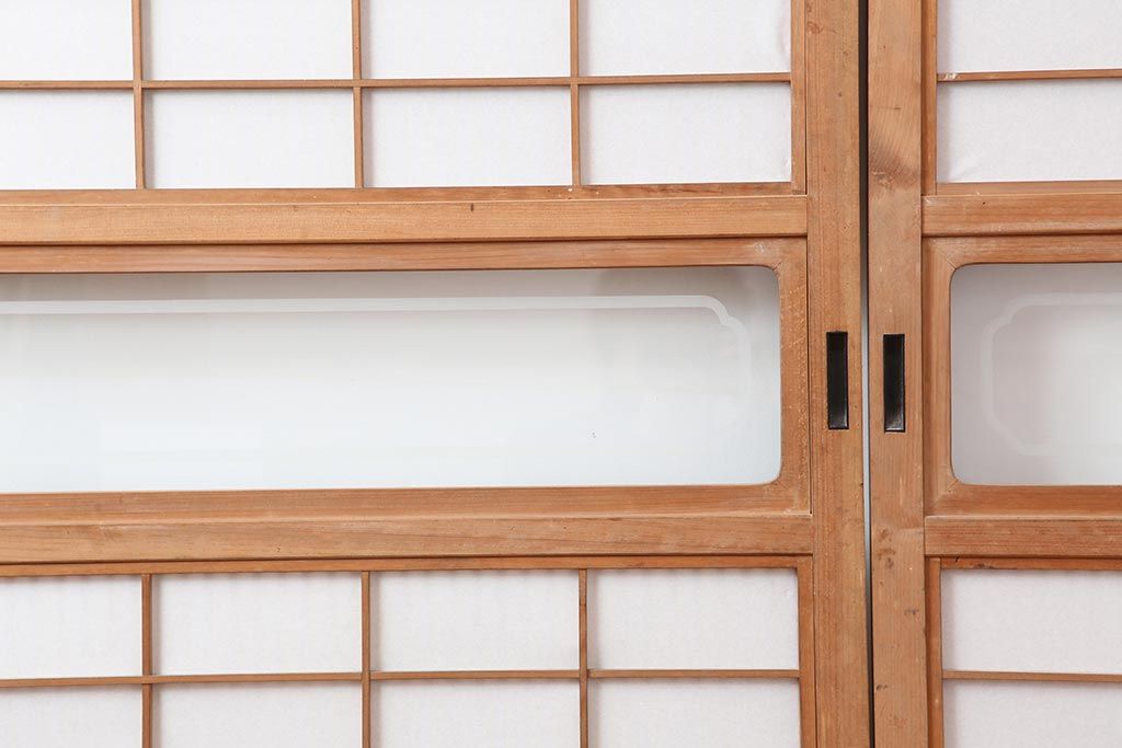 アンティーク建具 昭和中期 腰板ケヤキ材 裏障子付きの格子戸4枚セット(建具、ガラス帯戸、引き戸)(R-043866)