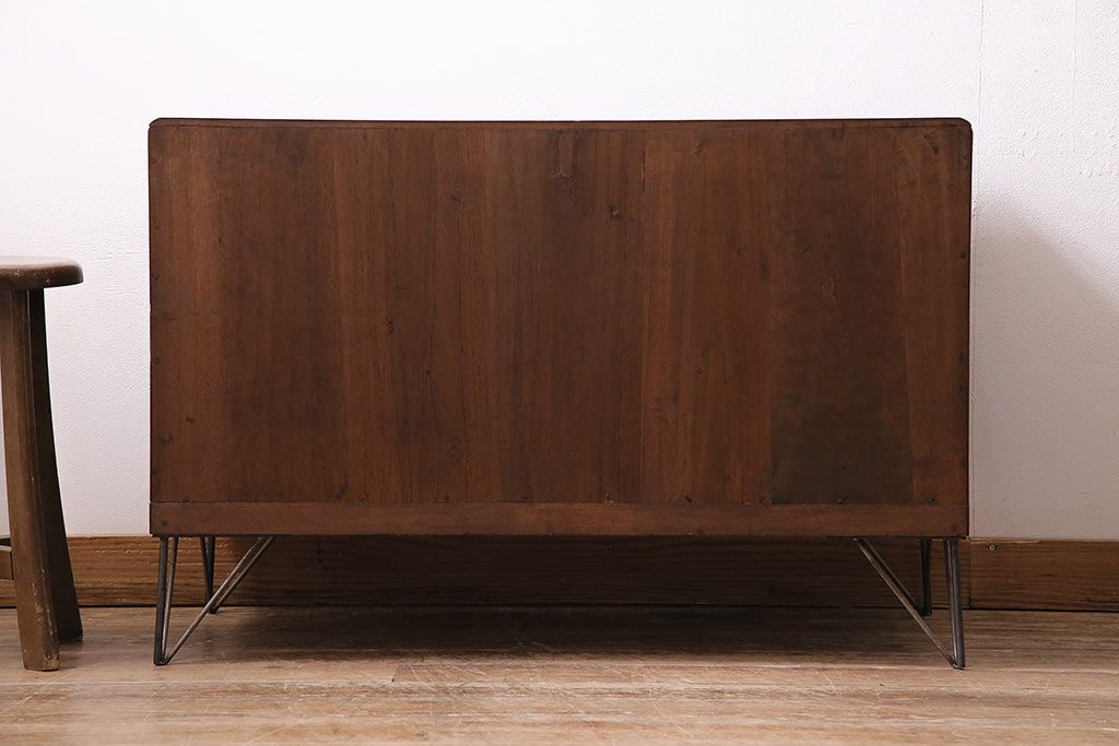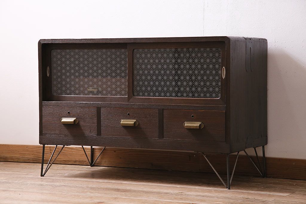 レトロ家具 当店オリジナルガラス 桐材 鉄脚付き 味のある雰囲気が魅力のリメイク箪笥ローボード(テレビ台、収納棚、リビングボード)(R-043895)です。
