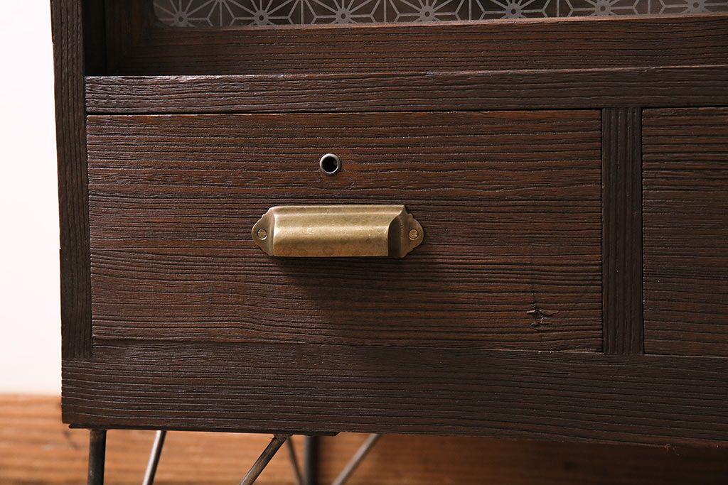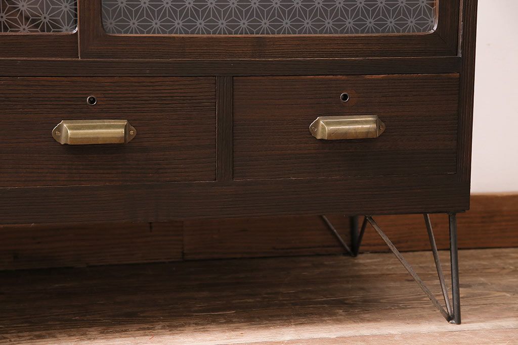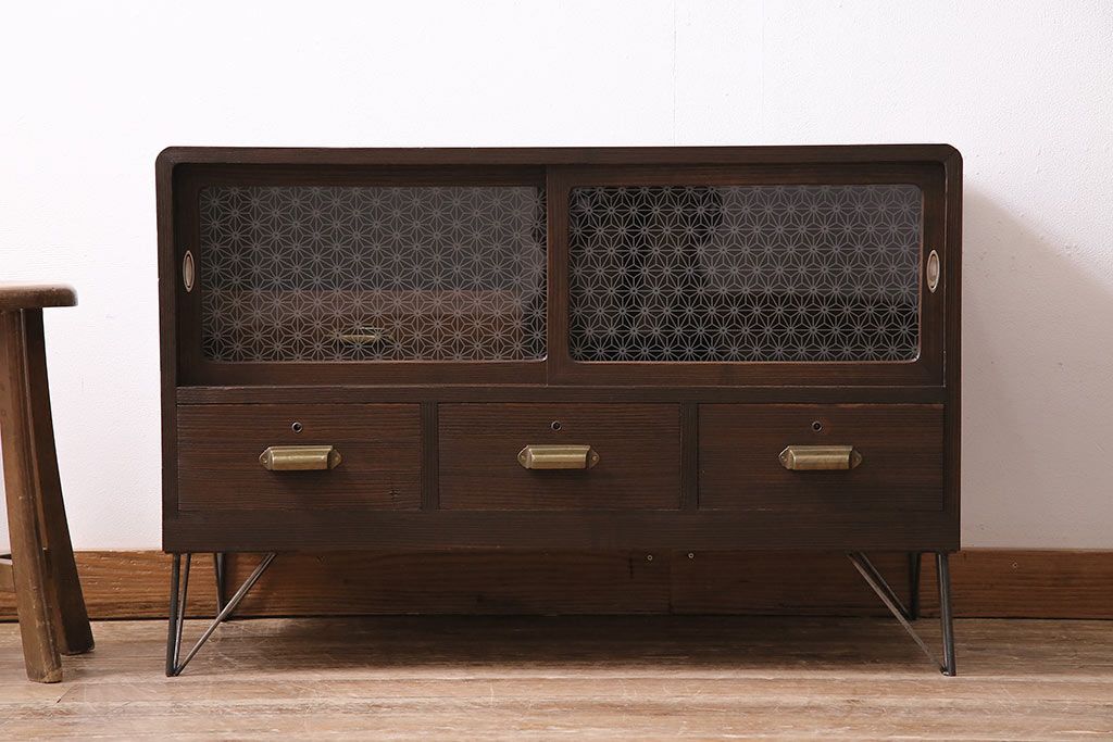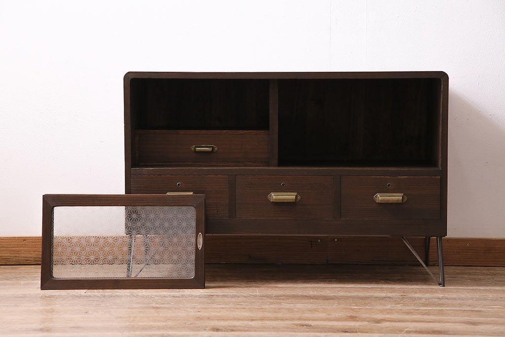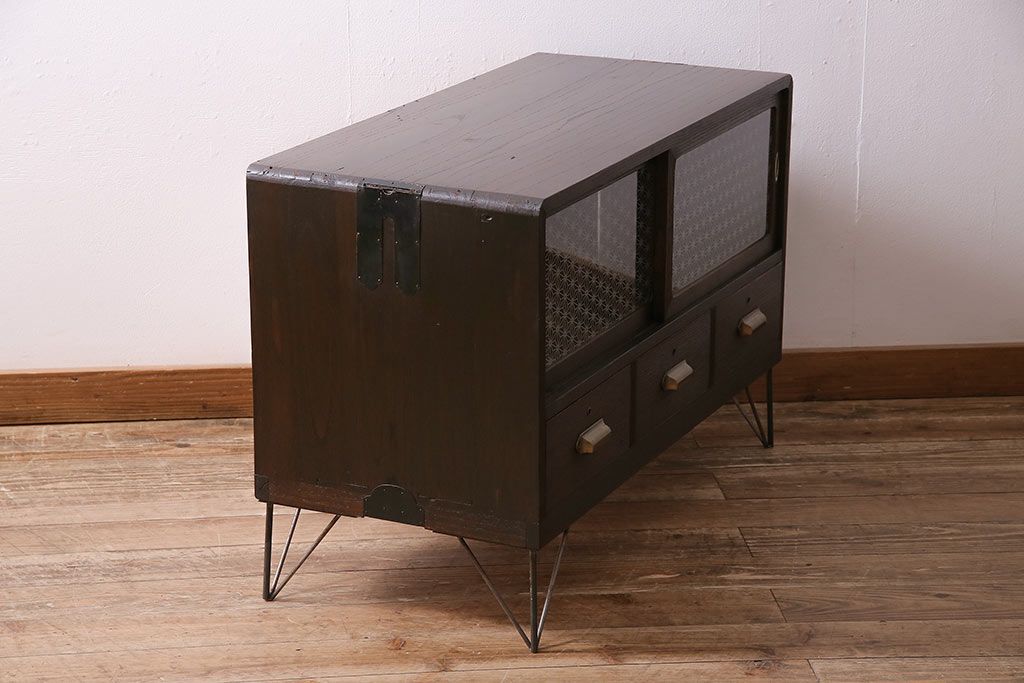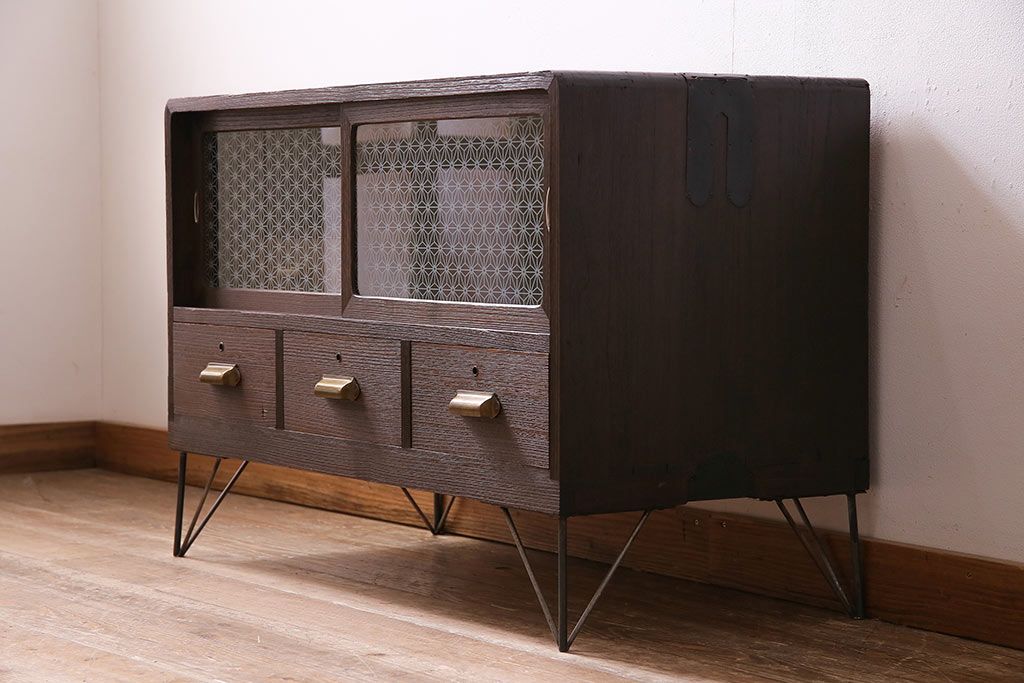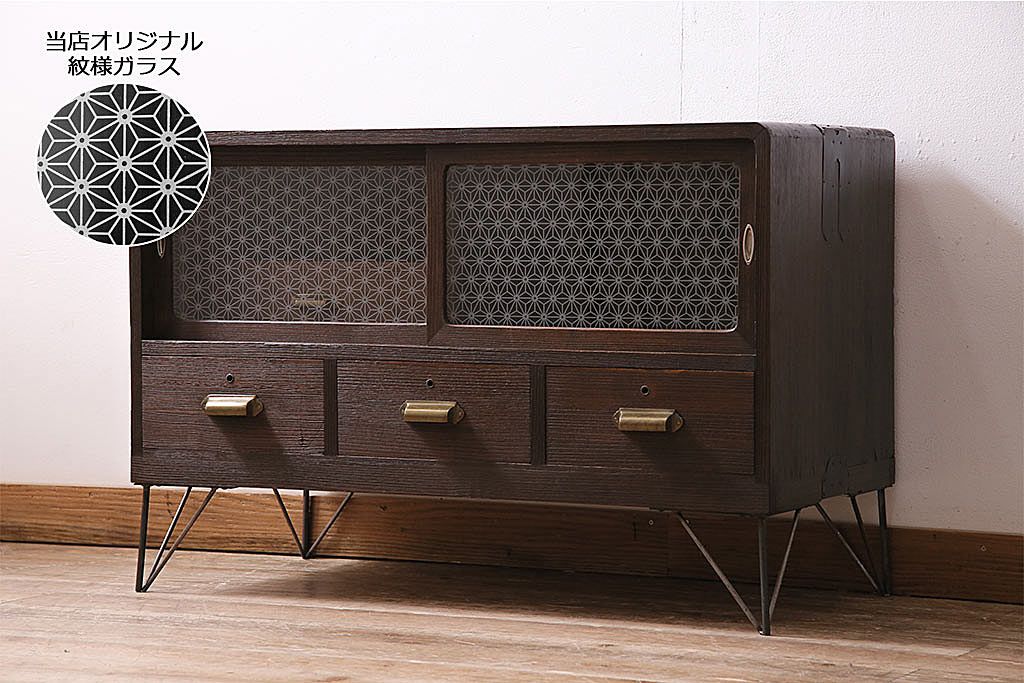 レトロ家具 当店オリジナルガラス 桐材 鉄脚付き 味のある雰囲気が魅力のリメイク箪笥ローボード(テレビ台、収納棚、リビングボード)(R-043895)