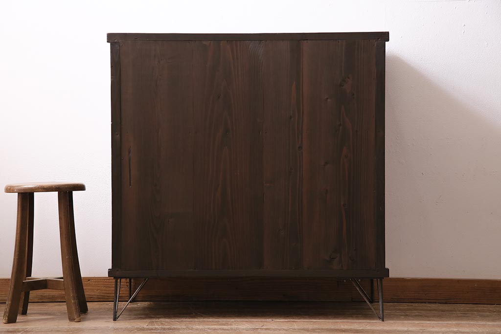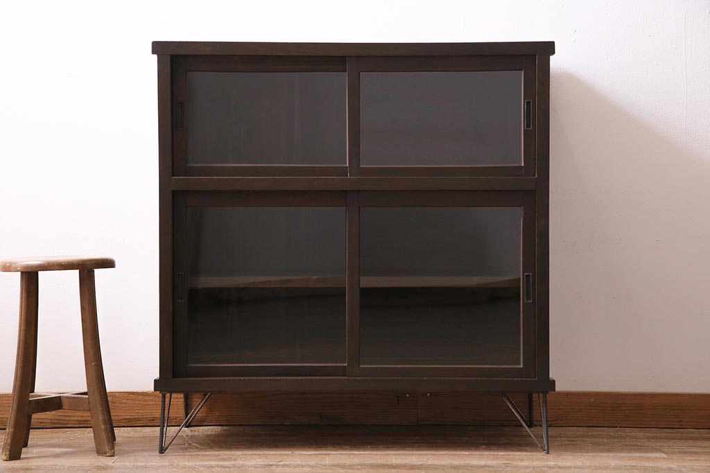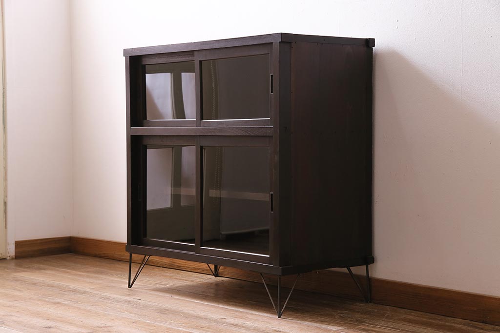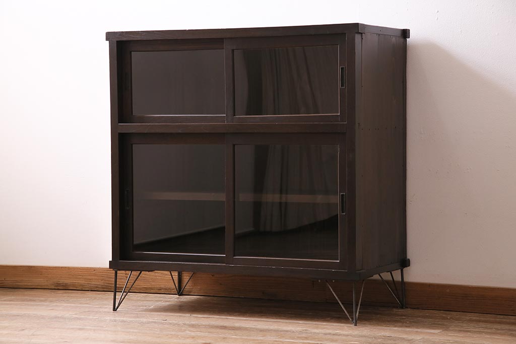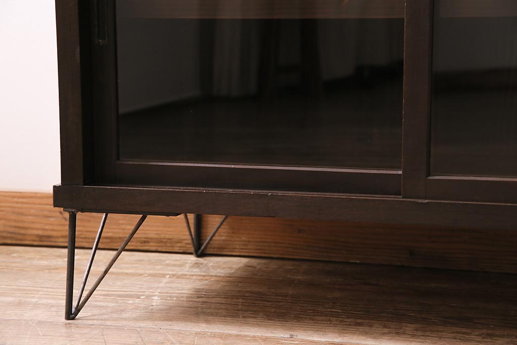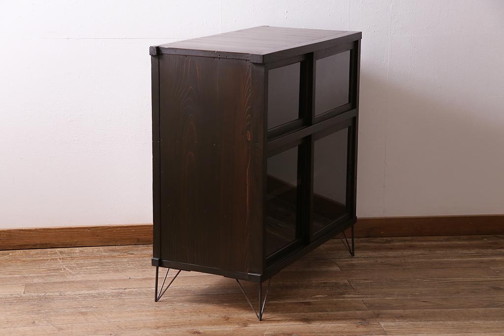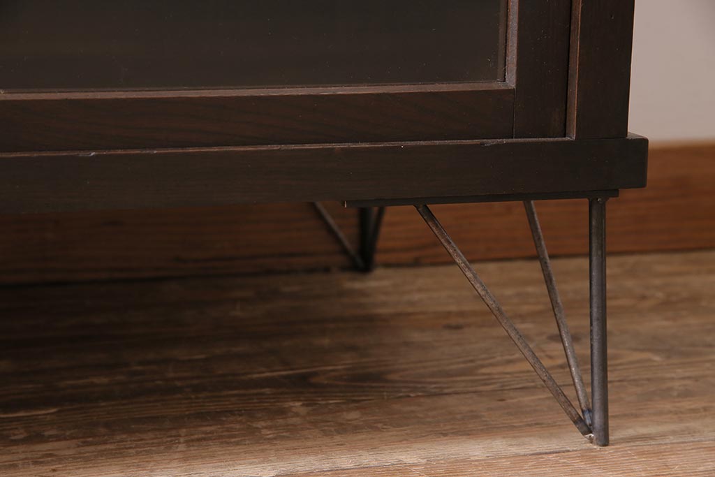 アンティーク家具 大正昭和初期 鉄脚付きリメイク 古い木の質感が味わい深いキャビネット(サイドボード、収納棚、ガラス戸棚)(R-043967)