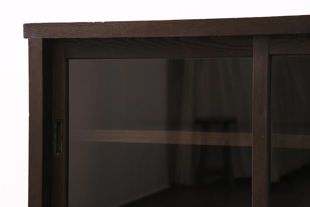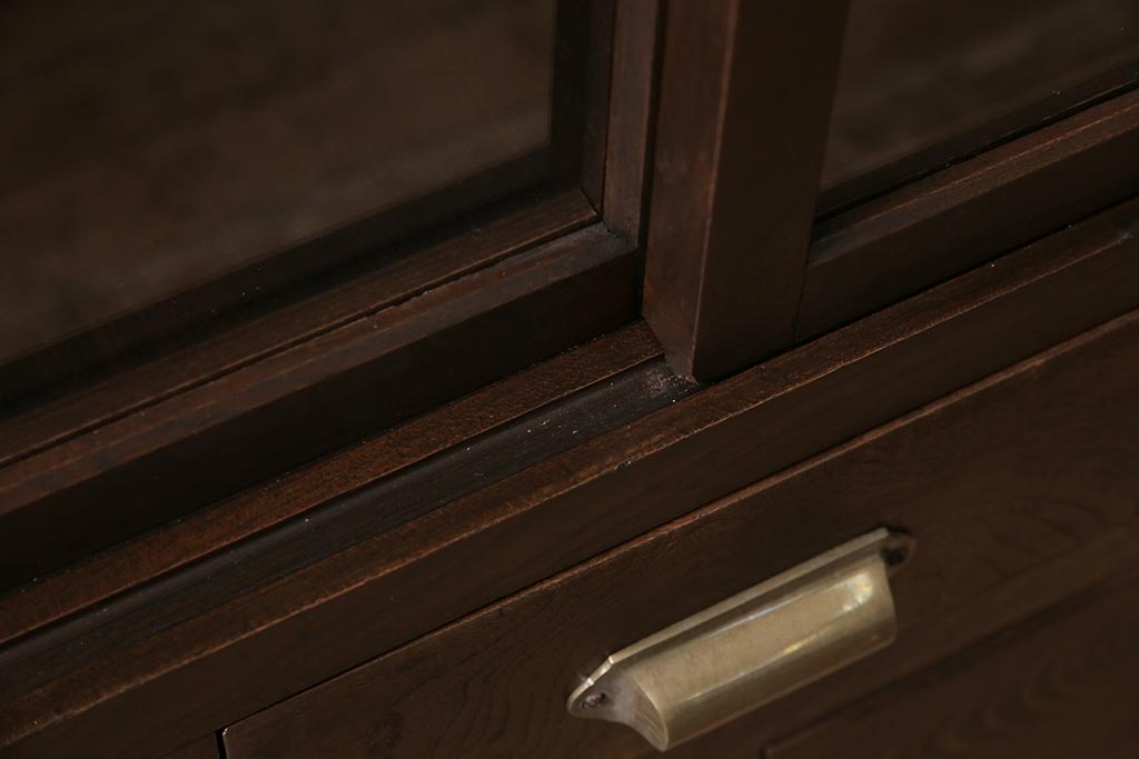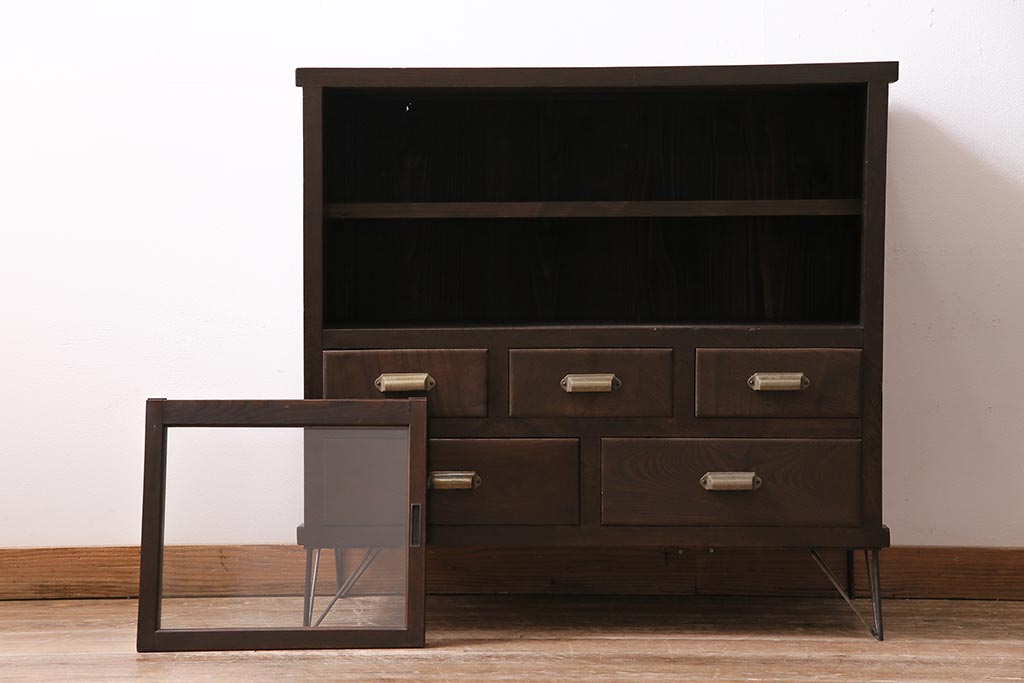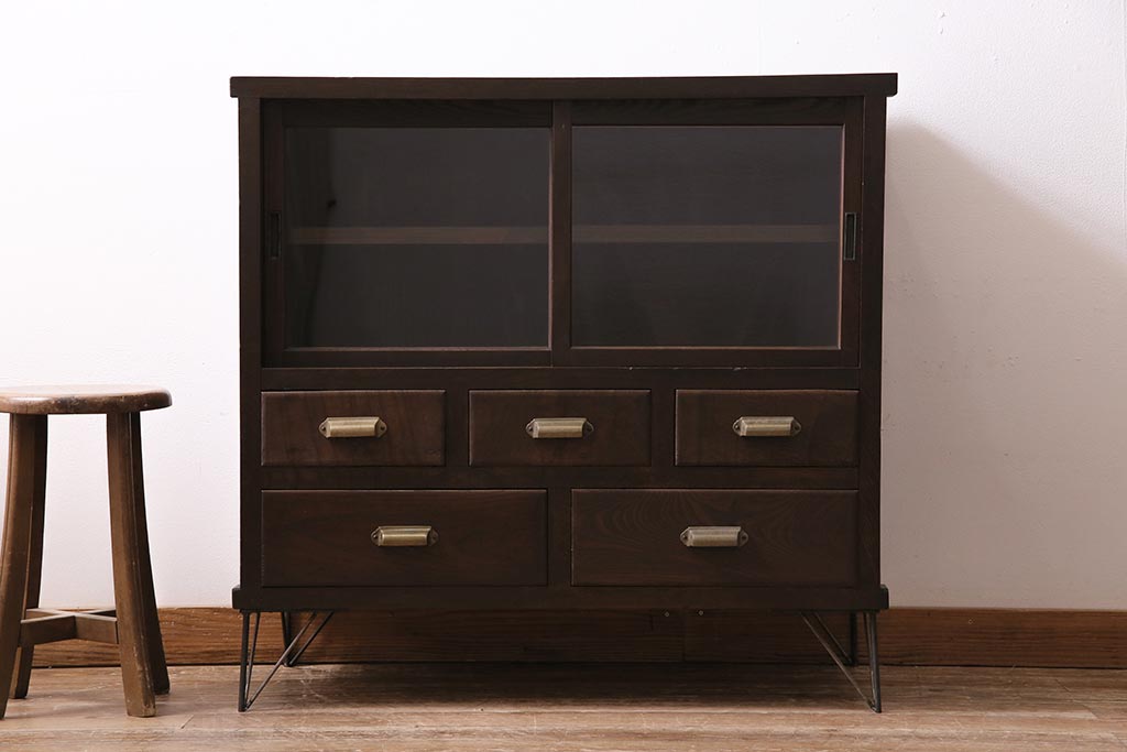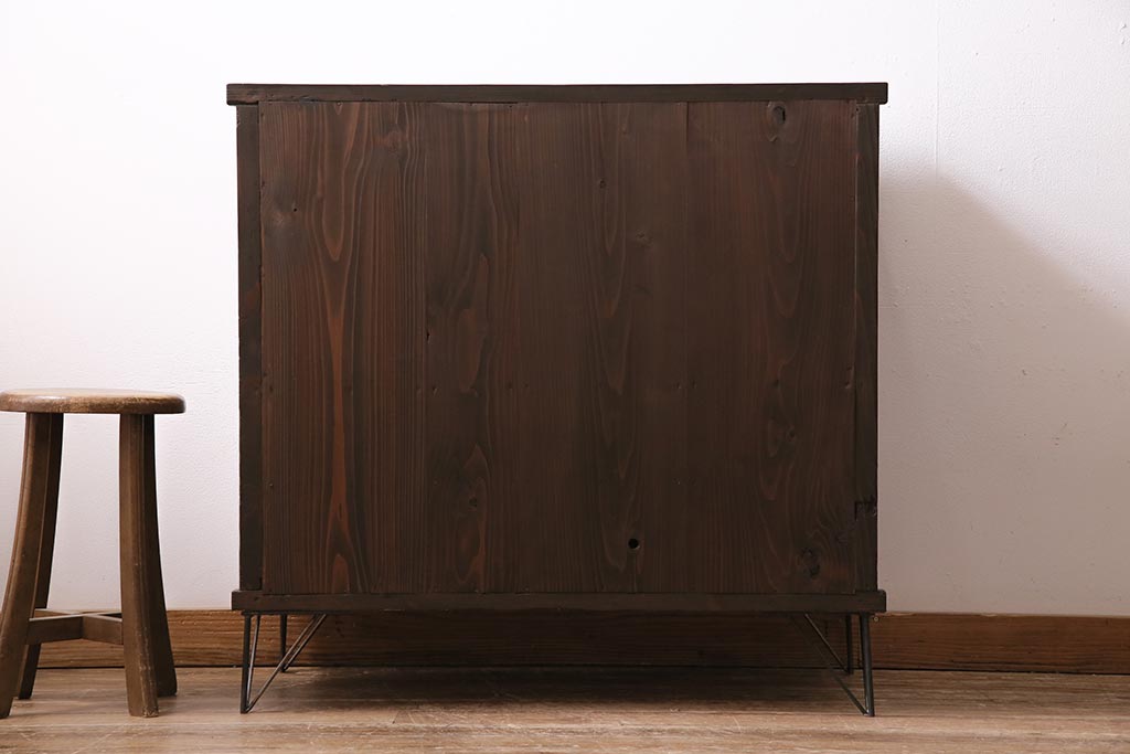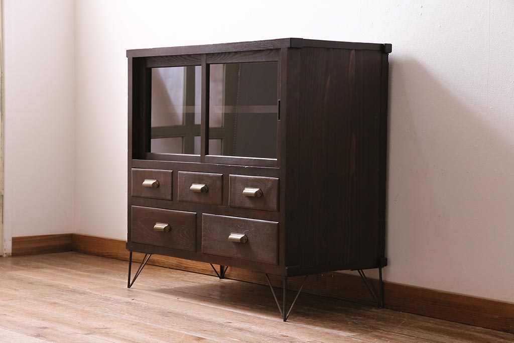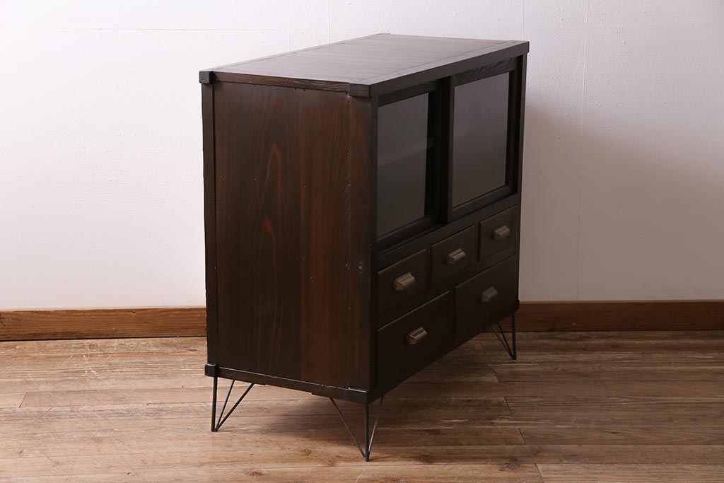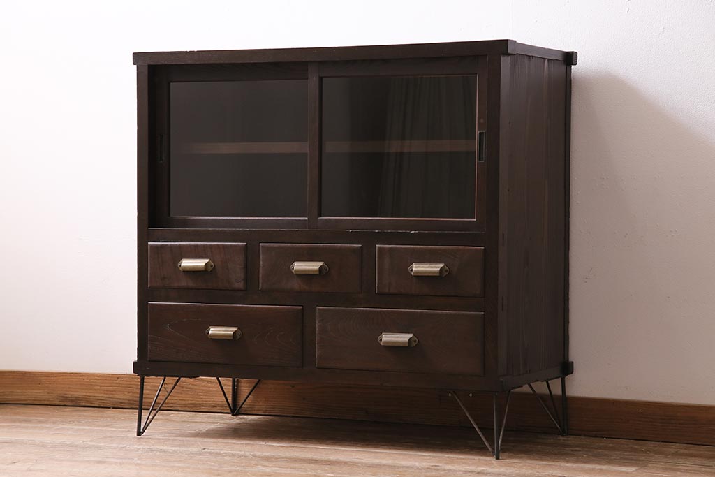 アンティーク家具 和製アンティーク ヒノキ材 レトロな雰囲気が魅力の鉄脚付き収納棚(ガラス戸棚、サイドボード、キャビネット)(R-043968)です。