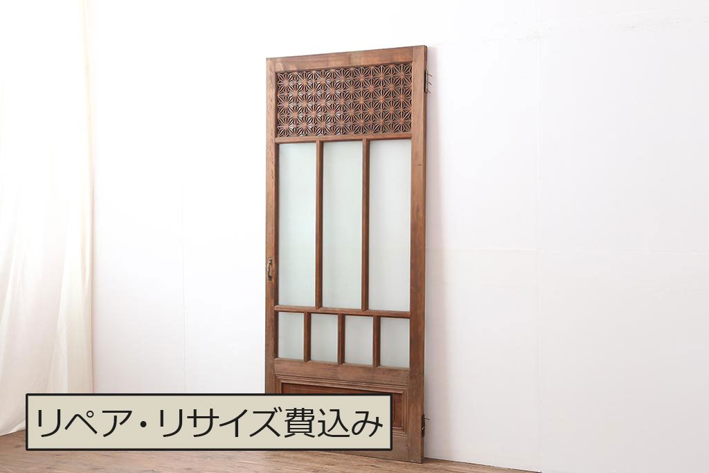 アンティーク建具 昭和中期 ヒノキ材・腰板ケヤキ材 上手物!角麻の組子細工がおしゃれな木製ドア(木製扉、ガラス扉、開き戸)(R-043971)