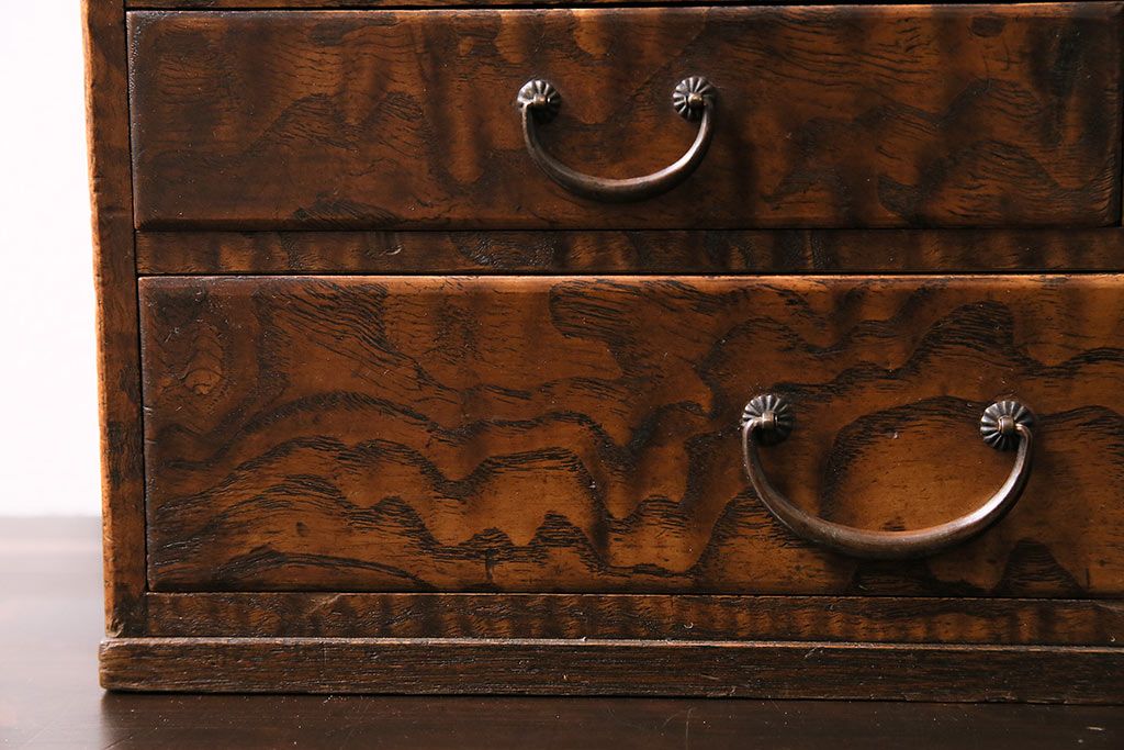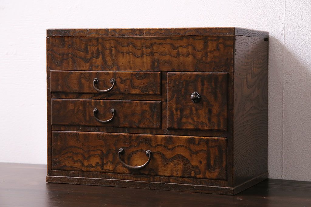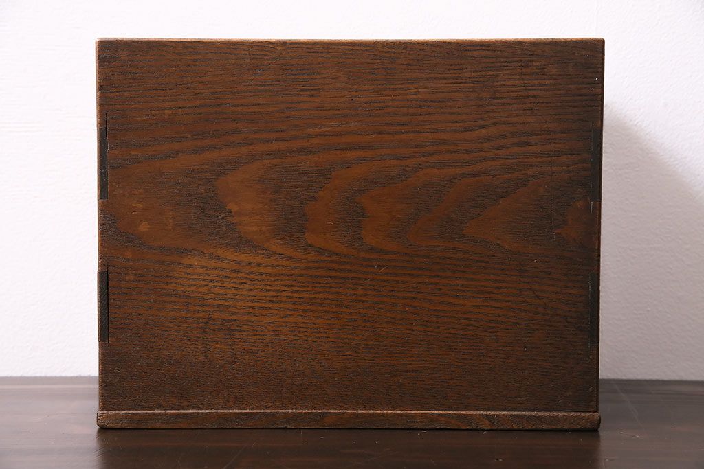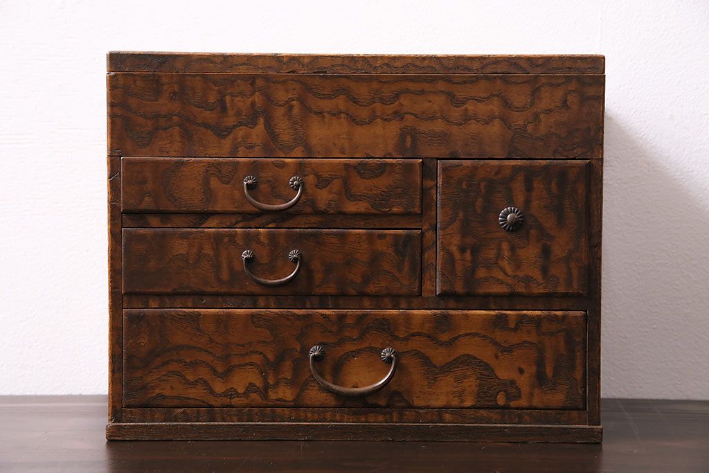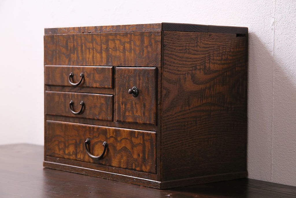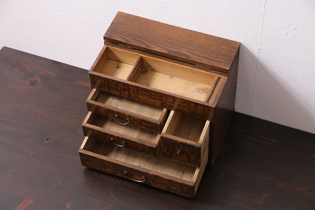 小物収納・トランク> 小引き出し > アンティーク家具 和製アンティーク 昭和中期 タモ材 波のような木目が美しい裁縫箱(ソーイングボックス、小引き出し、小物収納)(R-043906)
