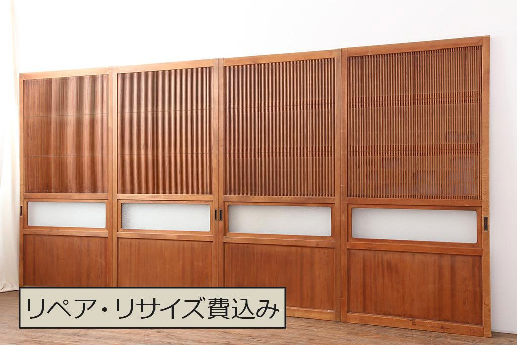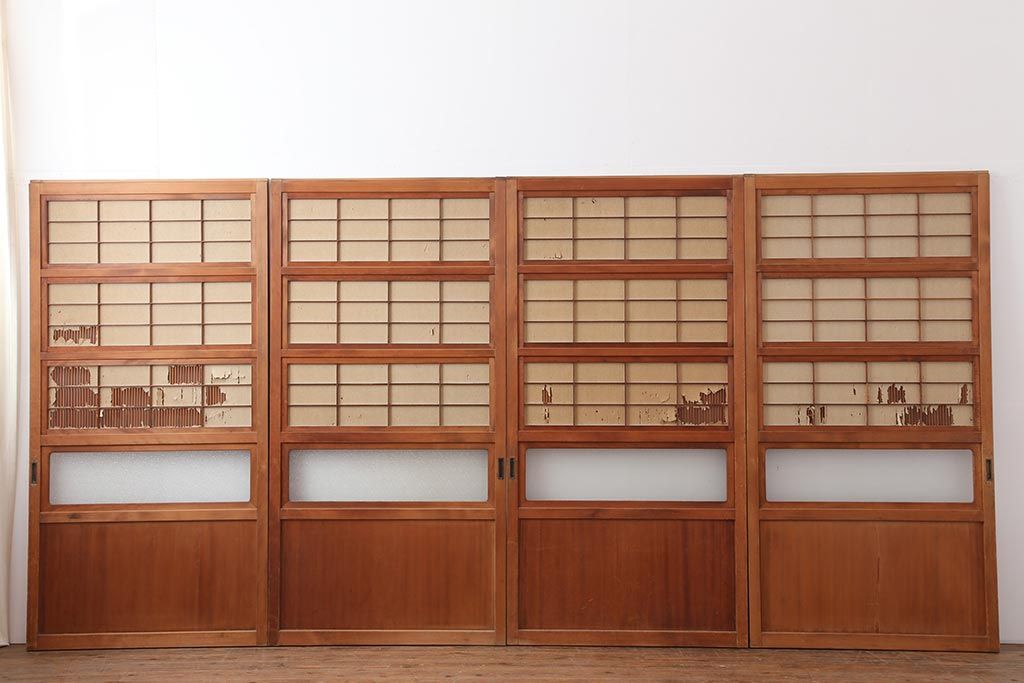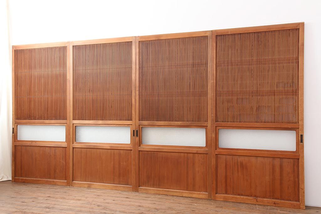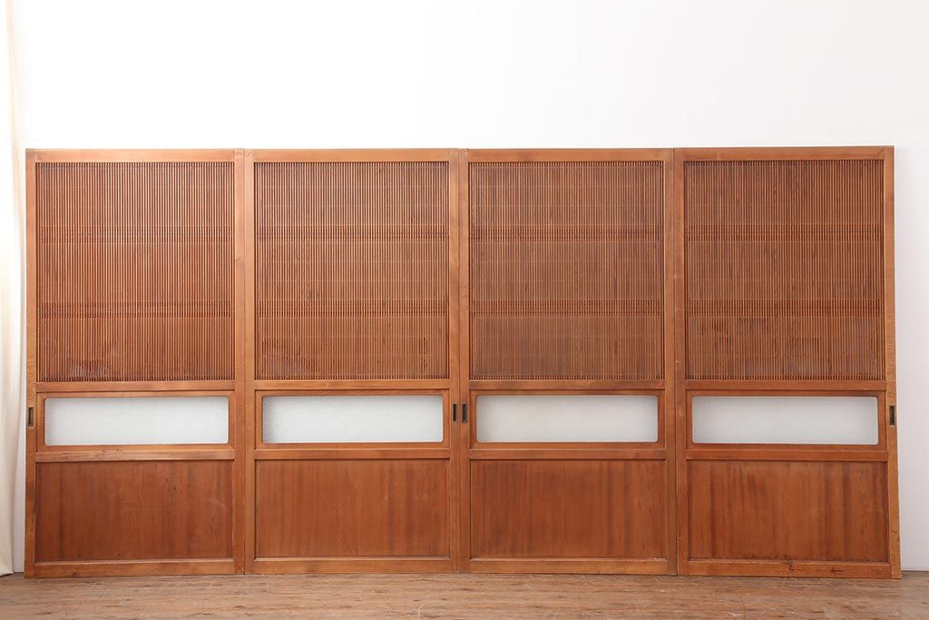 ドア・建具> 4枚〜セット > アンティーク建具 上手物 昭和初期 裏障子付き 万本格子戸4枚セット(帯ガラス戸、引き戸)(R-044082)
