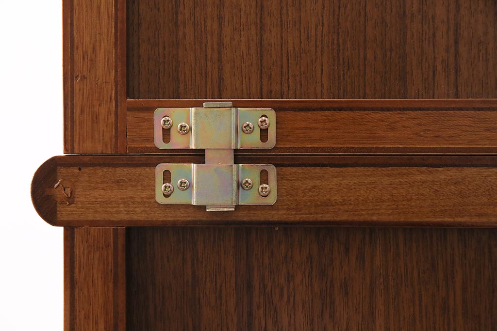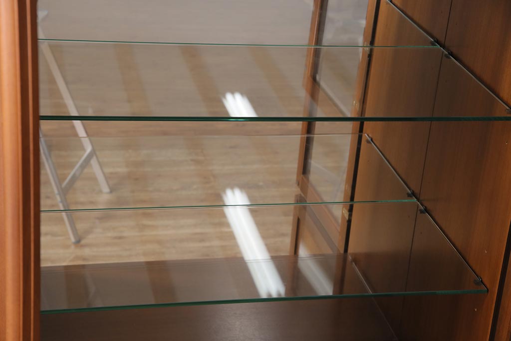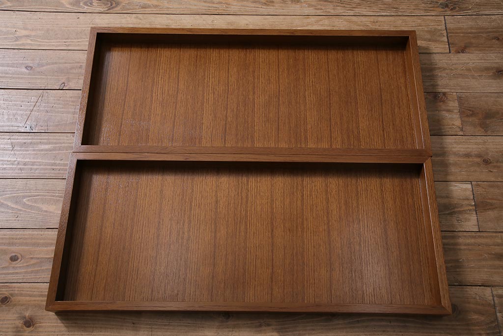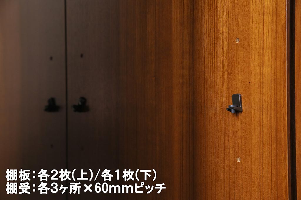 棚板は取り外しできます。棚板は上段各2枚・下段各1枚あります。棚受けは各3ヶ所、60mmピッチで調整できます。棚幅サイズのものが1枚の作りです。