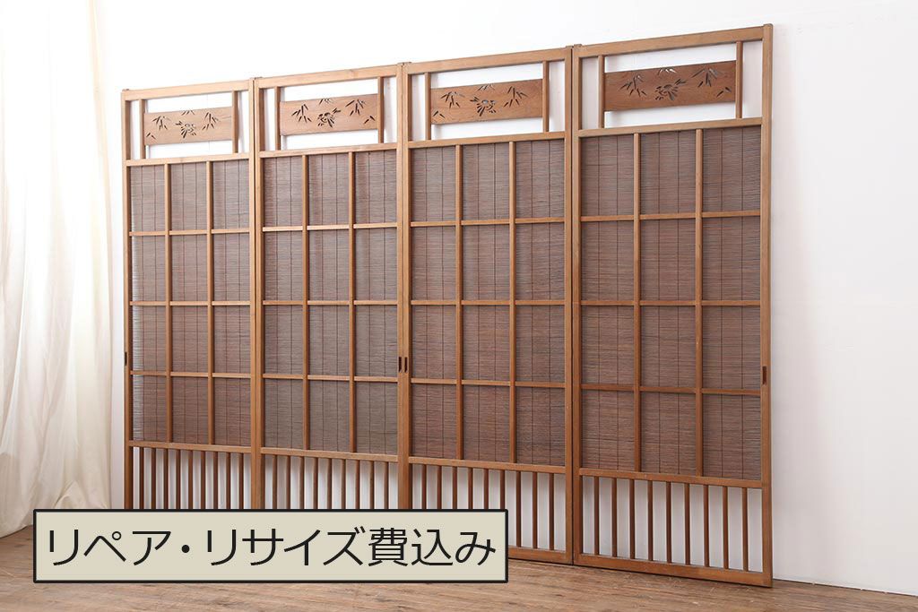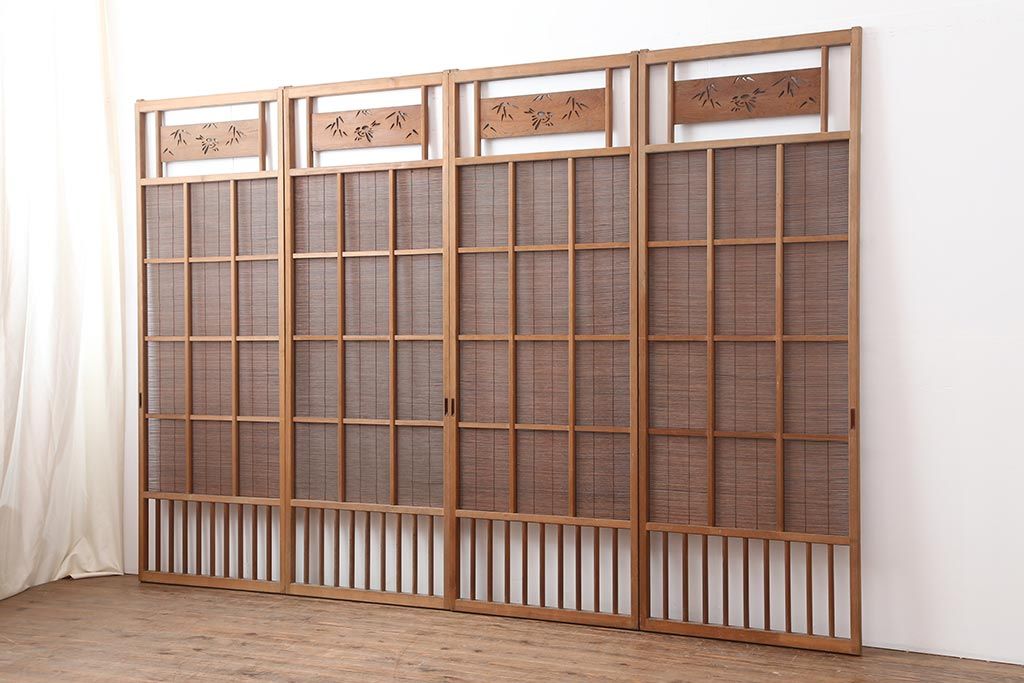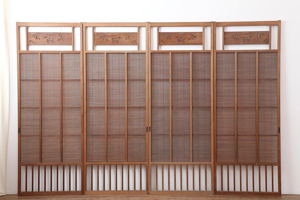 アンティーク建具 昭和中期 竹に雀の透かし彫りが風情のある御簾戸4枚セット(簾戸、簀戸、葭戸、夏障子、夏戸、葦戸)(R-044047)