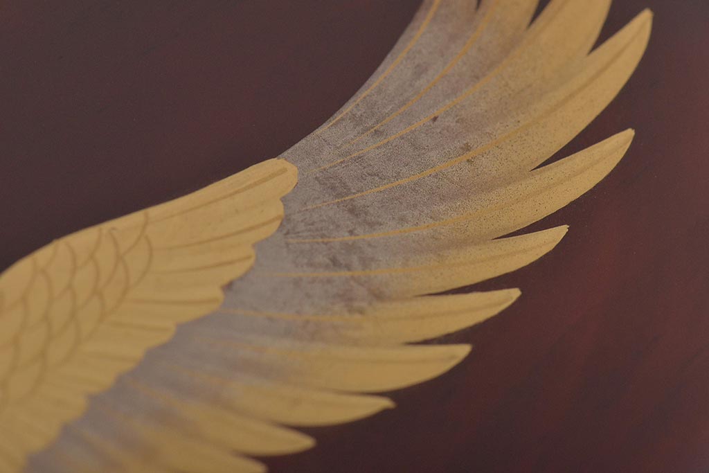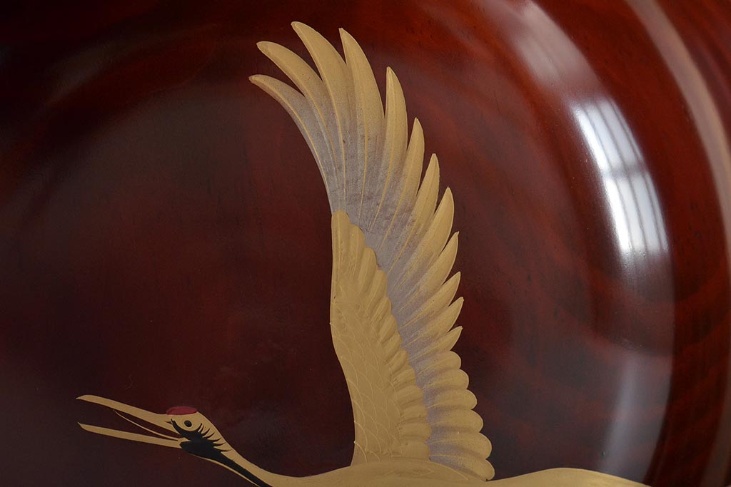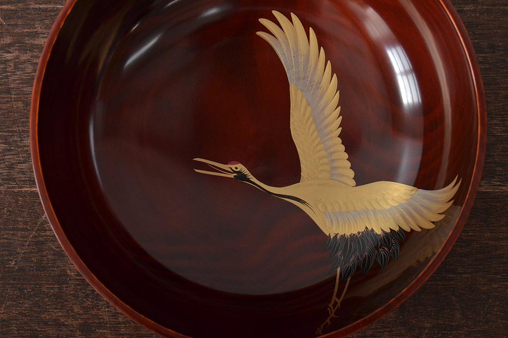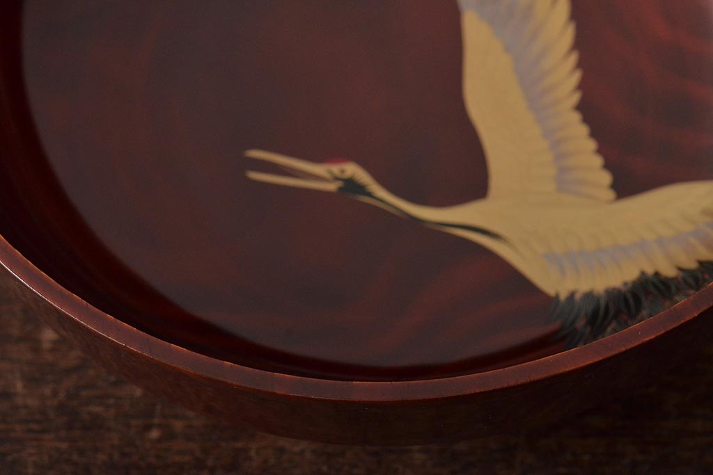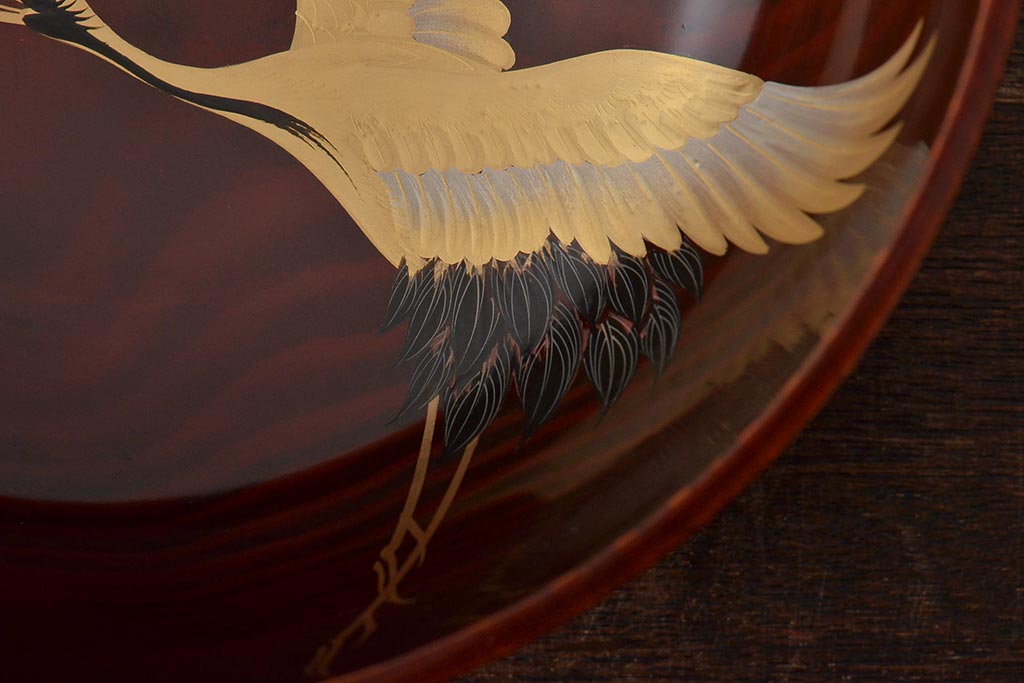 アンティーク雑貨 昭和初期 鶴蒔絵 木製菓子器(漆器)(R-043460)