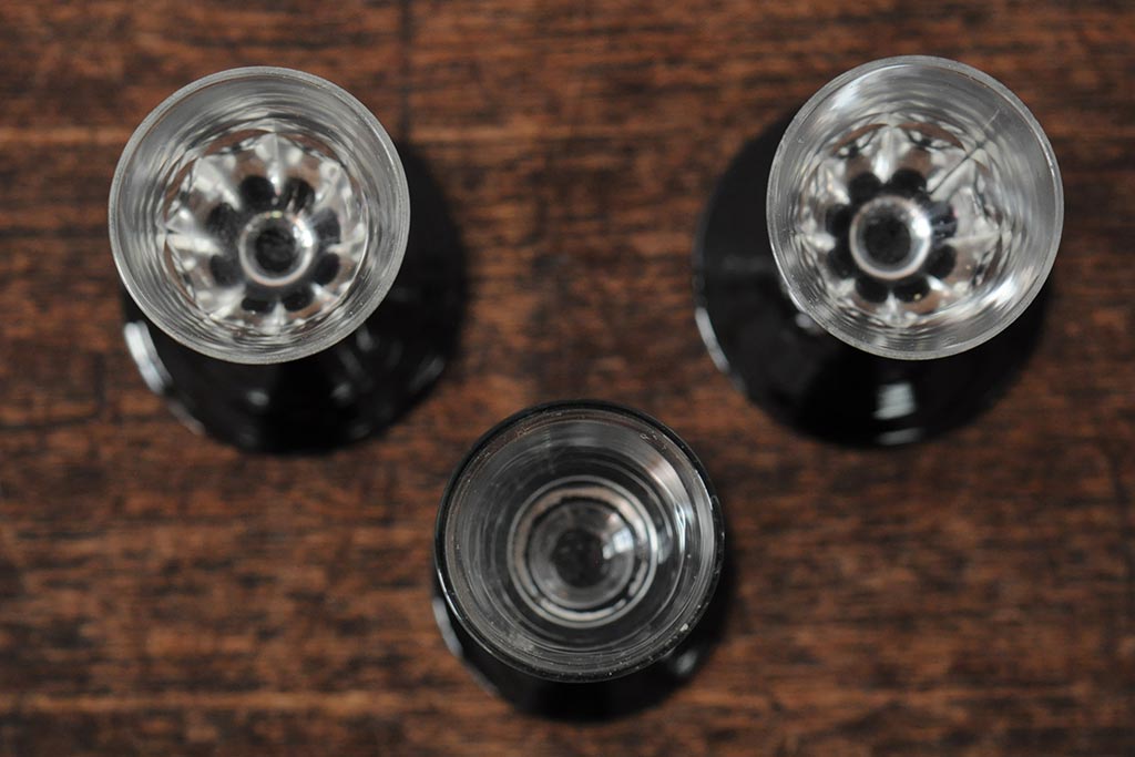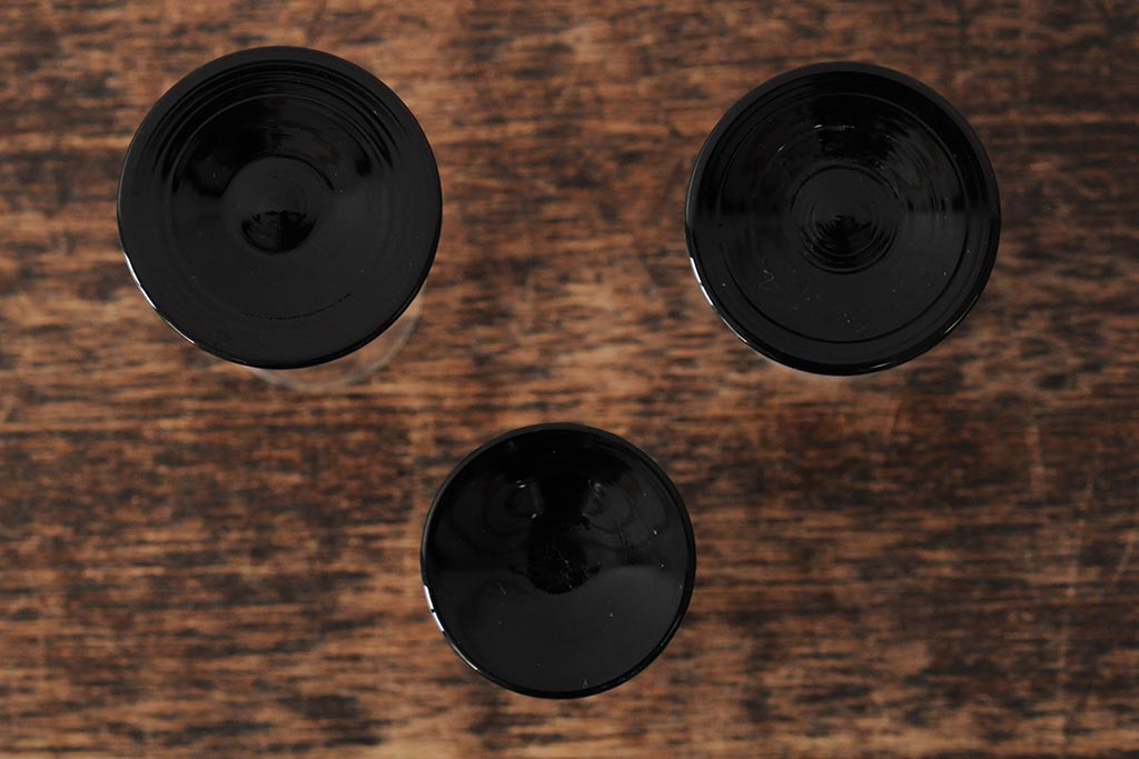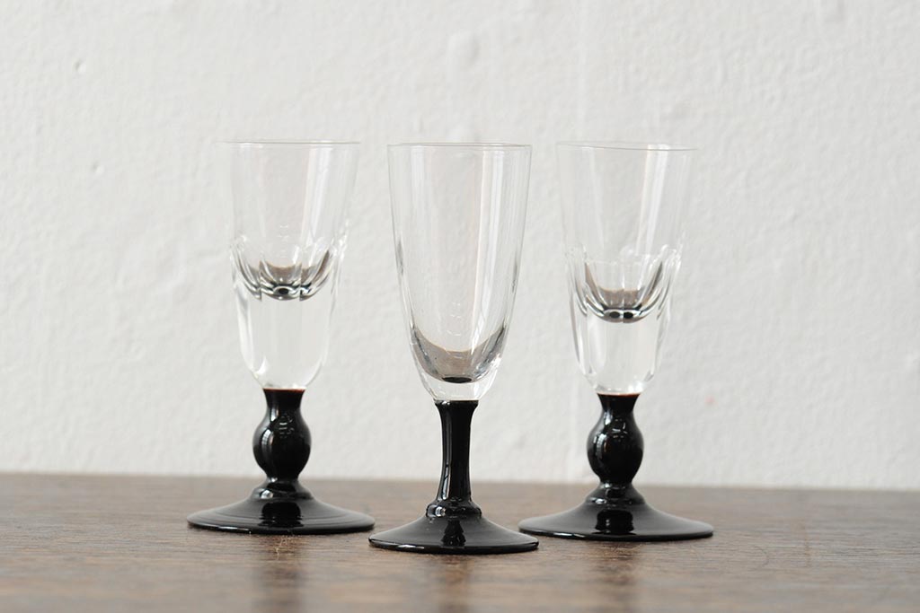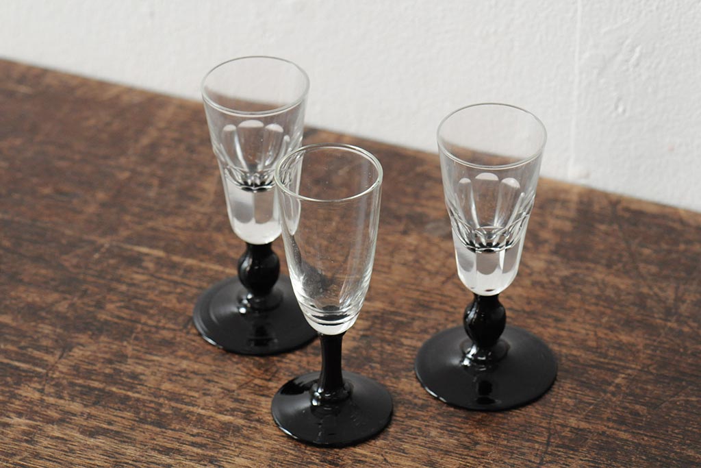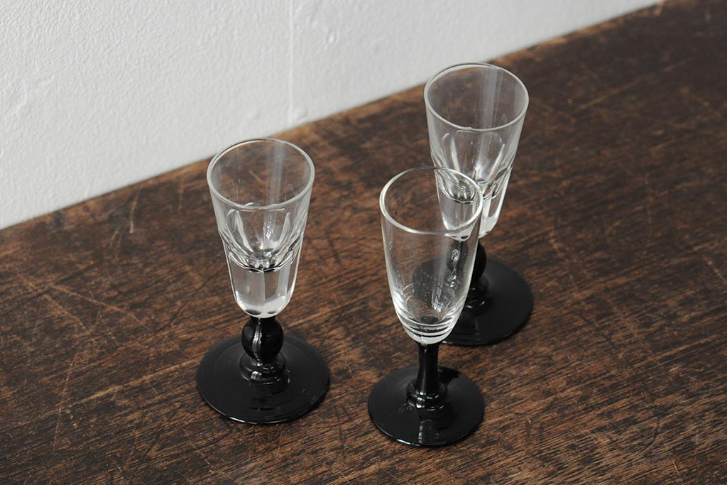 ラフジュ工房> 骨董・美術品> 骨董-ガラス食器 > 大正期 黒エナメル足 リキュールグラス3客セット(和ガラス、酒器)(R-043728)