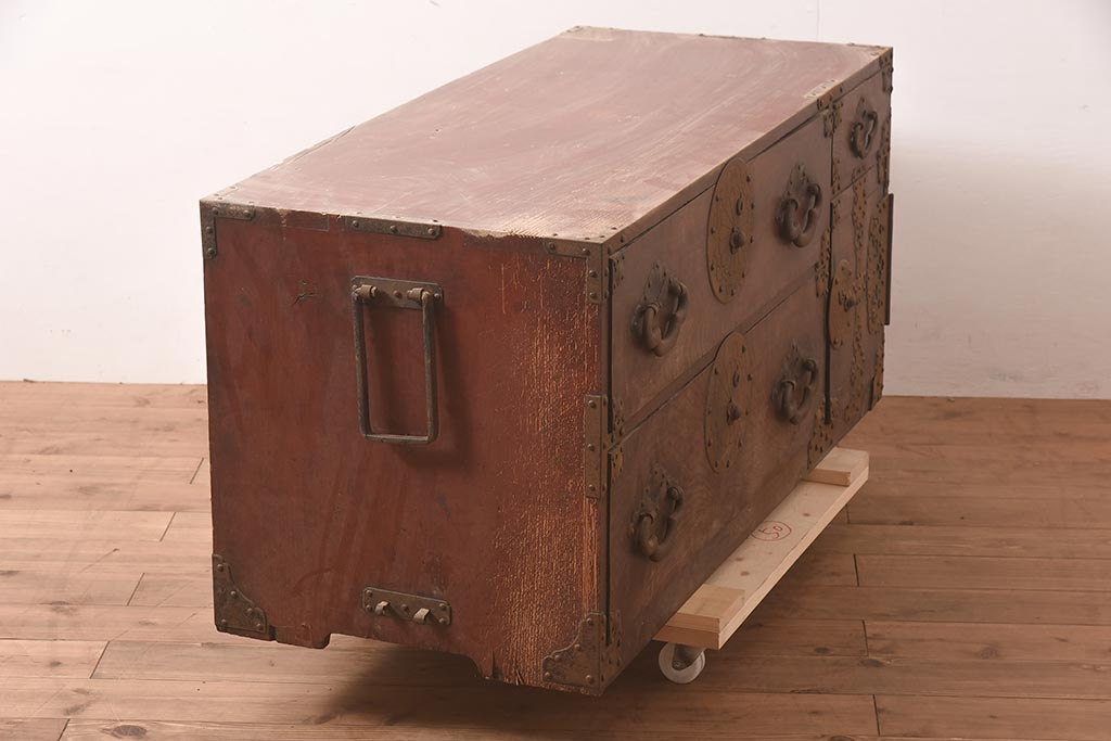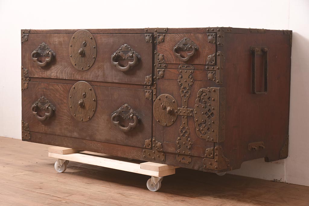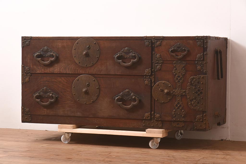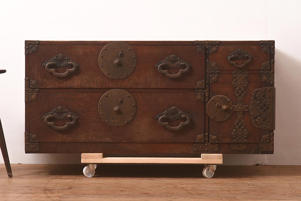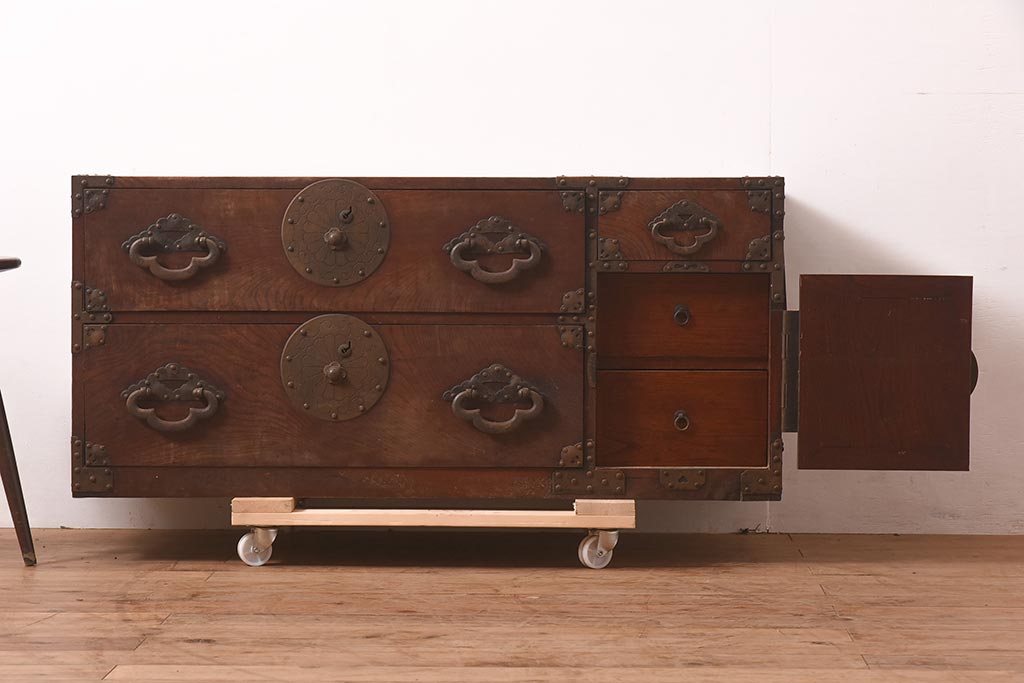 和箪笥> 衣装箪笥 > アンティーク家具 明治期 前面欅材共縁 上手金具 美しい杢目の米沢箪笥ローボード(時代箪笥、衣装箪笥、テレビ台)(R-044061)