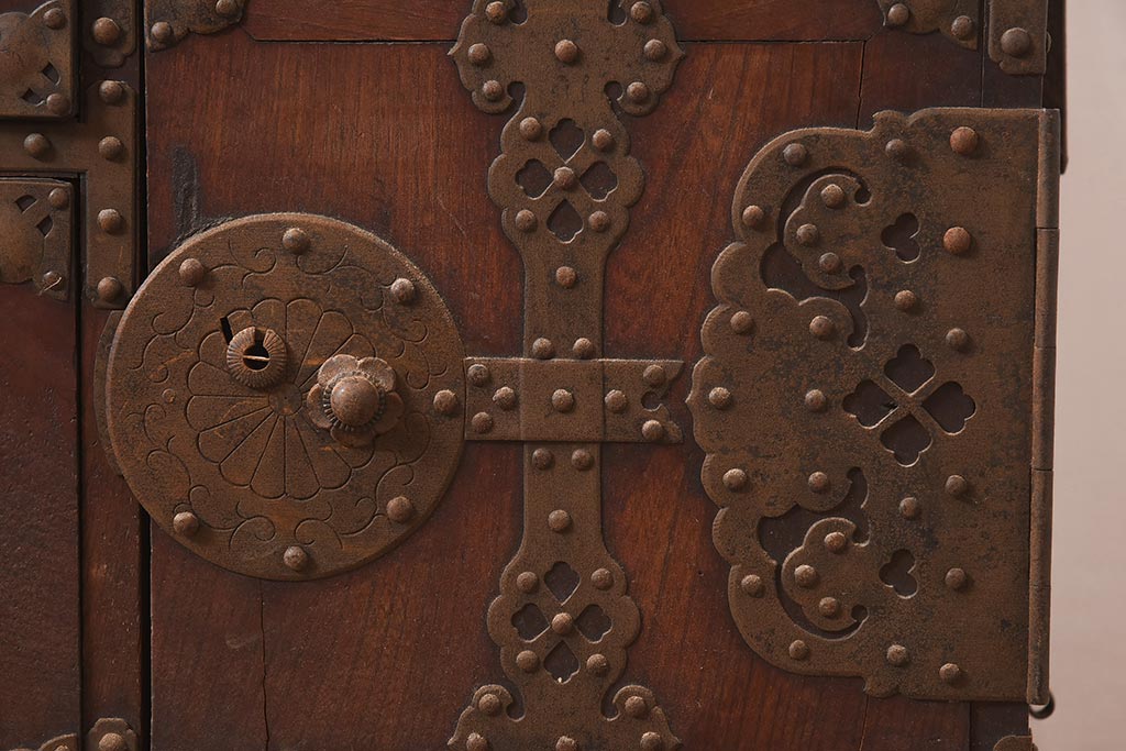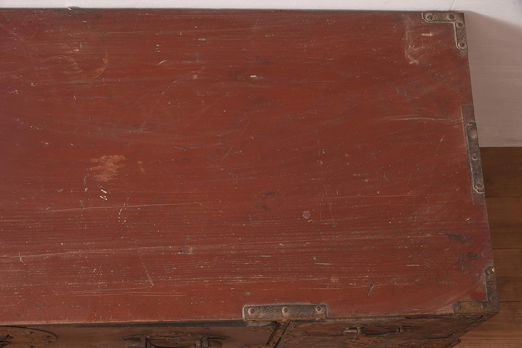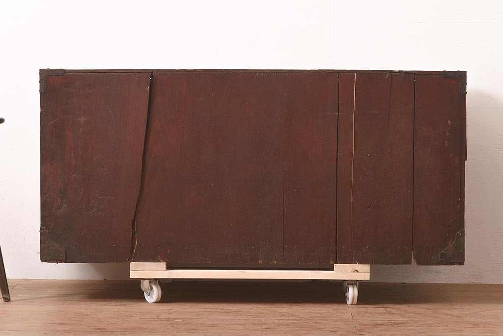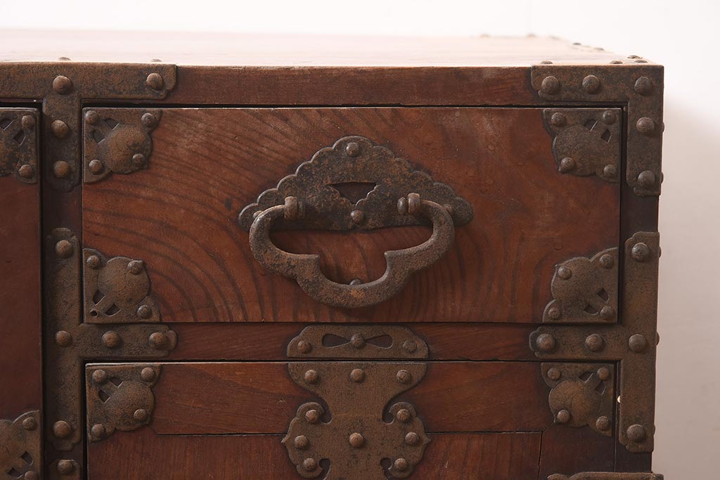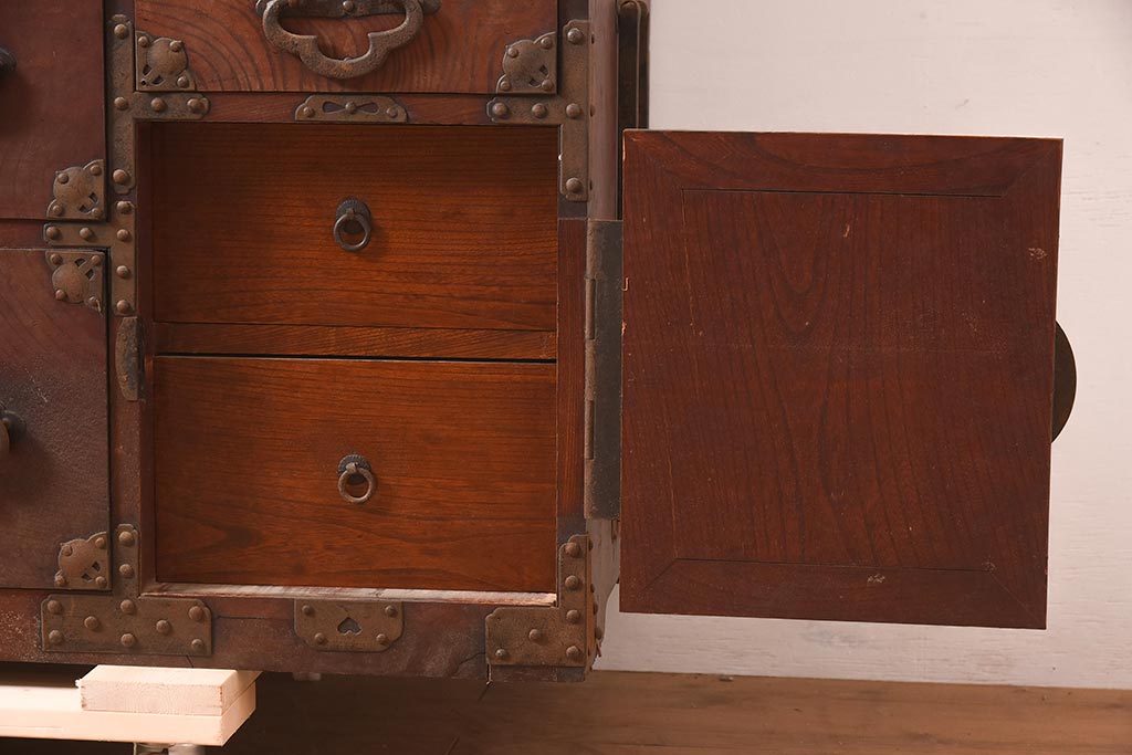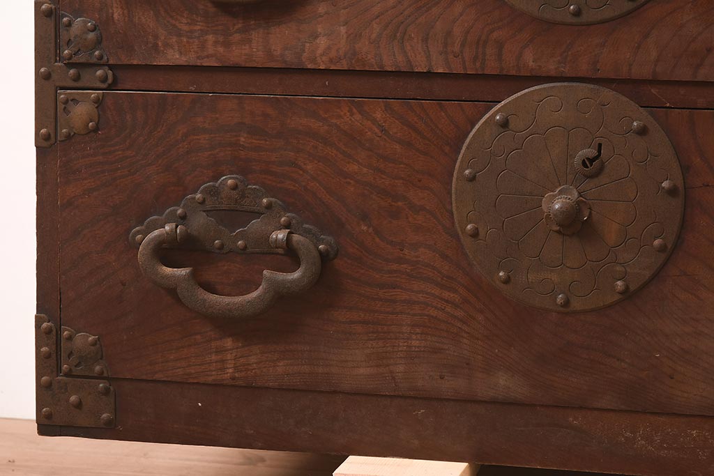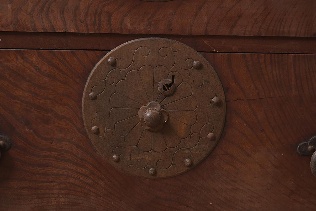 和箪笥 > アンティーク家具 明治期 前面欅材共縁 上手金具 美しい杢目の米沢箪笥ローボード(時代箪笥、衣装箪笥、テレビ台)(R-044061)