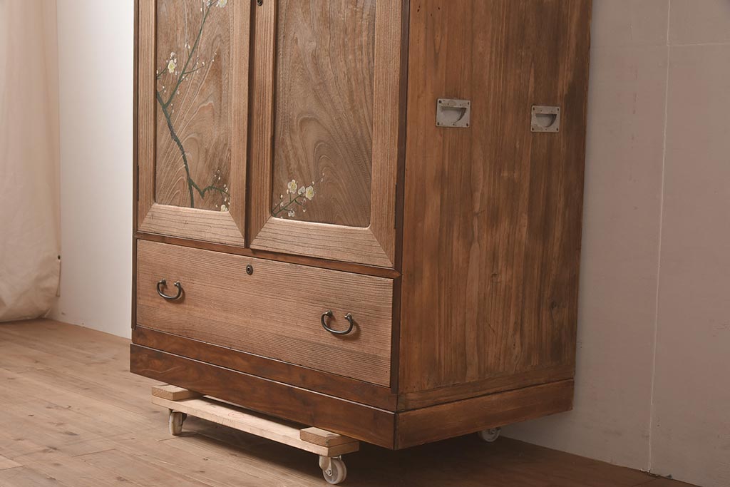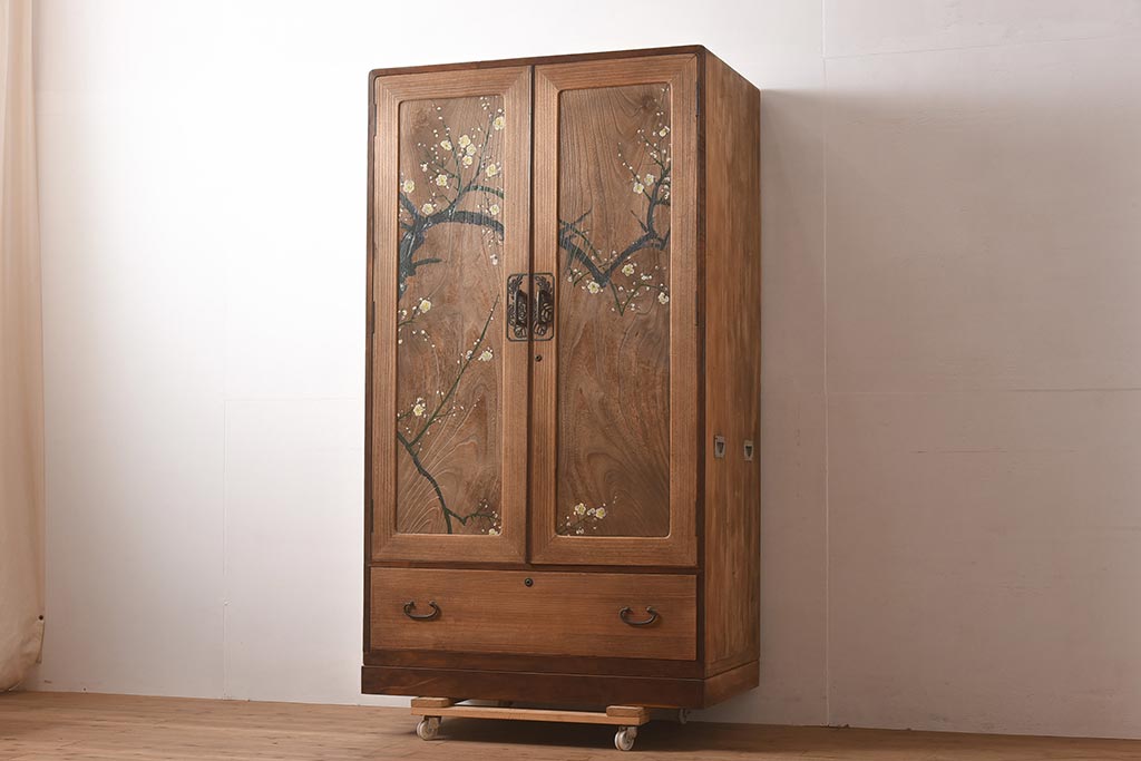 ビンテージ家具 昭和中期 総桐材・縁桑材 梅の図が目を引くワードローブ(洋服箪笥)(R-044035)です。