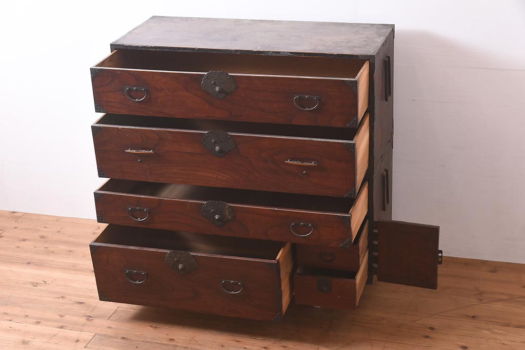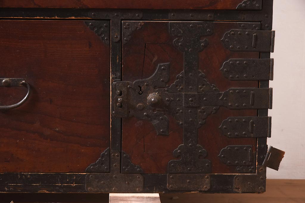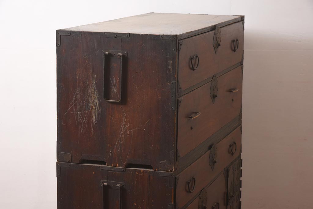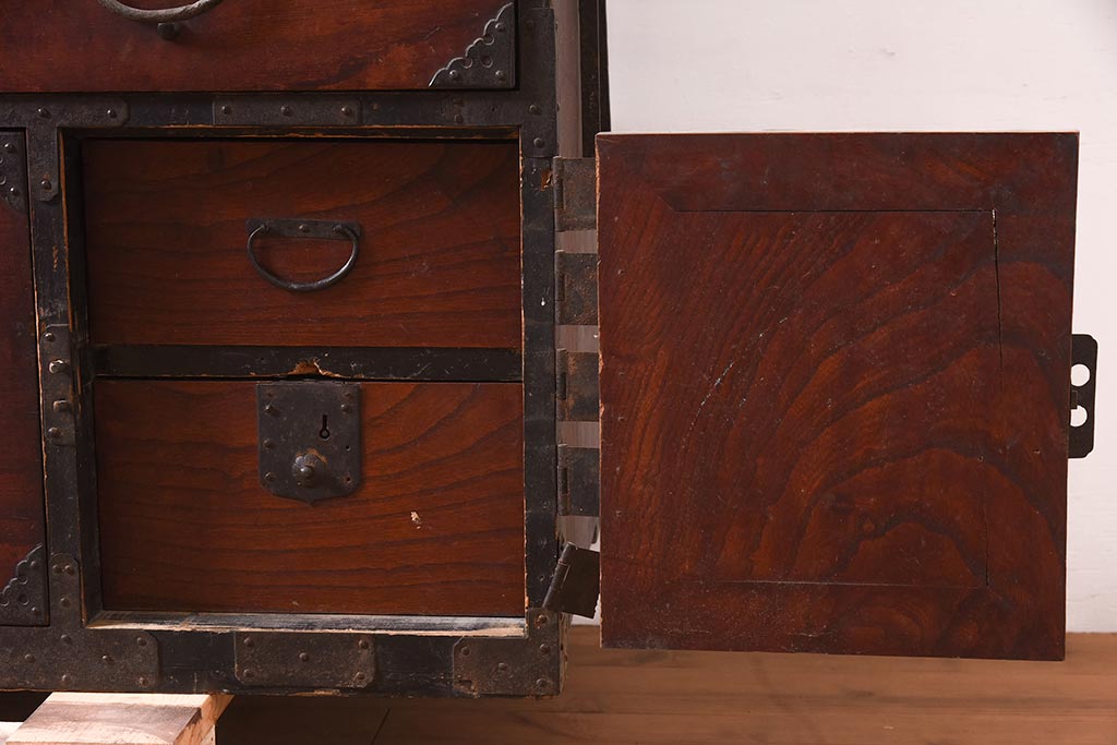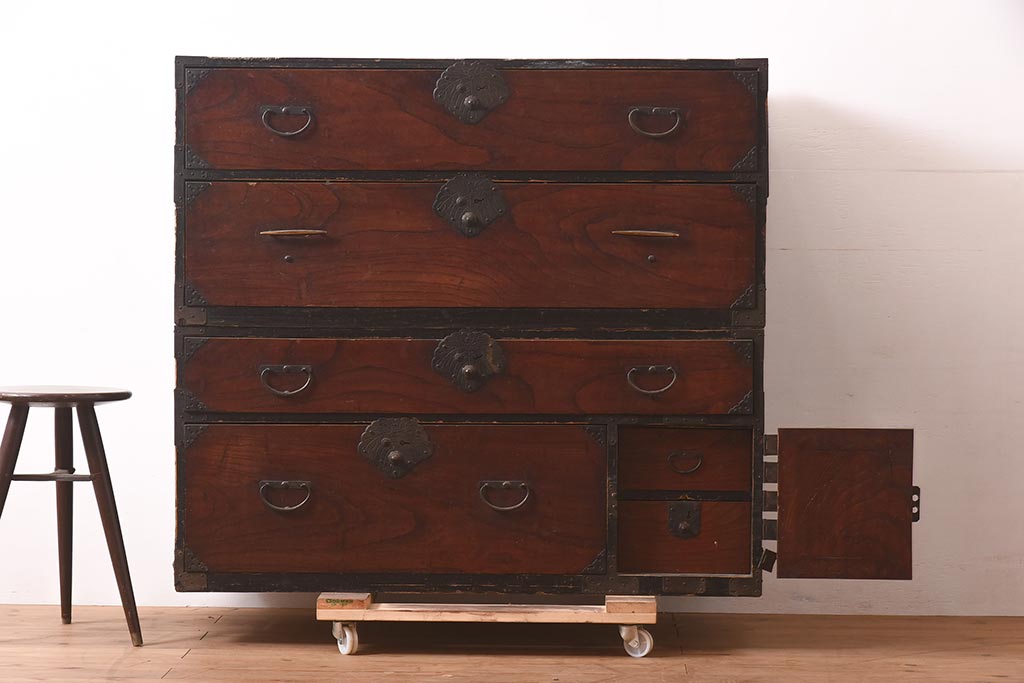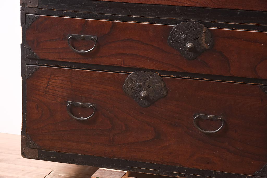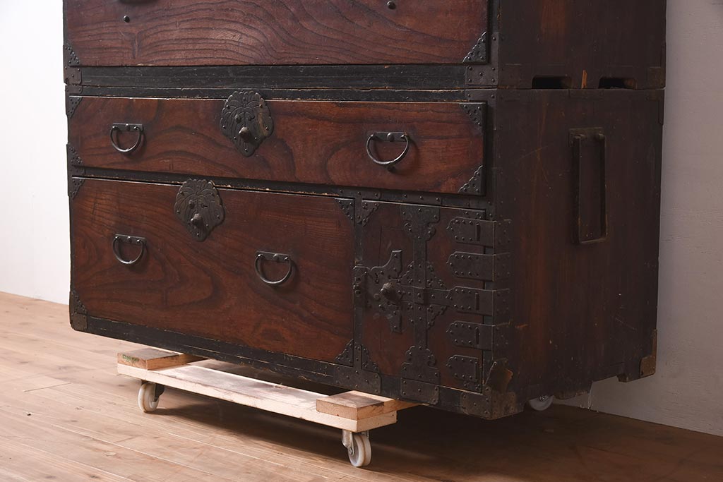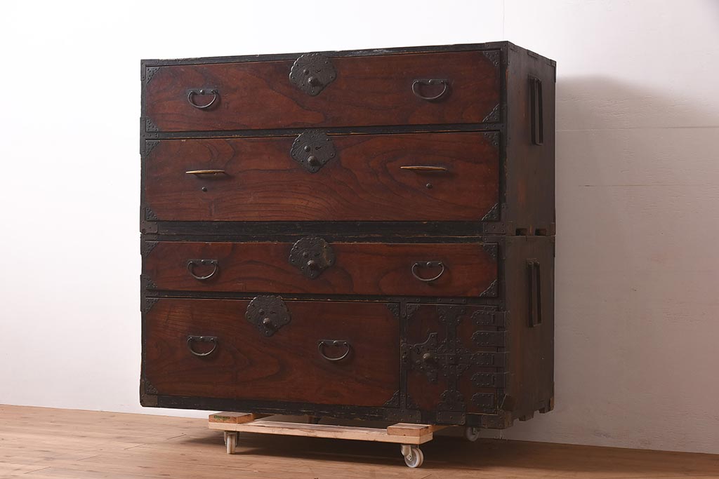 アンティーク家具 明治期 前面ケヤキ材 古い質感が味わい深い重ね箪笥(引き出し、衣装箪笥)(R-043600)